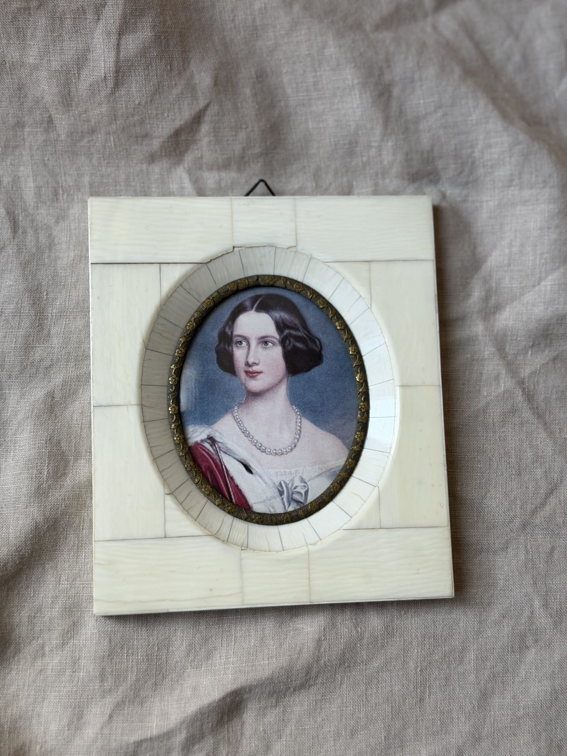 A delicate small portrait print of Marie of Prussia, after Joseph Karl Stieler. The piece is framed with a gilt floral motif and features an element marked as “genuine ivory”. This charming portrait evokes the elegance of 19th-century European portraiture and would look lovely hanging alone or grouped with other miniature portraits.