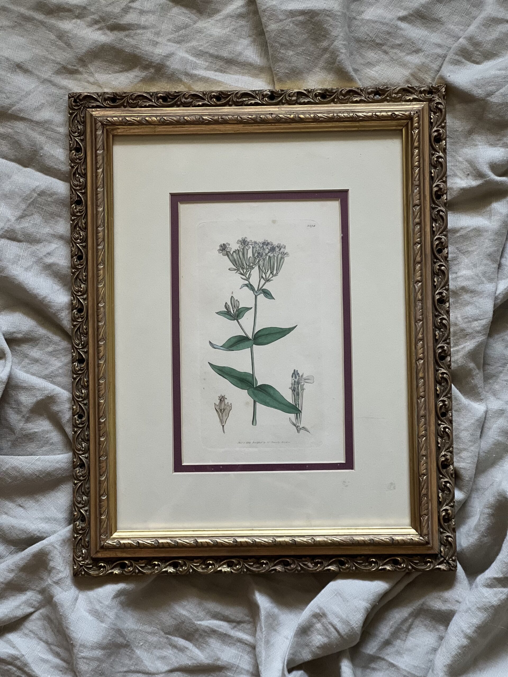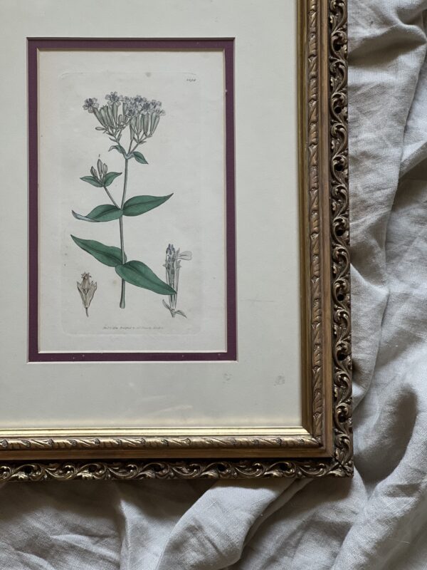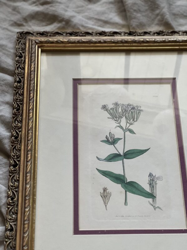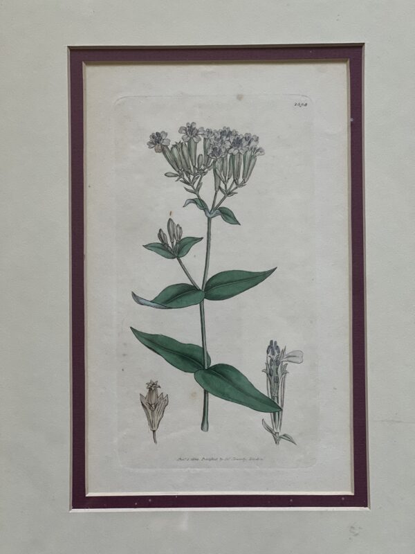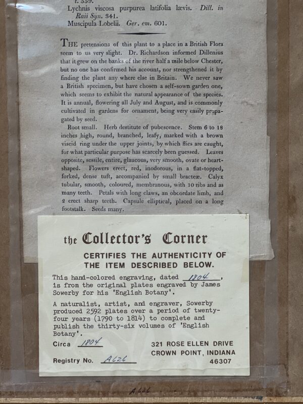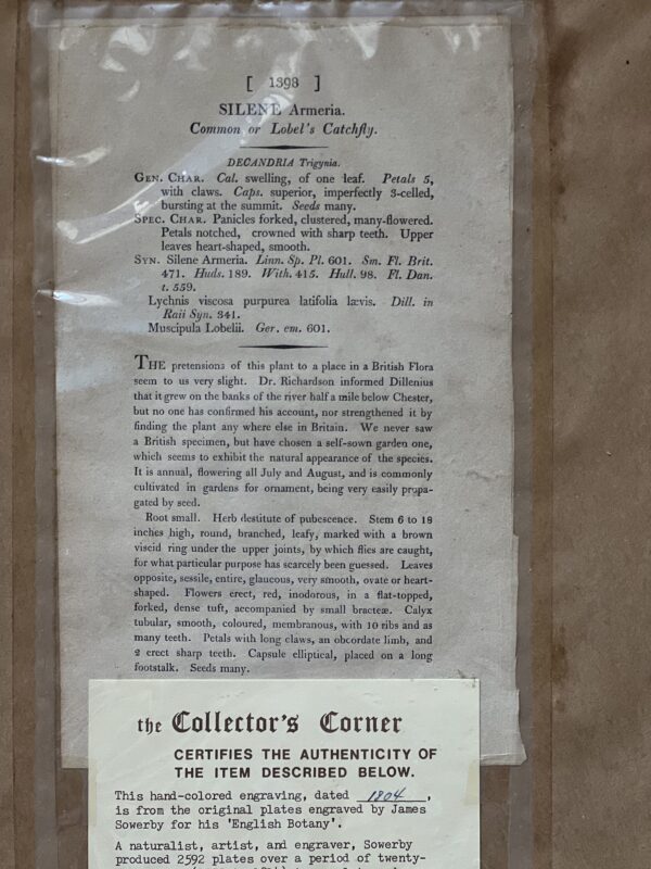 Beautiful hand colored engraving of a Common or Lobel’s Catchfly by James Sowerby, dating from 1805. On the back reads, “This hand colored engraving, dated 1804, is from the original plates engraved by James Sowerby from his ‘English Botany’. A naturalist, artist, and engraver, Sowerby produced 2592 plates over a period of 24 years (1790-1814) to complete and publish the 36 volumes of ‘English Botany'”.