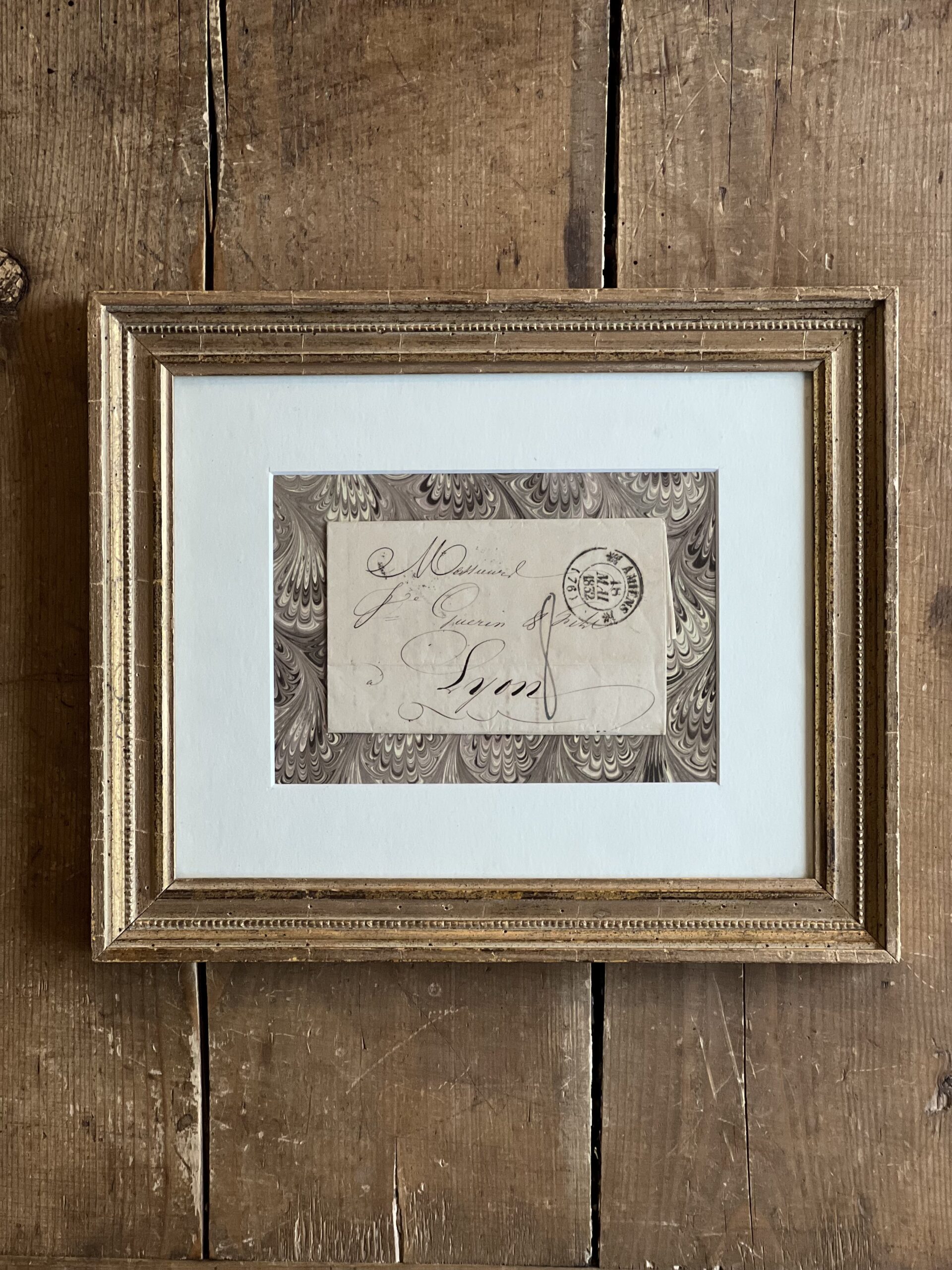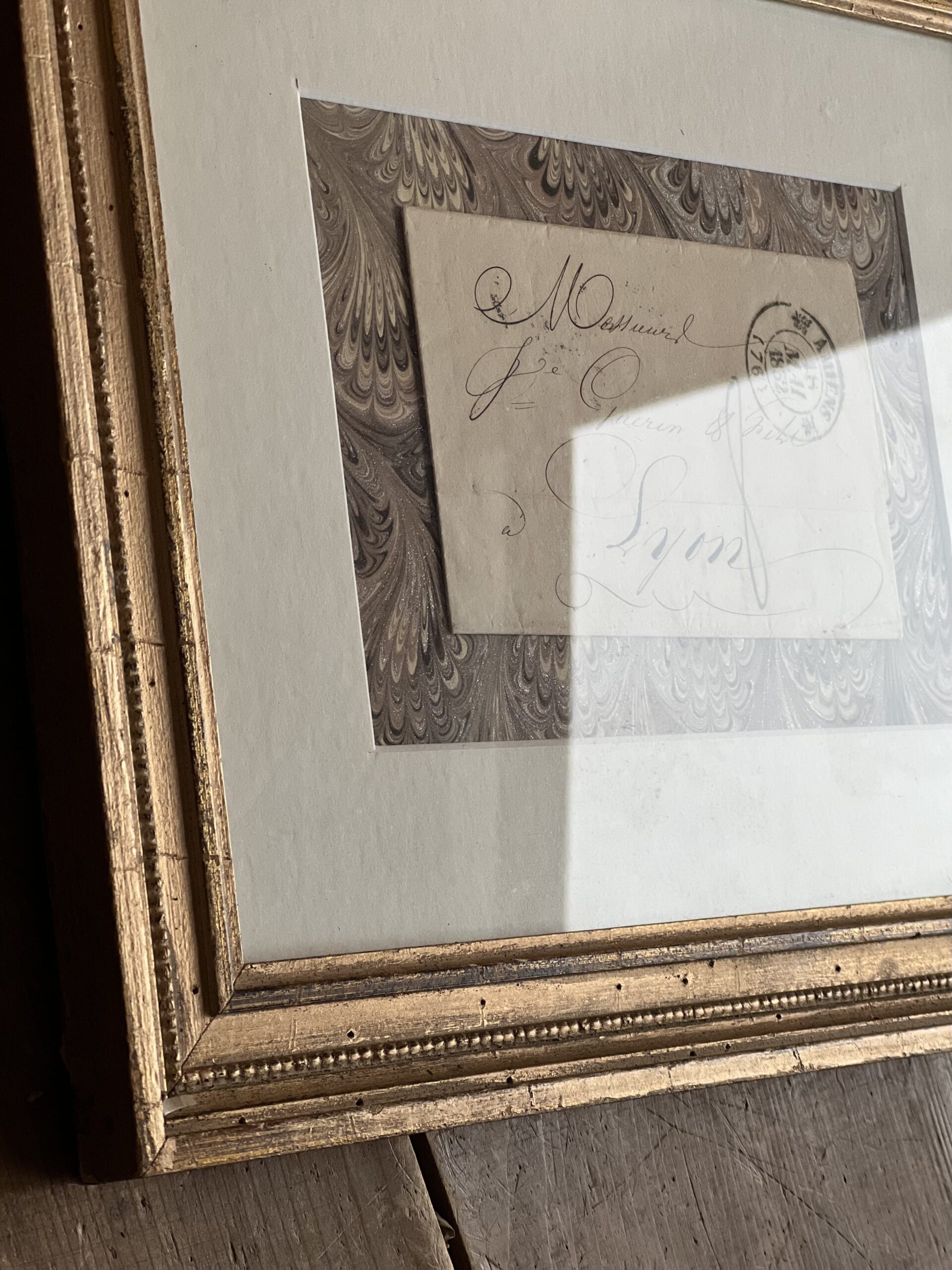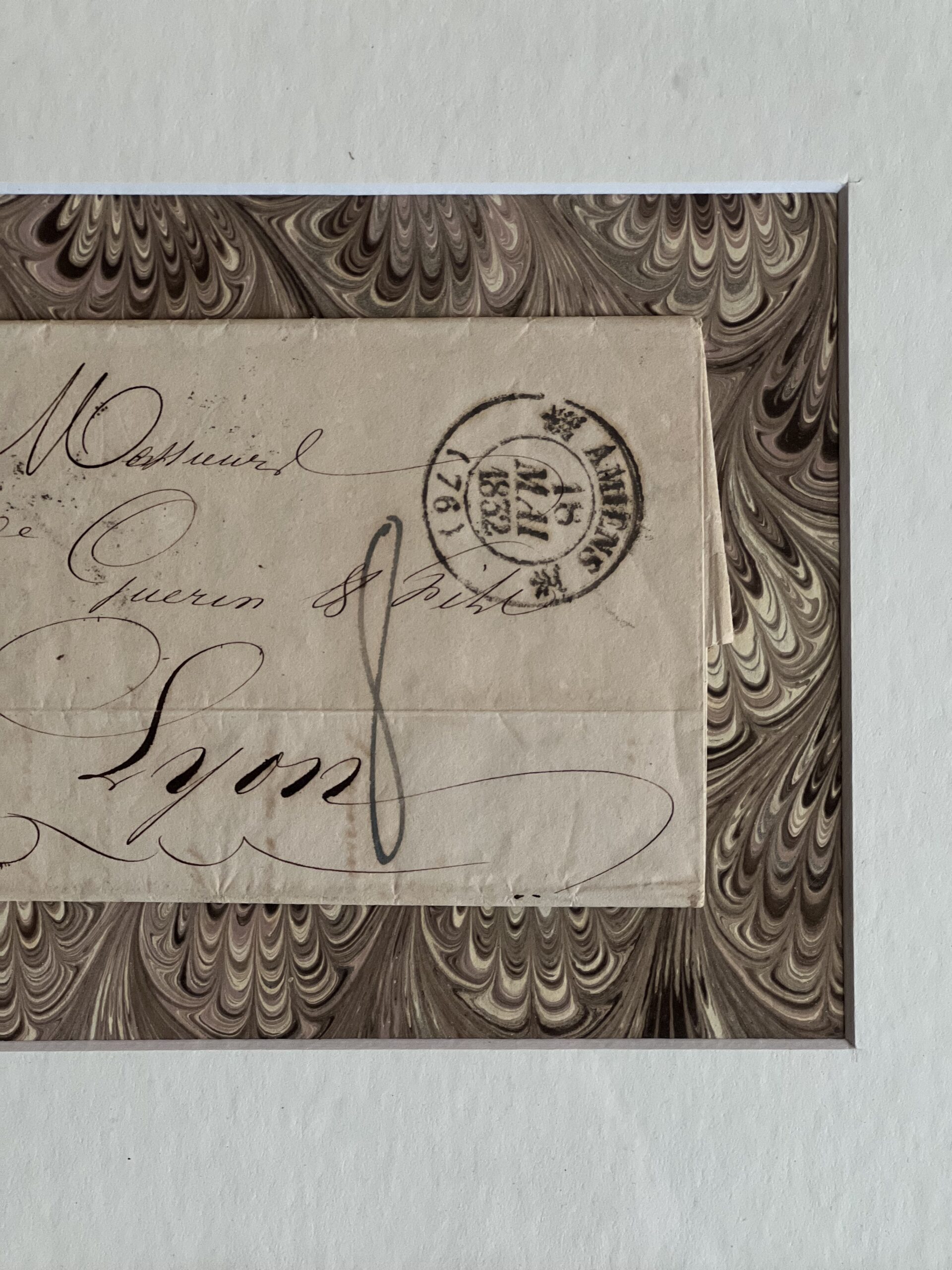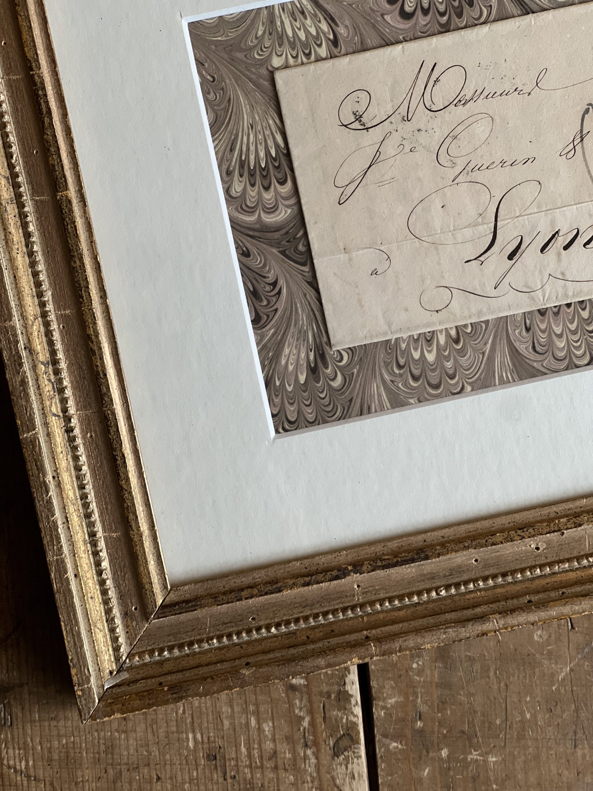 Beautiful framed postal letter dated May 18th, 1832, from Amiens to Lyon, France. Charming and romantic calligraphy on aged paper against Italian brown marbled paper, and matted with a creamy off white mat. Framed in a gold-toned wooden frame and ready to hang.