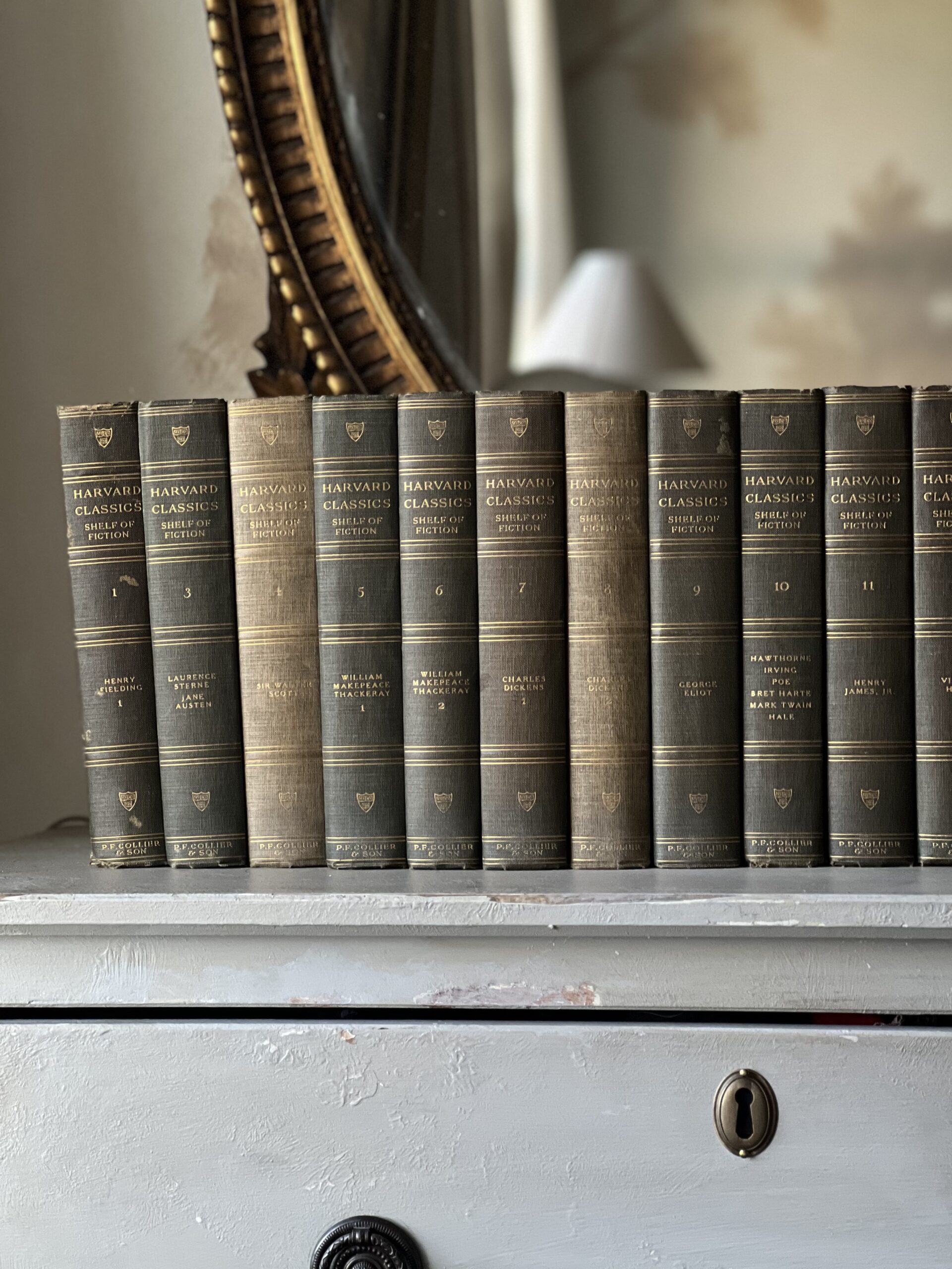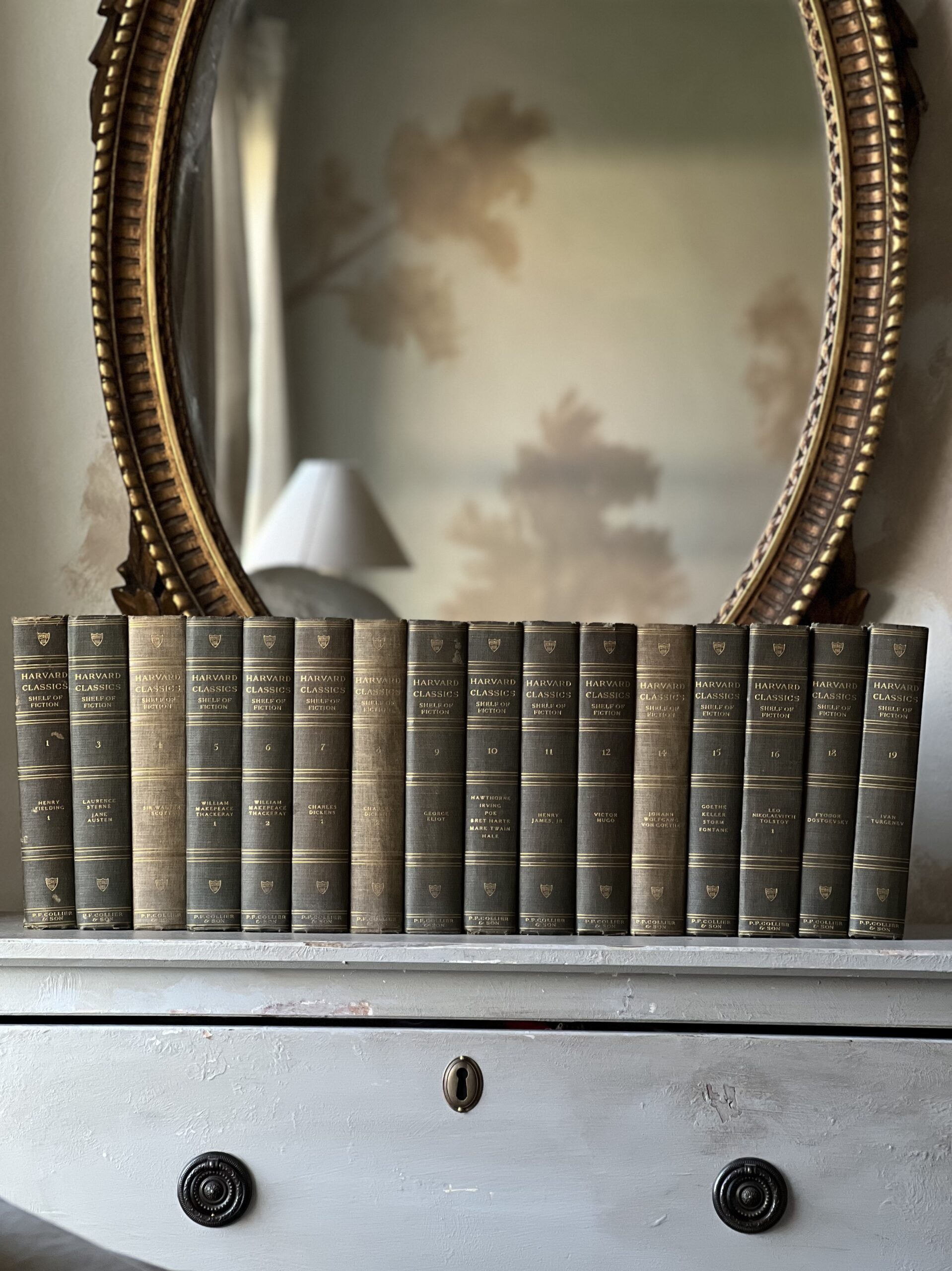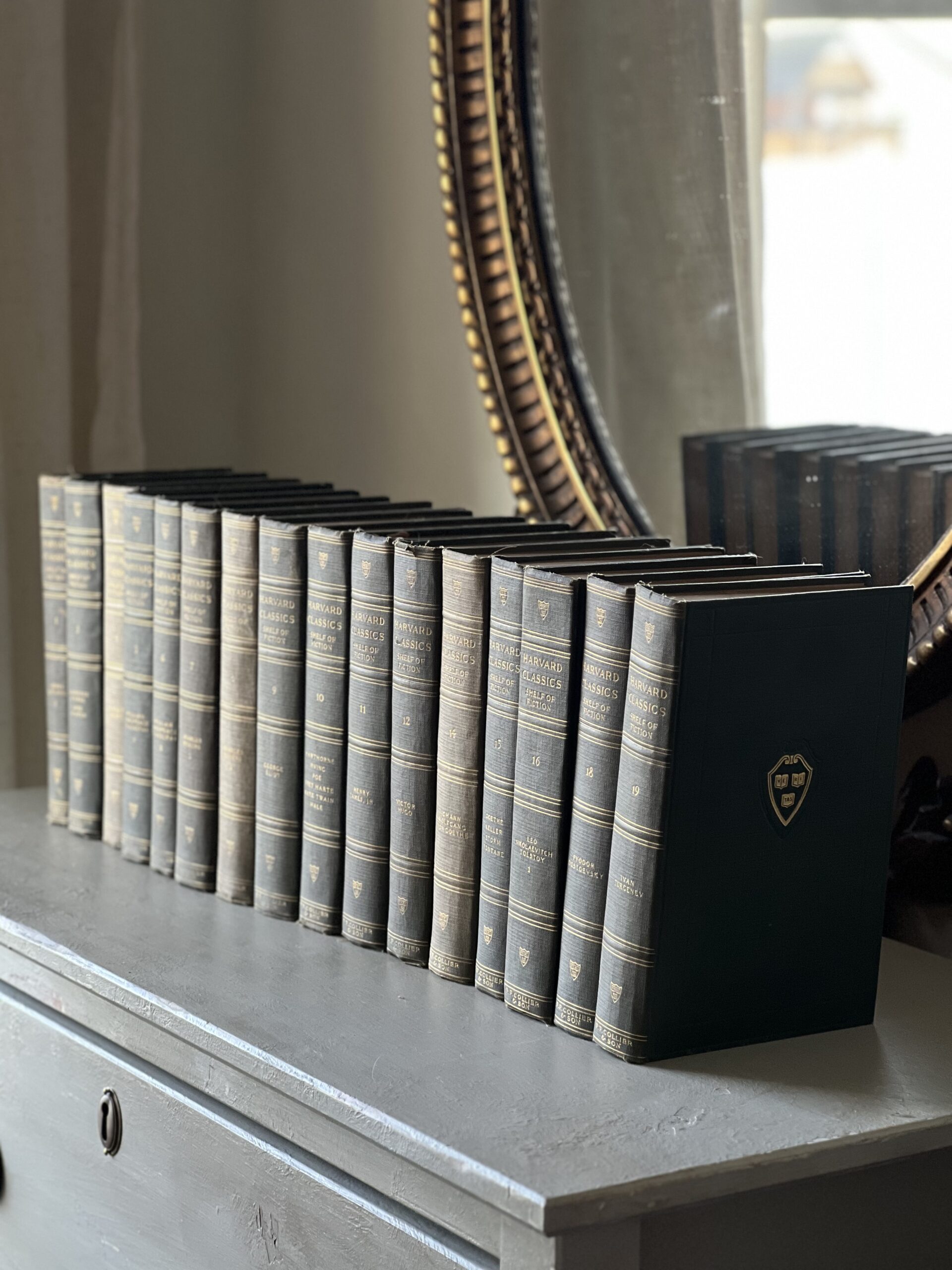 Gorgeous antique set of 16 hardcover Harvard Classics from 1917. Lovely faded shades of green and gold, these classic tales are in good antique condition with some spots of foxing and a few areas of tattered binding edges and loose threads. The perfect distinguished set to add to a library room, study, or to add a sophisticated moment to a cabinet or mantle. Complete collection is missing books 2,13,17, and 20.