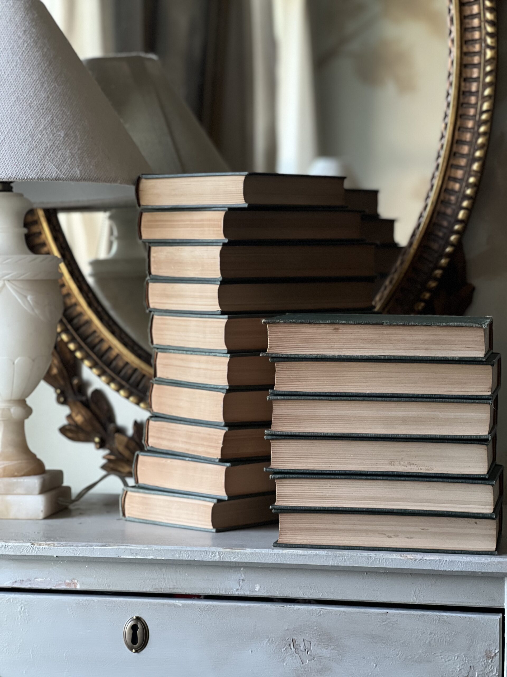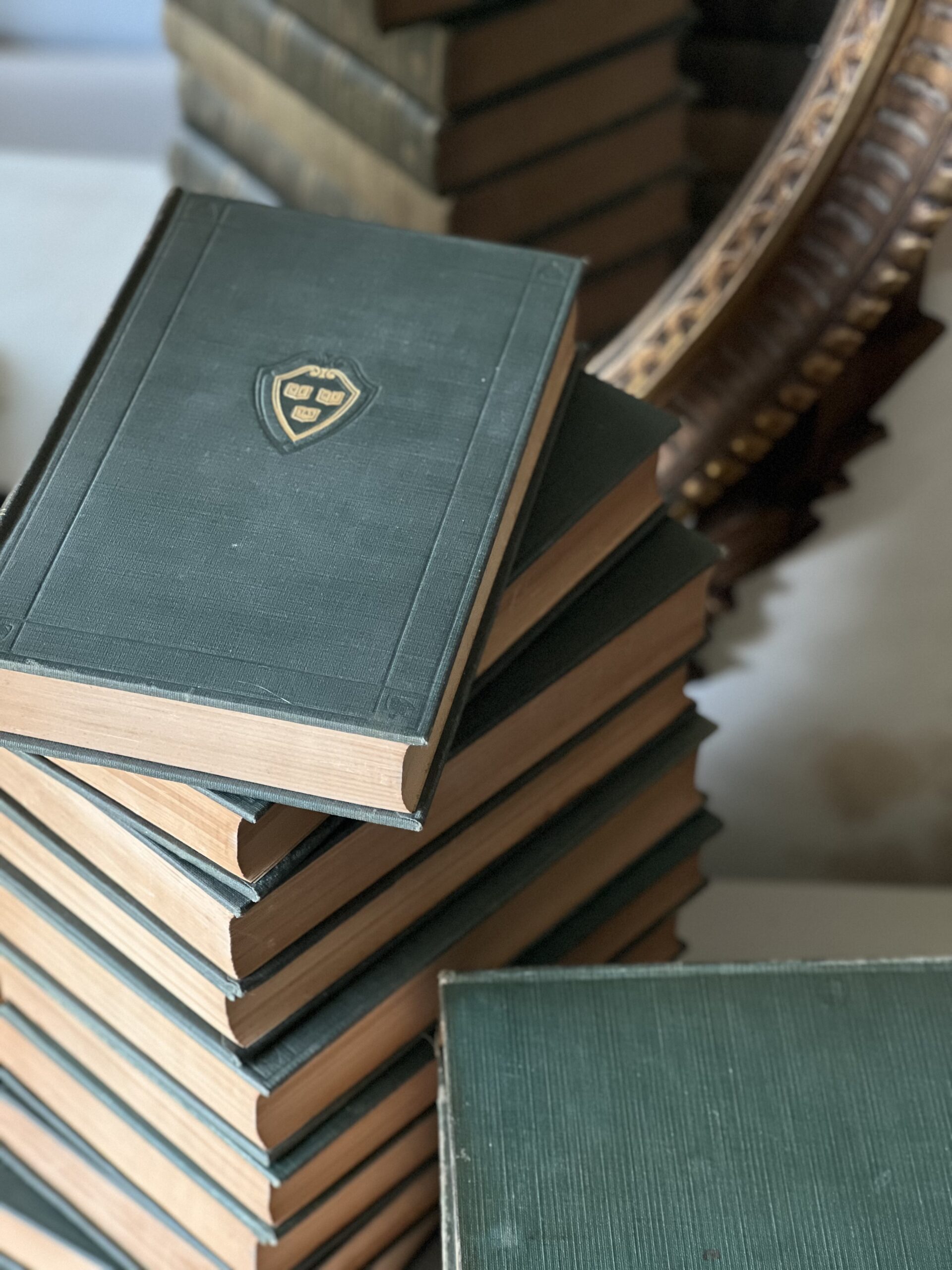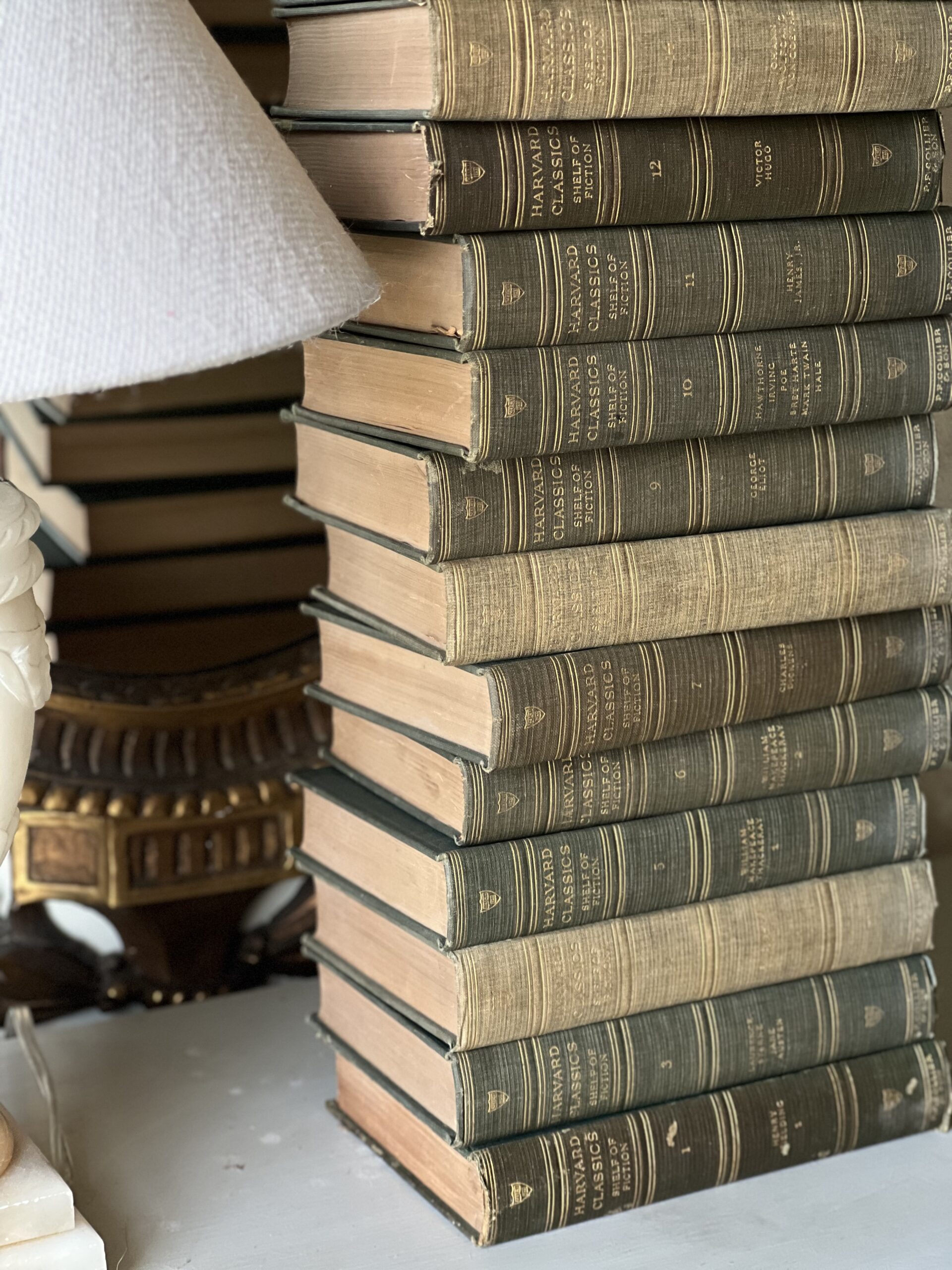 Gorgeous antique set of 16 hardcover Harvard Classics from 1917. Lovely faded shades of green and gold, these classic tales are in good antique condition with some spots of foxing and a few areas of tattered binding edges and loose threads. The perfect distinguished set to add to a library room, study, or to add a sophisticated moment to a cabinet or mantle. Complete collection is missing books 2,13,17, and 20.