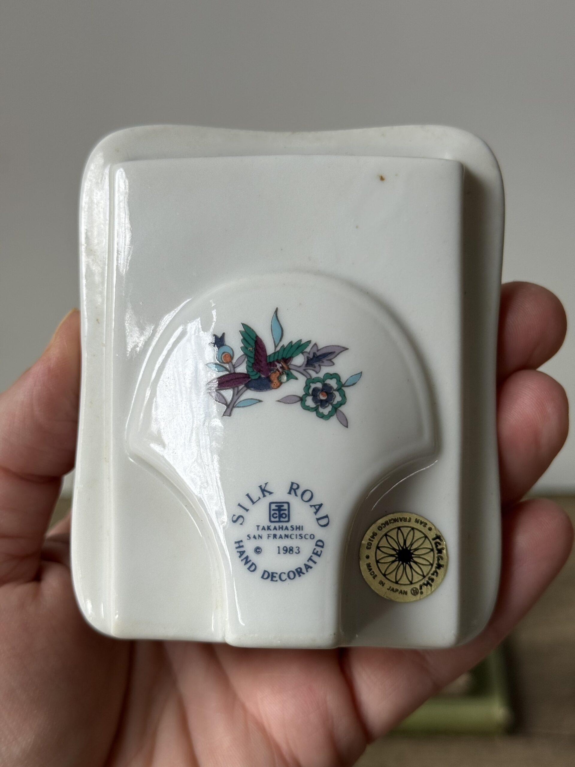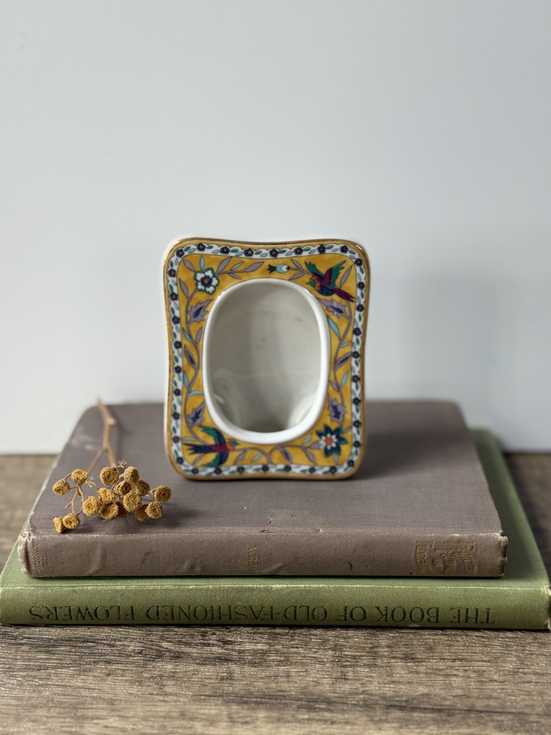 I love this adorable Takahashi frame. It stands up on its own. Has a Takahashi sticker on back and is dated 1983. Has a beautiful bird and flower design with a yellow background.