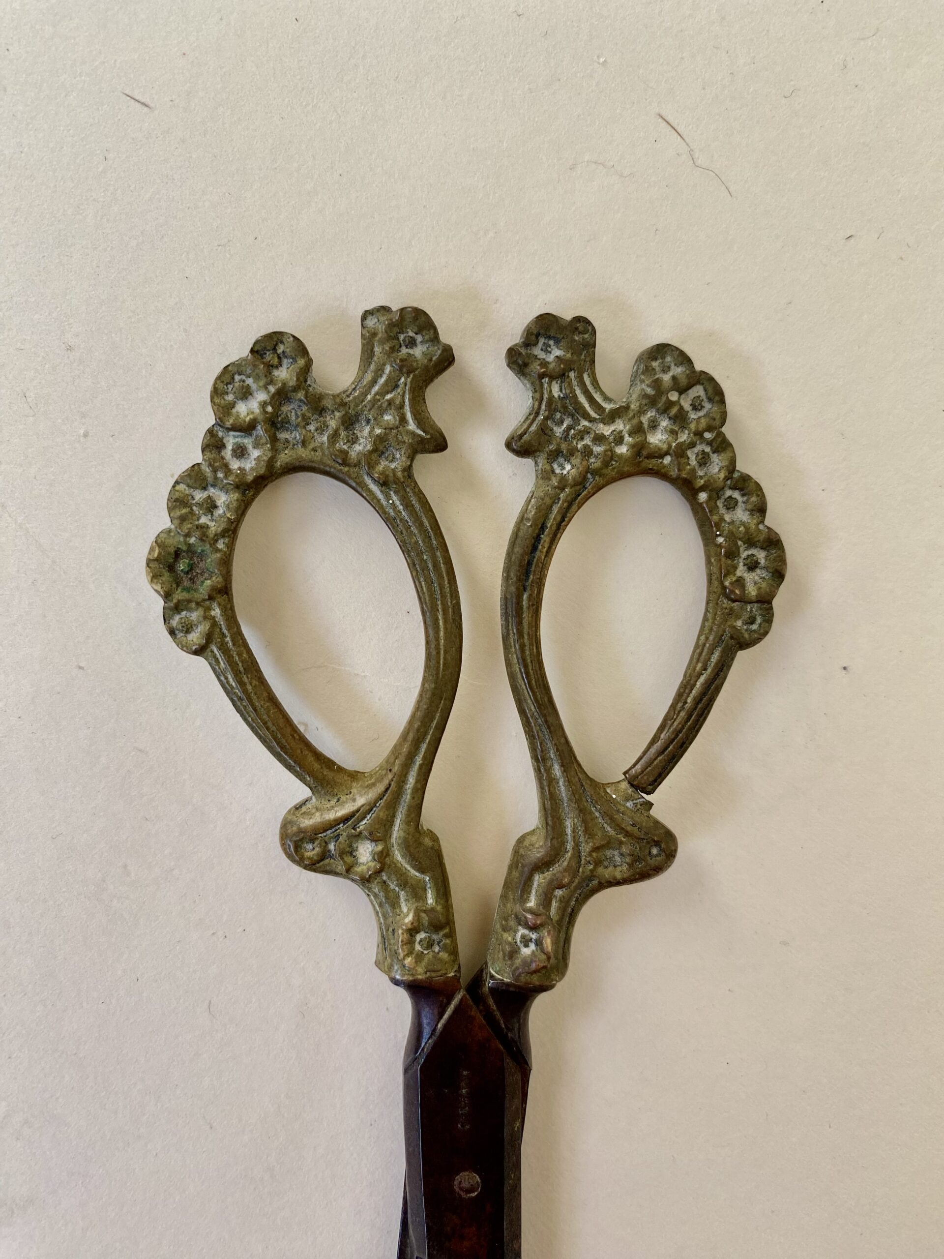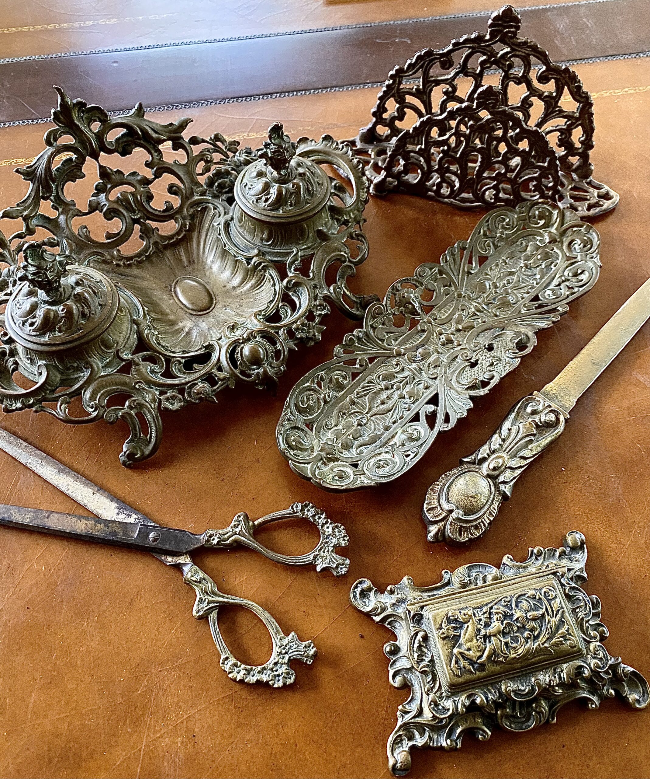 Scissors have chipped tip on one side, but are still functional. Inkwell has slight wobble when touched. All pieces have wear consistent with age and patina. Overall, set is in wonderful condition for it’s age!