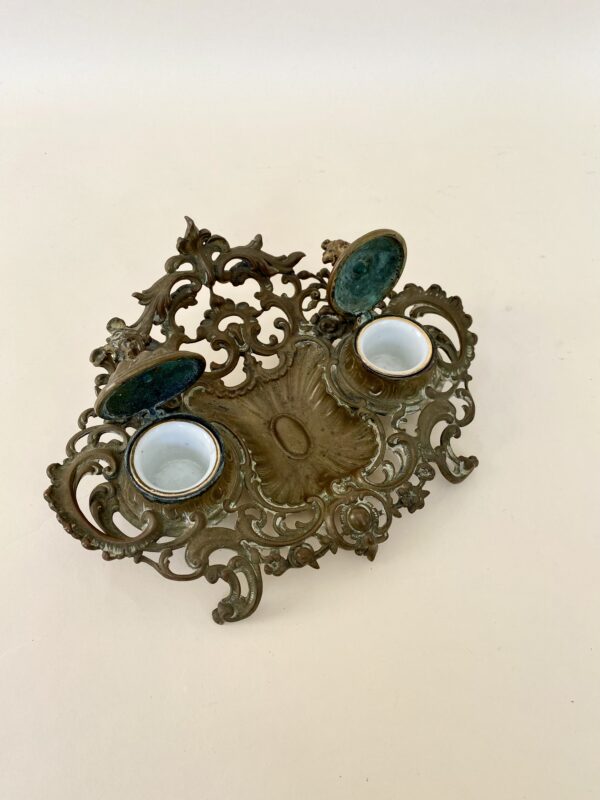 19c bronze inkwell with porcelain inserts (measures 10″ x 7.5″)