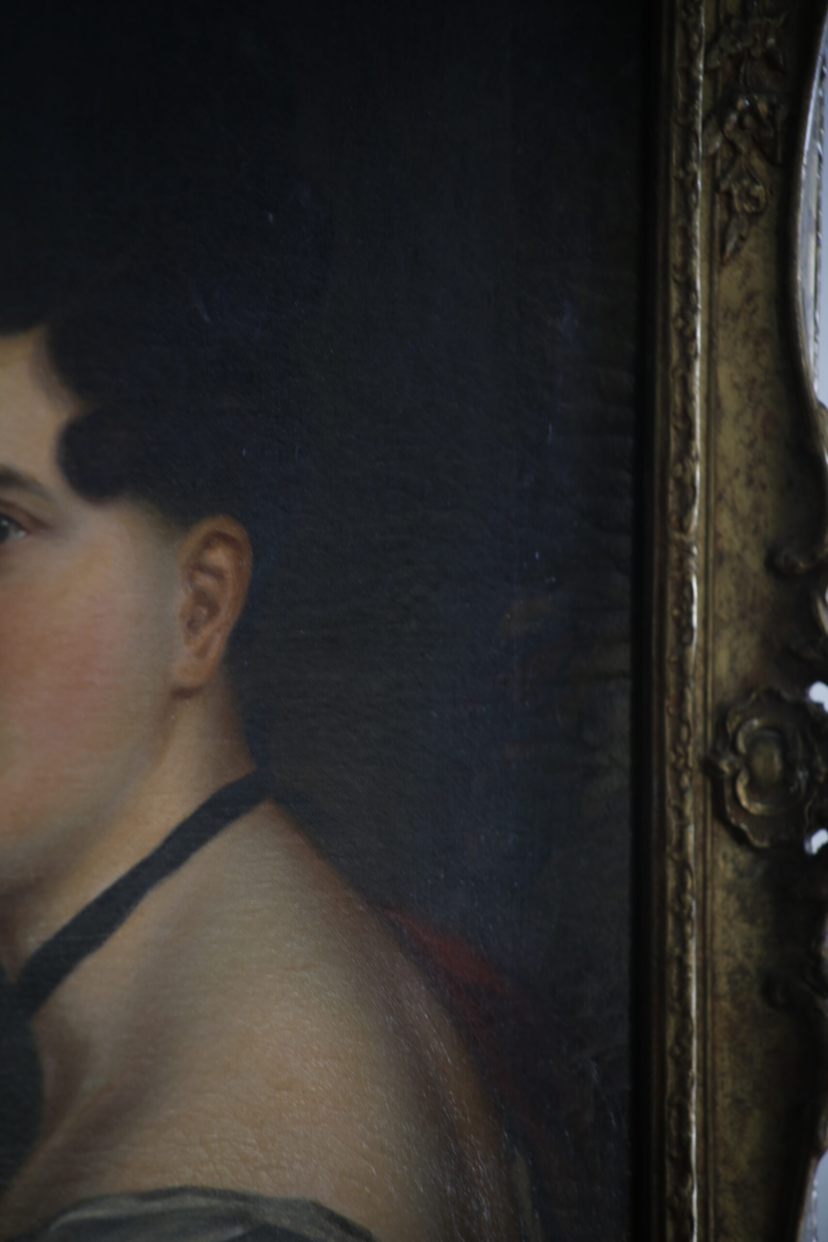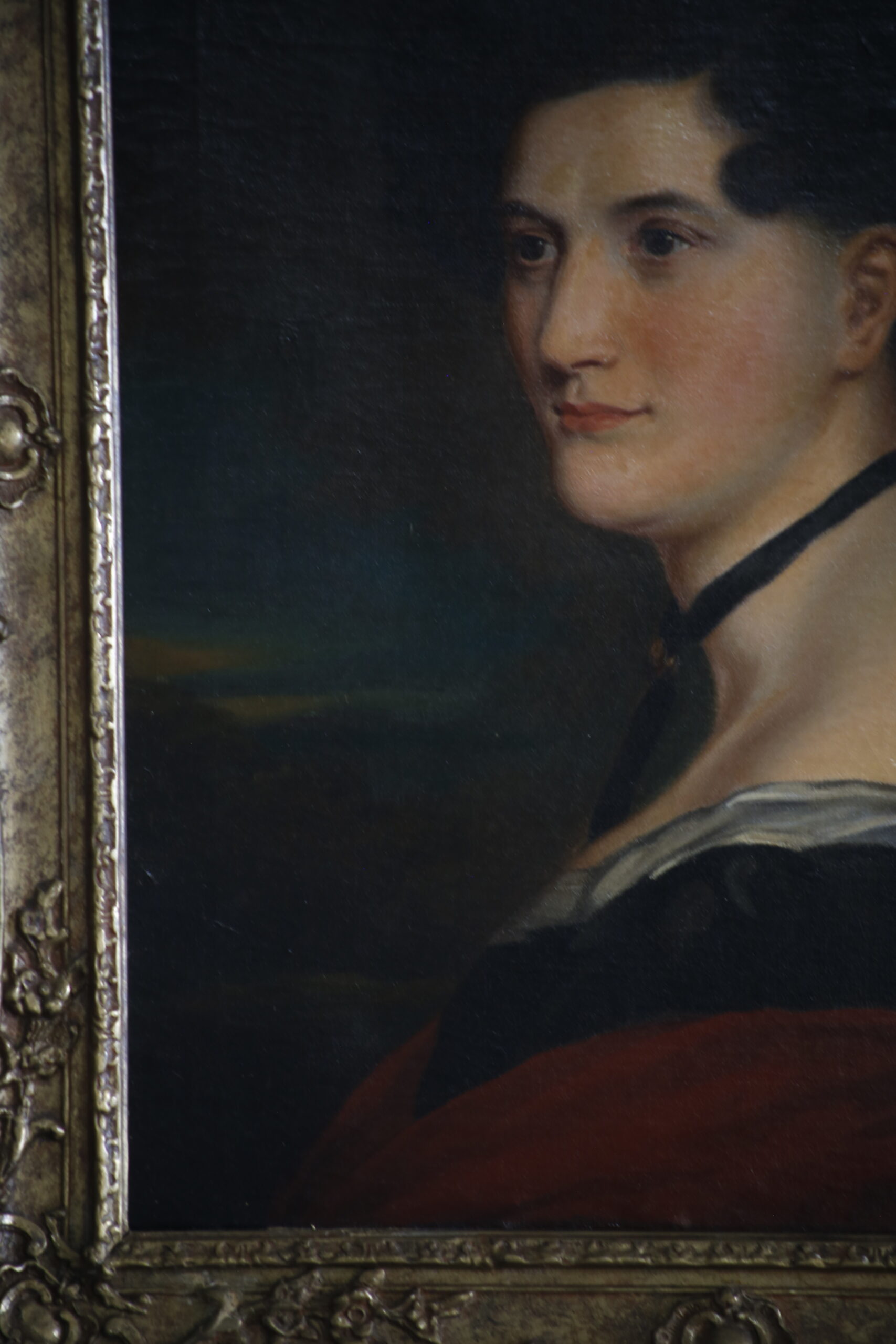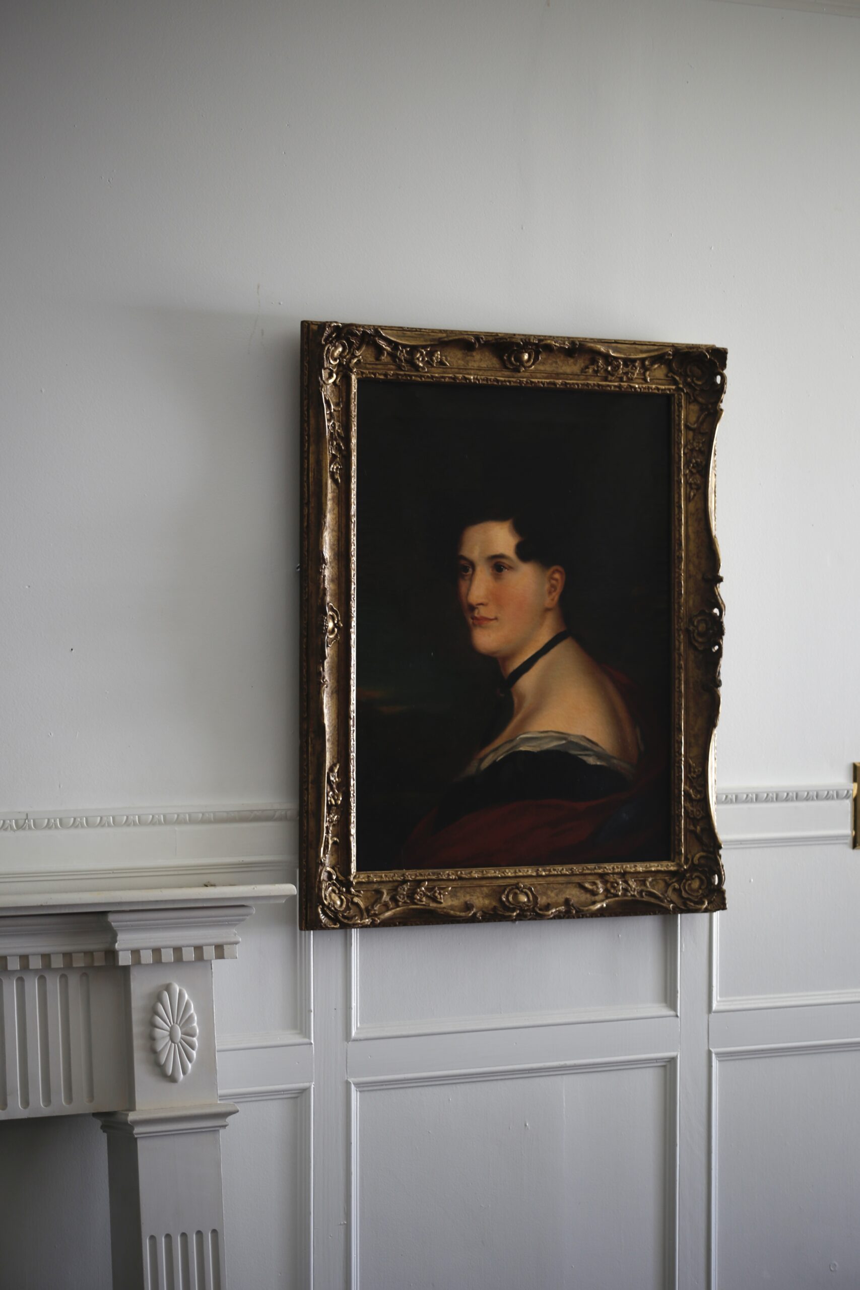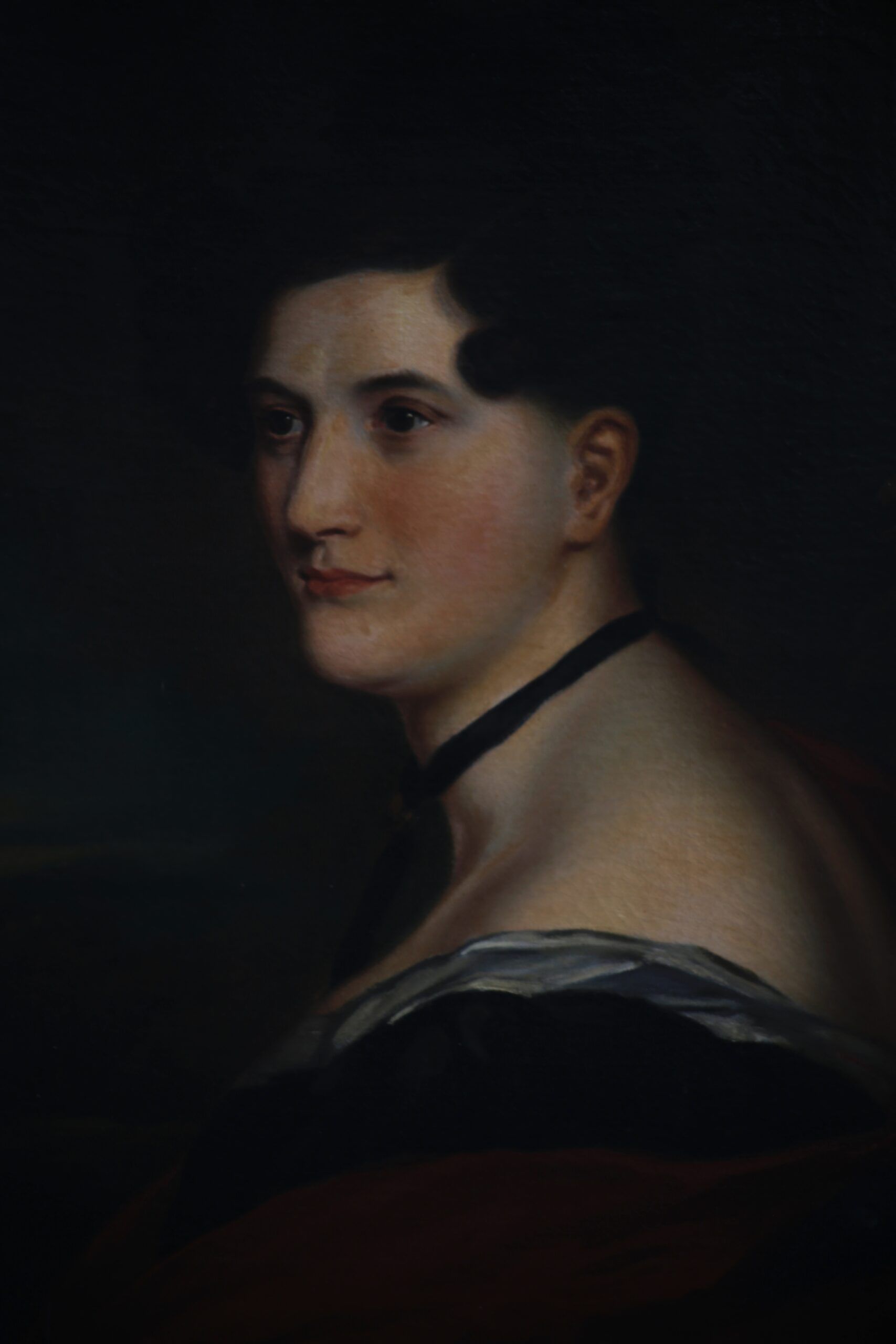 Stunning English oil portrait of a lady set against a moody scene. On one side is the faint hue of leaves from a tree which is hardly noticeable, while on the other, dark blues and greens to form the colors of a landscape.