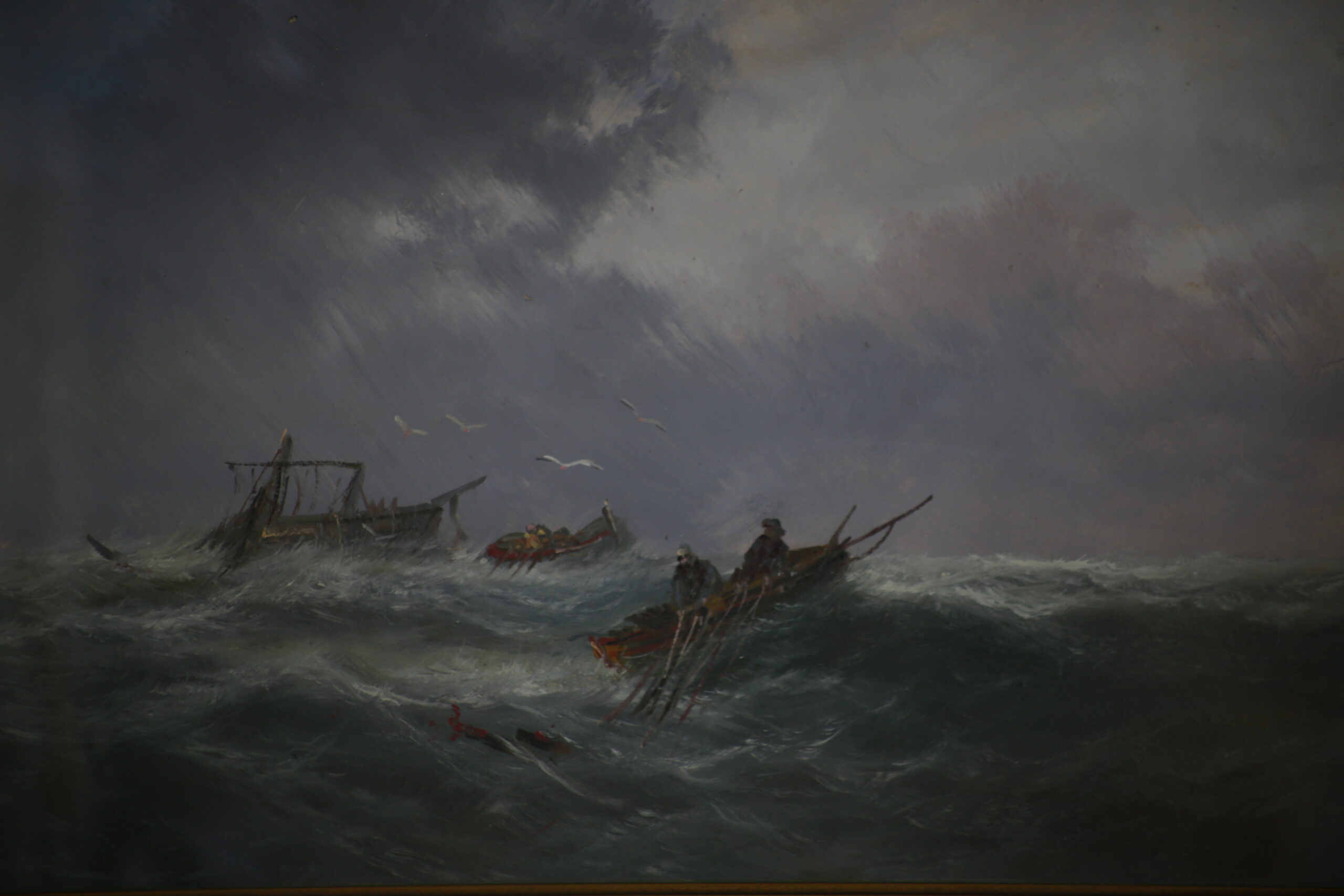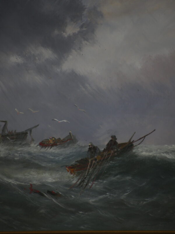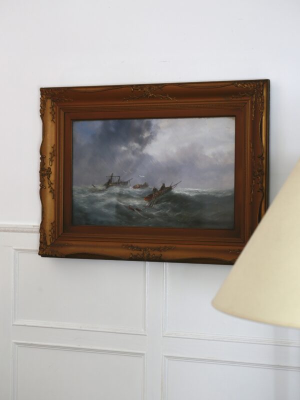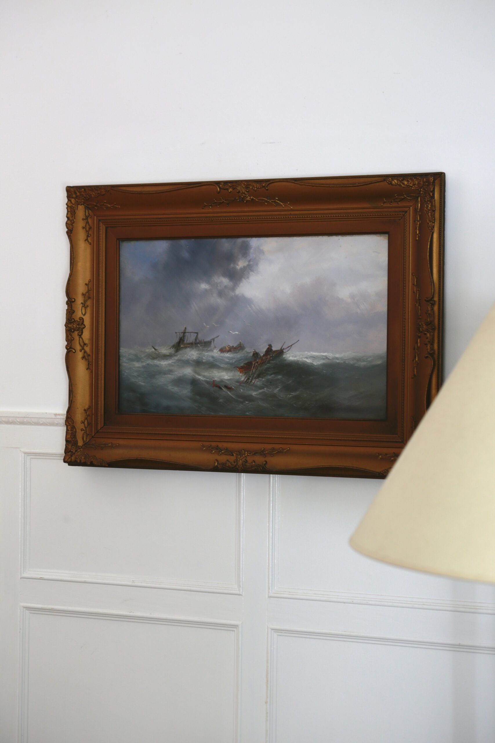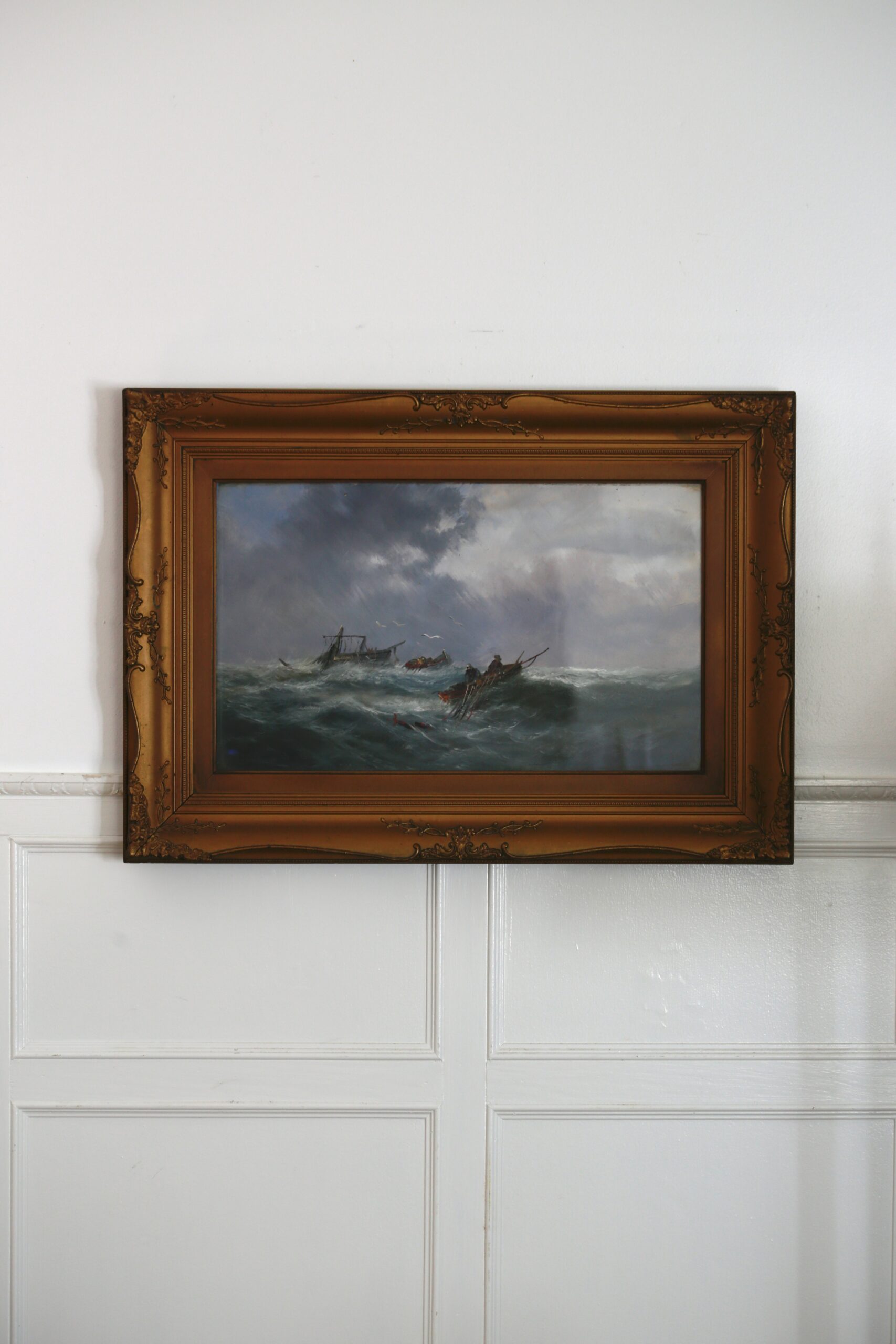 English School 19th Century oil on board depicting a shipwreck seascape scene. Painting is framed in a vintage frame with a glass front. Overall the painting is in excellent condition for age with only minor age-related wear to both frame and painting.