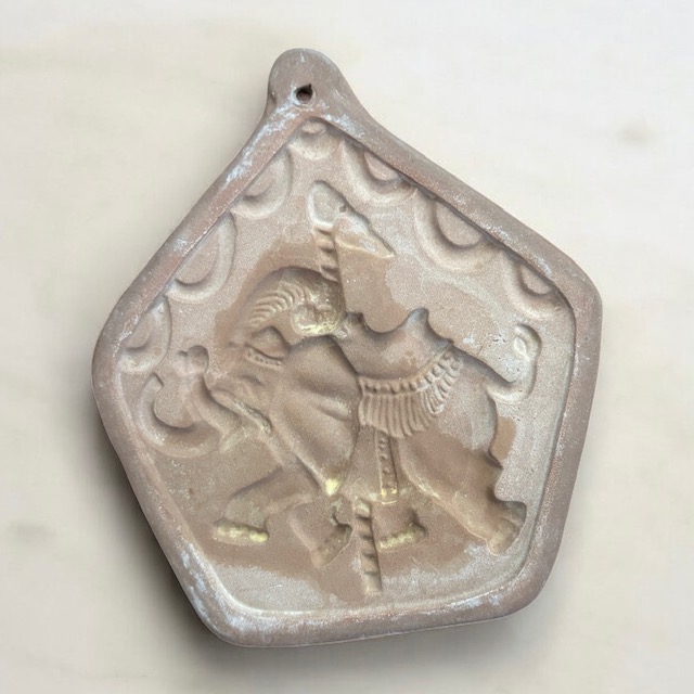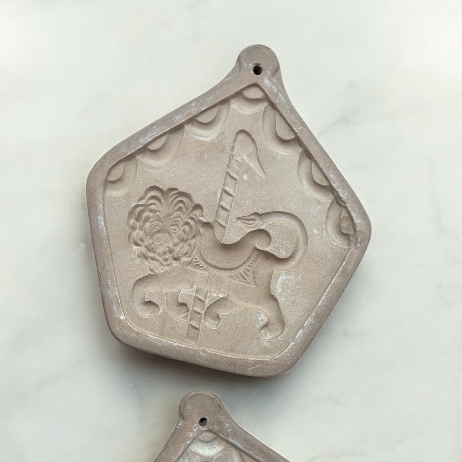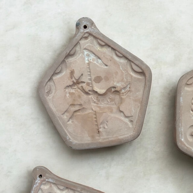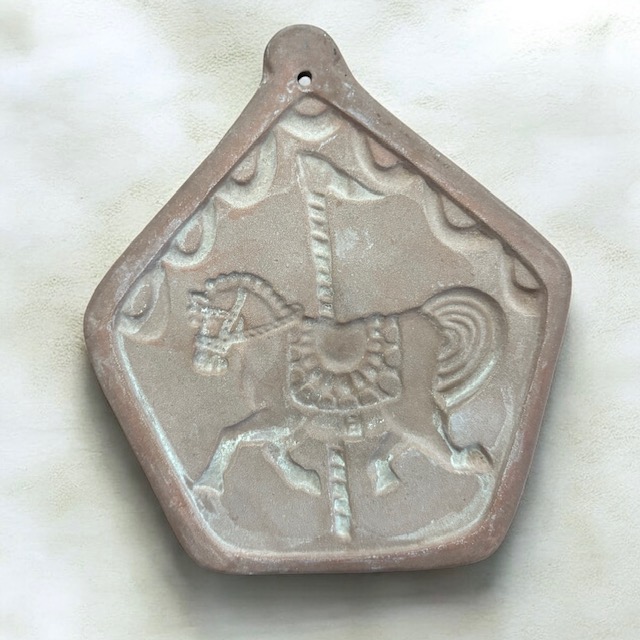 Vintage set of 4 Hartstone USA, terra-cotta ceramic cookie molds in the carousel pattern. There is a carousel horse, elephant, lion and what looks like a donkey. Circa 1980.