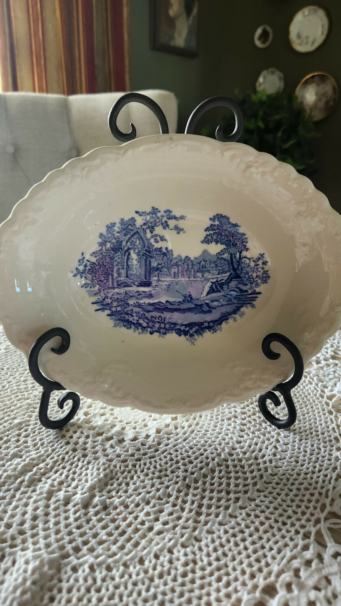 This is a vintage Large 9 1/4″ x 7″ Vegetable Bowl e in the English Abbey pattern in blue transferware by T S and T or Taylor, Smith and Taylor, USA in the 1920-1930s.