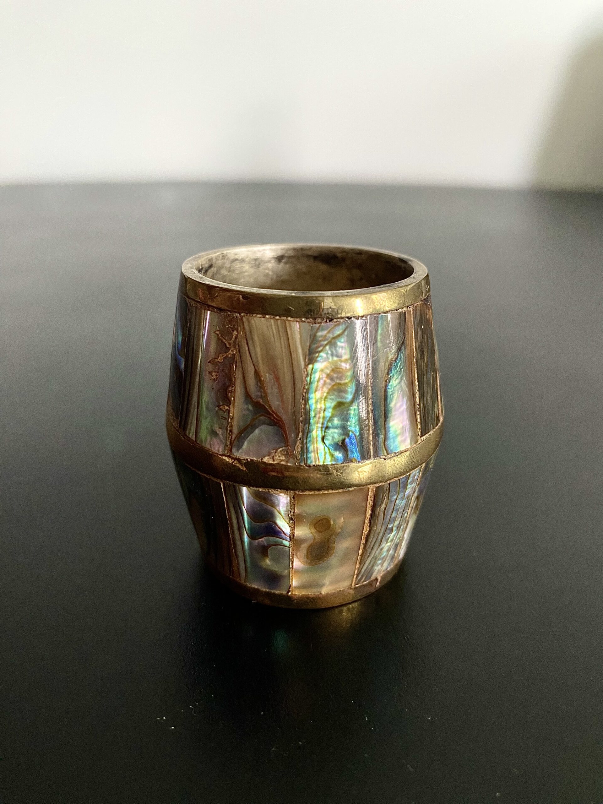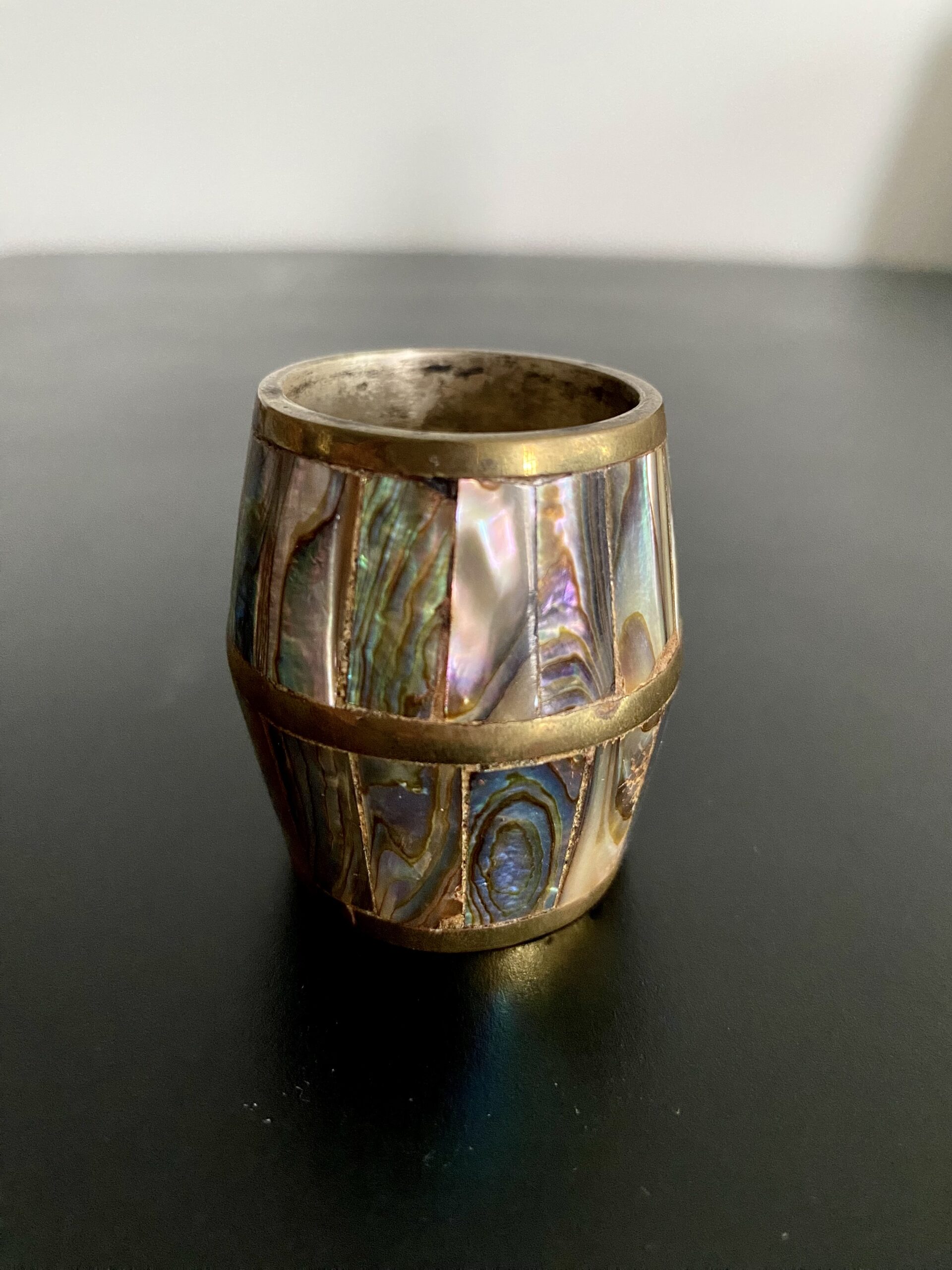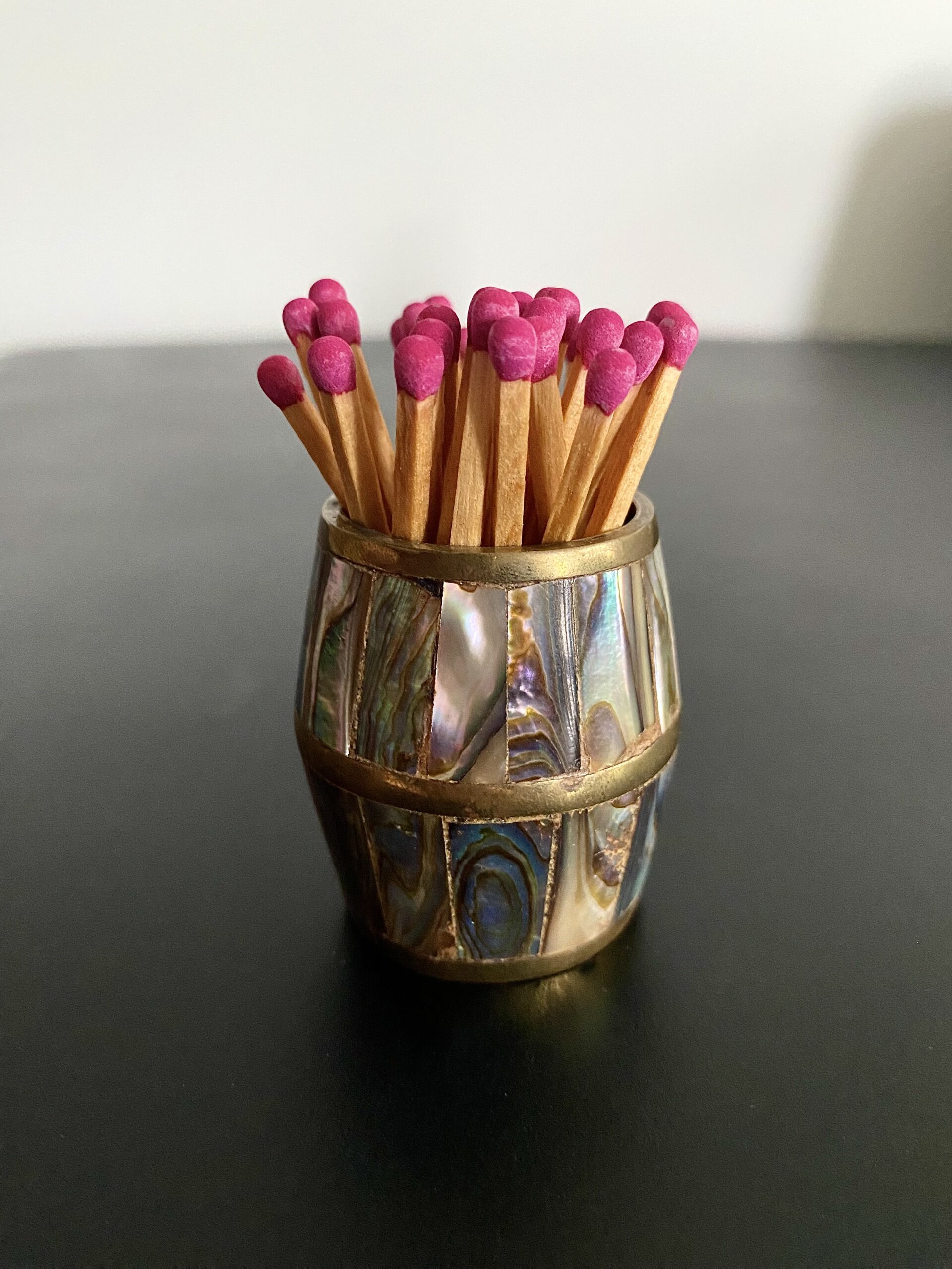Abalone shell and brass match/toothpick holder. Measures 2″ x 1.5.” Matches not included.