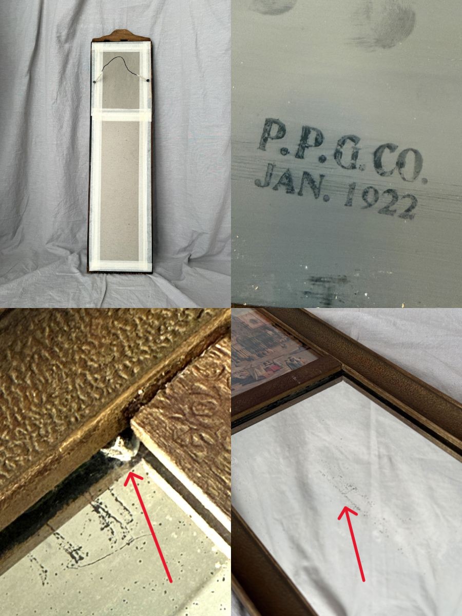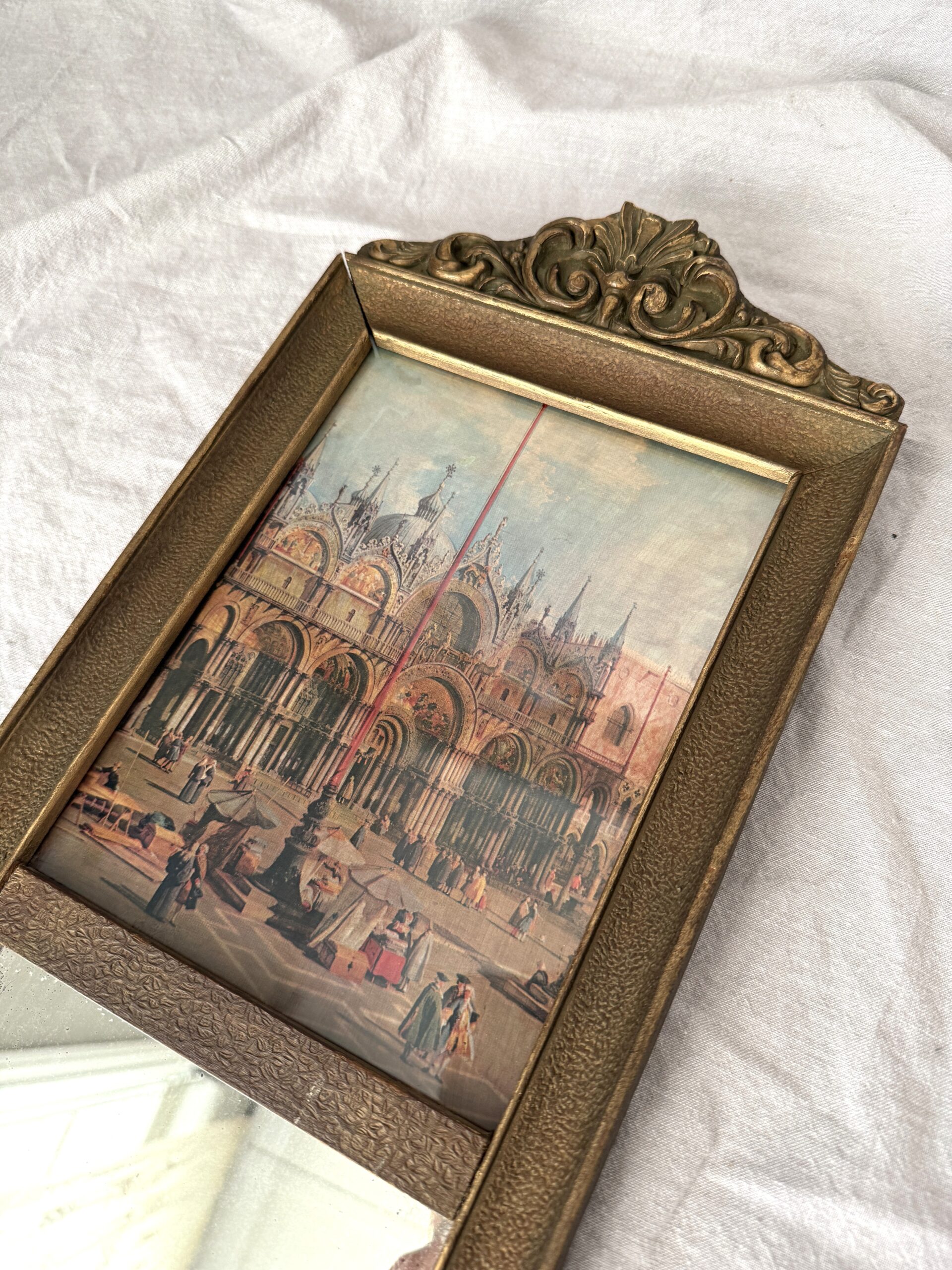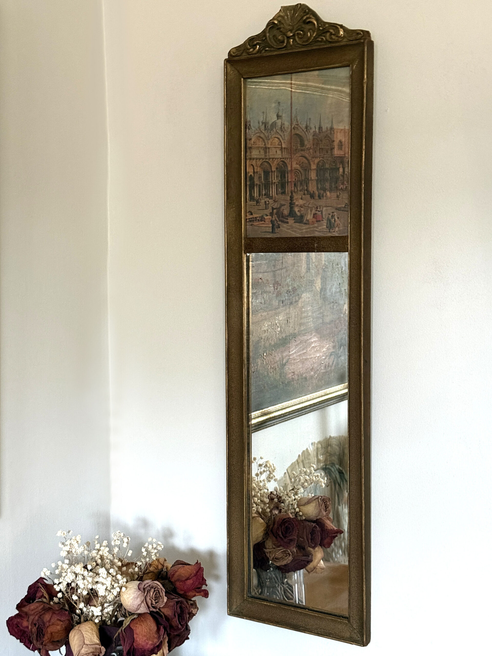 Antique trumeau-style mirror with print of Giovanni Antonio Canal’s (“Canaletto” – Venetian, 1697 – 1768) “Piazza San Marco” in Venice, completed between 1742 and 1744. The mirror is stamped “P.P.G. & Co. Jan. 1922″ (history below). The commercially-produced print is a replacement and dates from the mid 20th century; lovely muted colors with an aged look. The antique mirror, built on a wooden frame, has a stippled design and an applied ornate crown featuring scrolls and florals. The mirror is heavy and thick, measuring 1/4″ thick. Overall measurements are 30″ x 7-5/8″; the mirror area is 17-5/8″ x 5-5/8″ and the print area is 7-5/8″ x 5-5/8”. Very good preowned antique condition with a couple of areas of missing silver on the mirror, a nick on the underside in the upper left corner of the mirror, and missing tip of the crown at the very top. None of these detracts–see photos. New backing; ready to hang. Great piece for European-inspired interiors and the perfect size for those hard-to-style narrow walls.