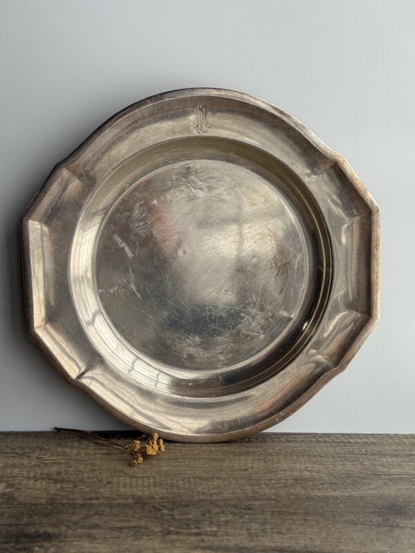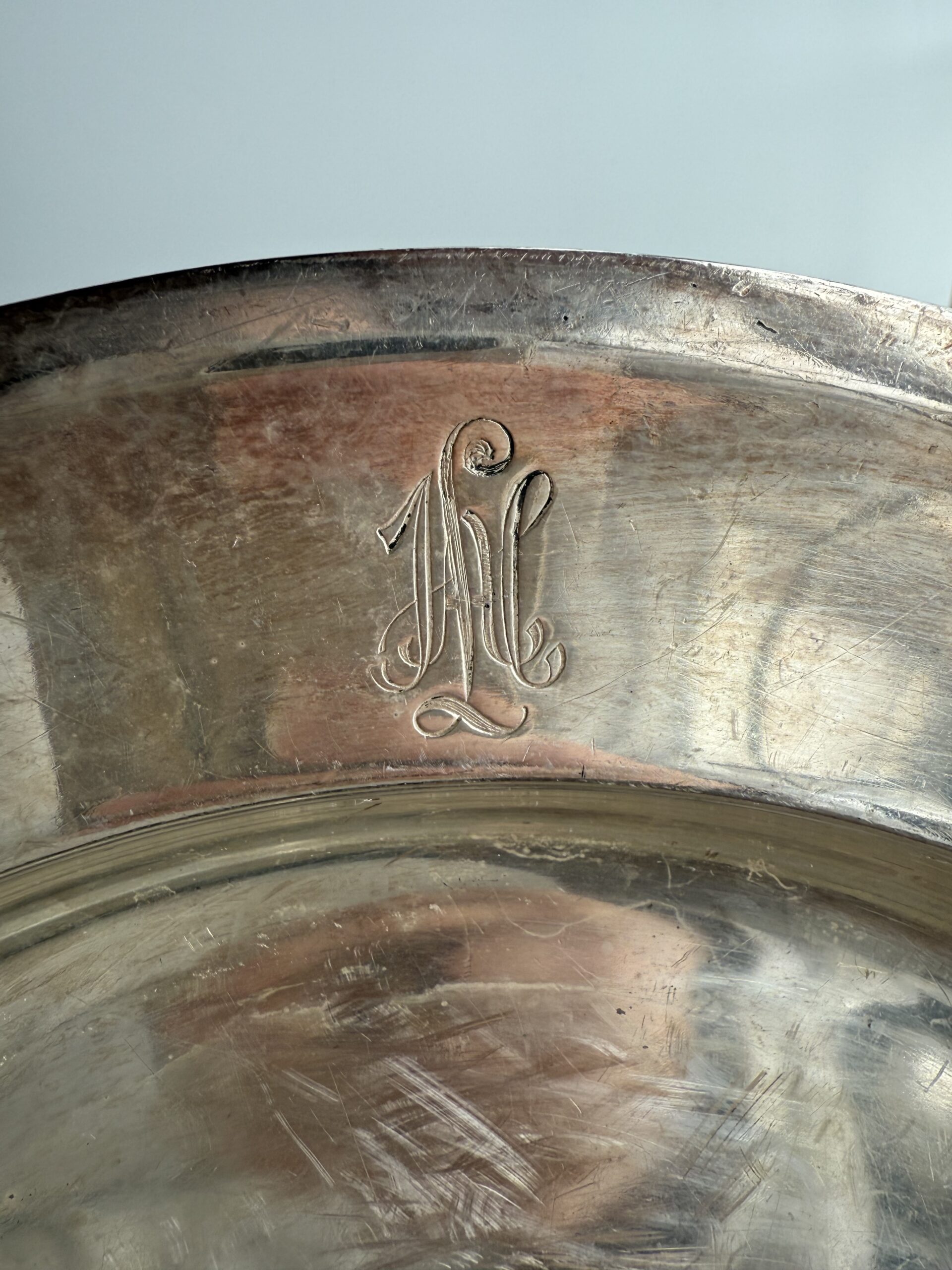 Antique Silver plated tray made by August Wellner Sohne a German silver-plate manufacturer. Most likely from 1910s. Has surface scratching and patina. Monogrammed at the top.
