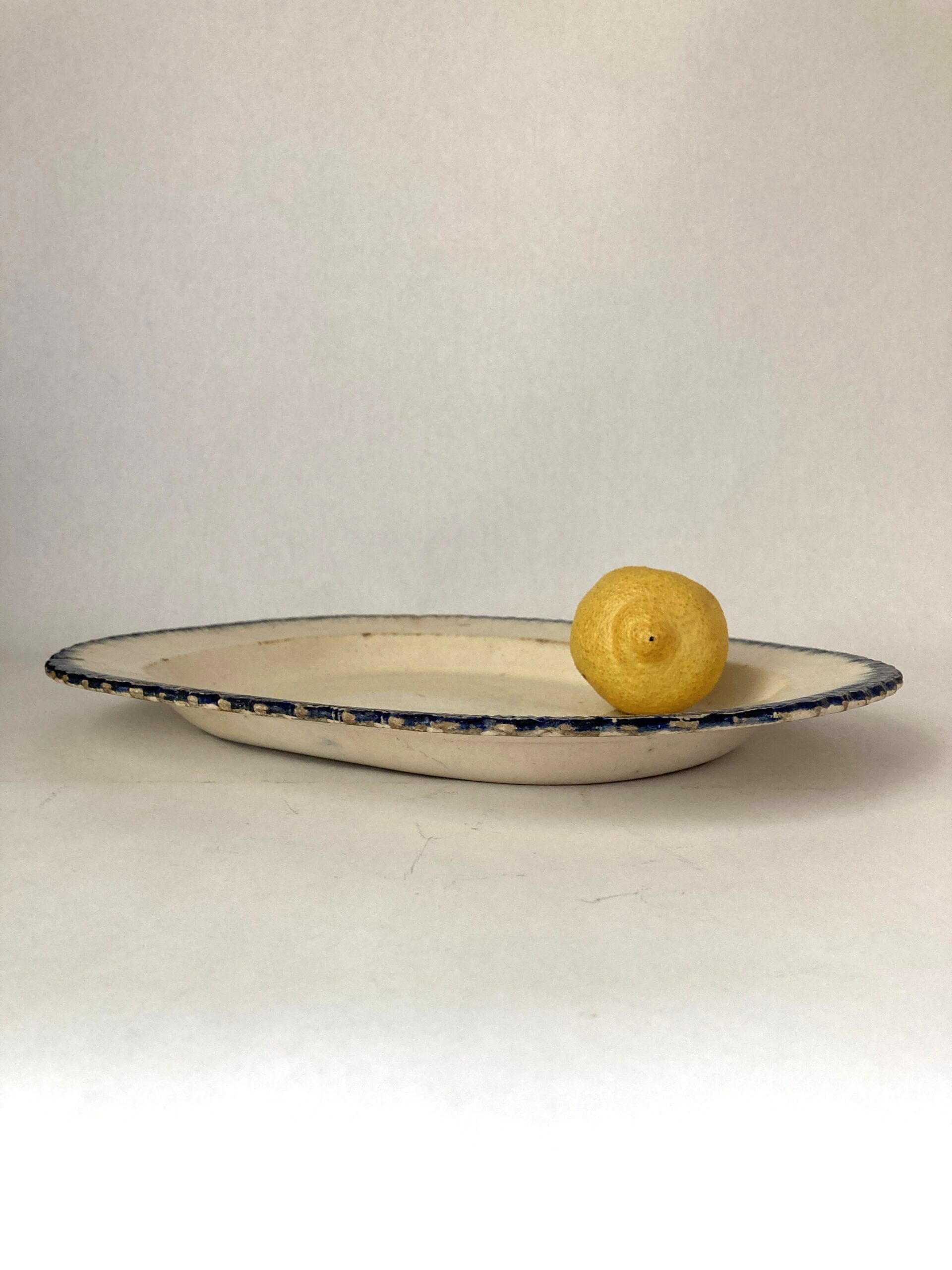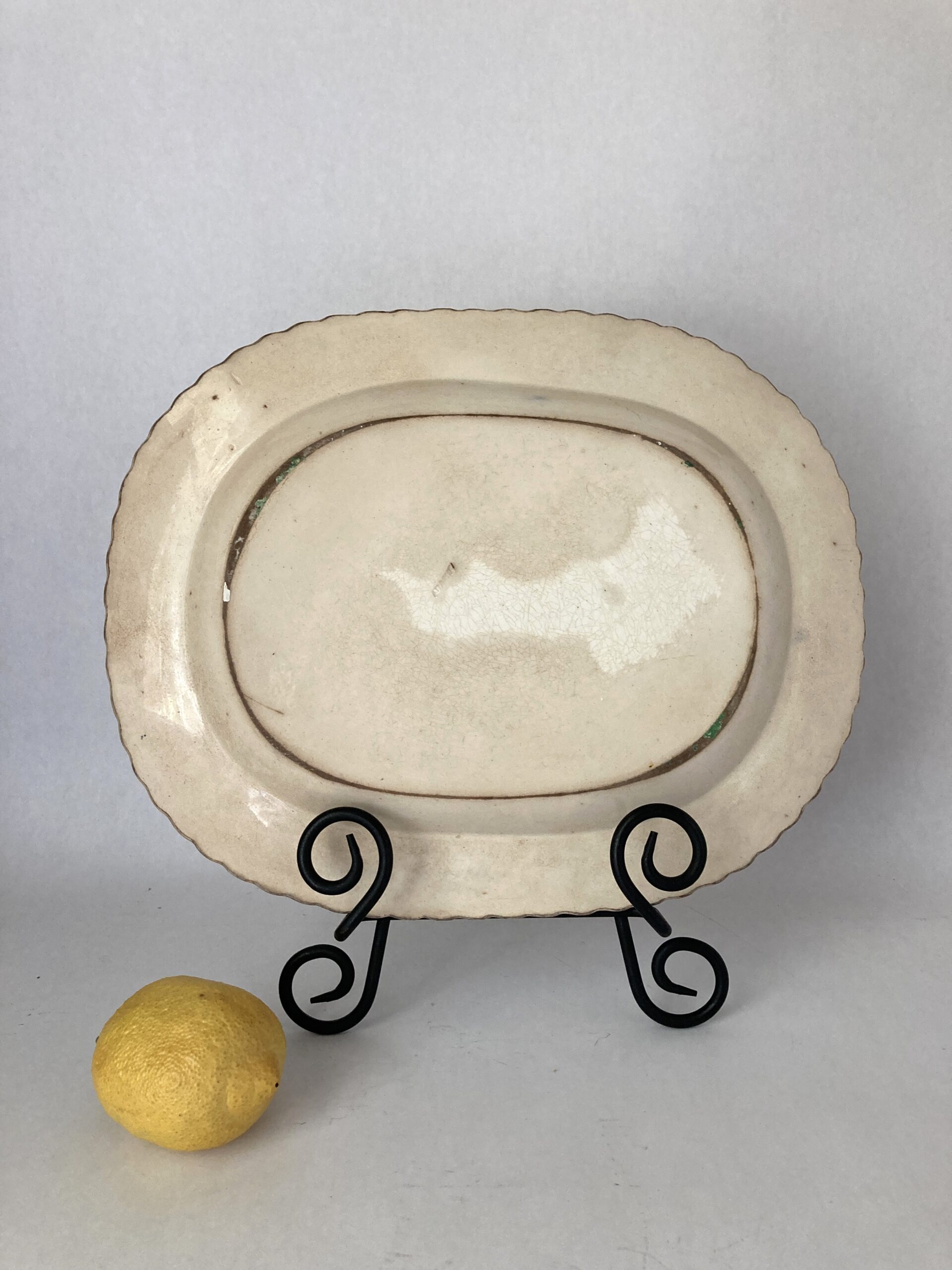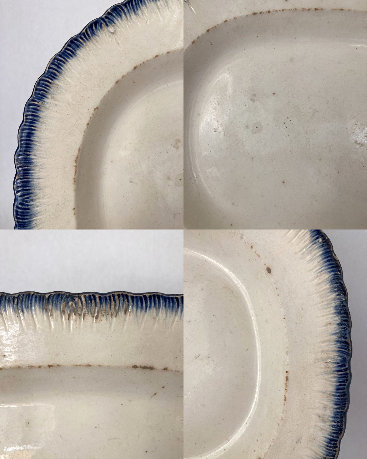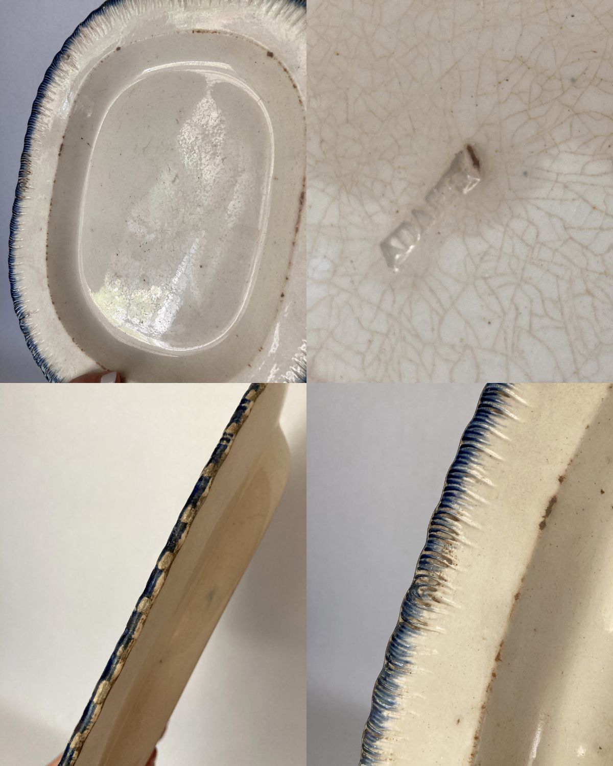 Antique blue feather edge creamware platter from the late 1700s to early 1800s by Adams (William Adams & Sons, Staffordshire, England). The platter measures 13.5″ x 10-7/8″ and shows wear consistent with two+ centuries of use. Remarkably, although the finish is very worn, especially around the edge, there are no chips or cracks; there’s plenty of crazing, staining, utensil marks and surface wear, but the actual pottery is intact–see photos. Great addition to a collection of antique feather edge creamware.