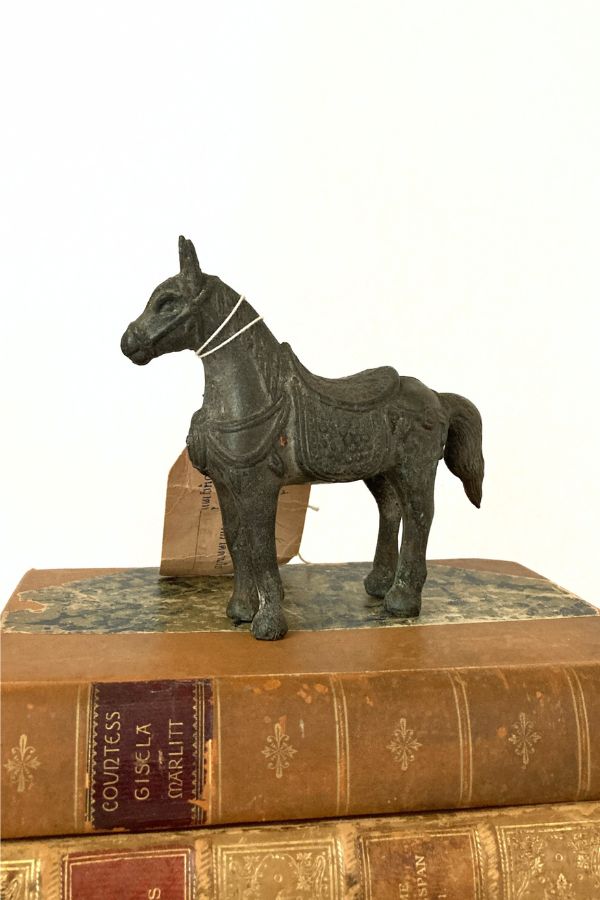 Antique cast metal war horse, possibly Chinese, exported from the Kingdom of Siam, now Thailand. Original tag translates to “The Department of Fine Arts has issued a permit to leave the Kingdom according to the permit number.” Very detailed, rough surface with some oxidation, nice and heavy (about 1 lb.), 4.75″ tall x 5″ long. Great shelf-styling piece.