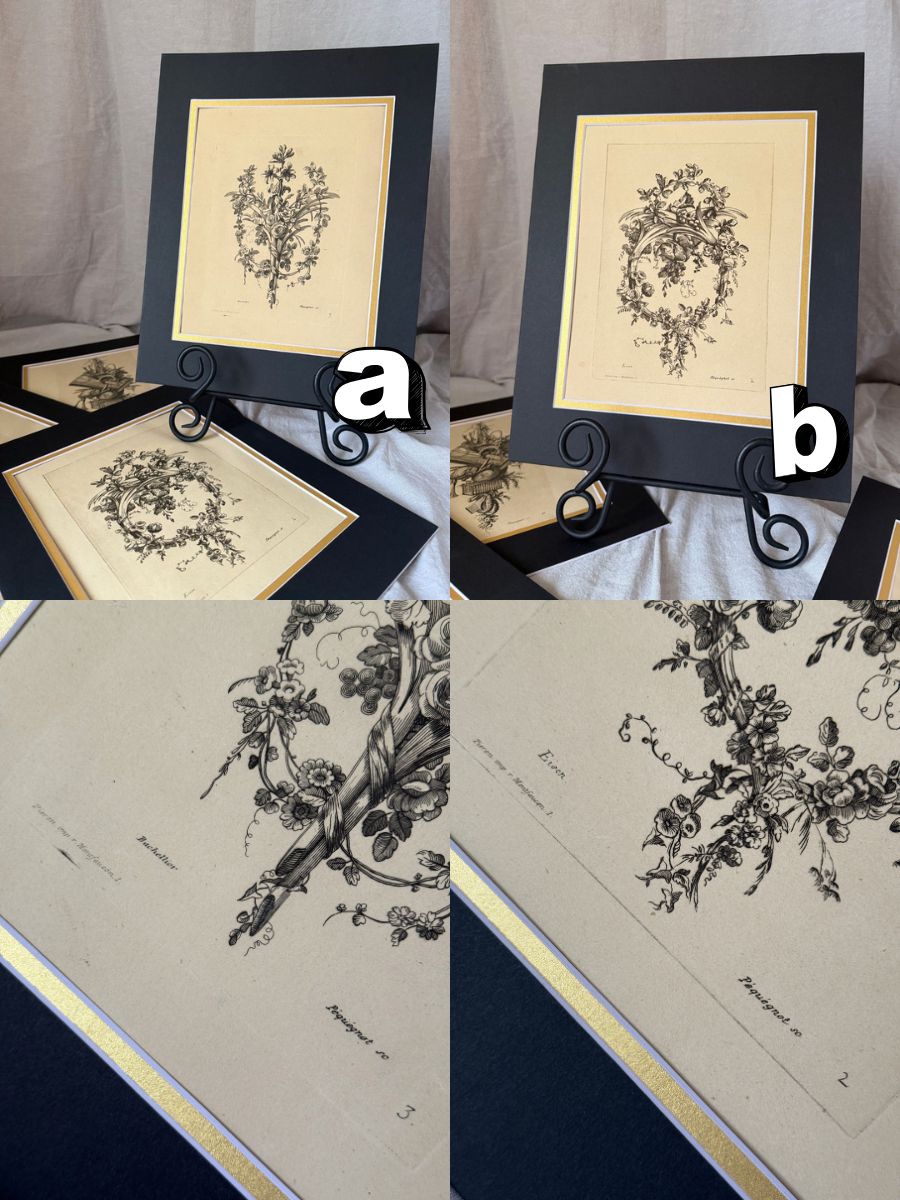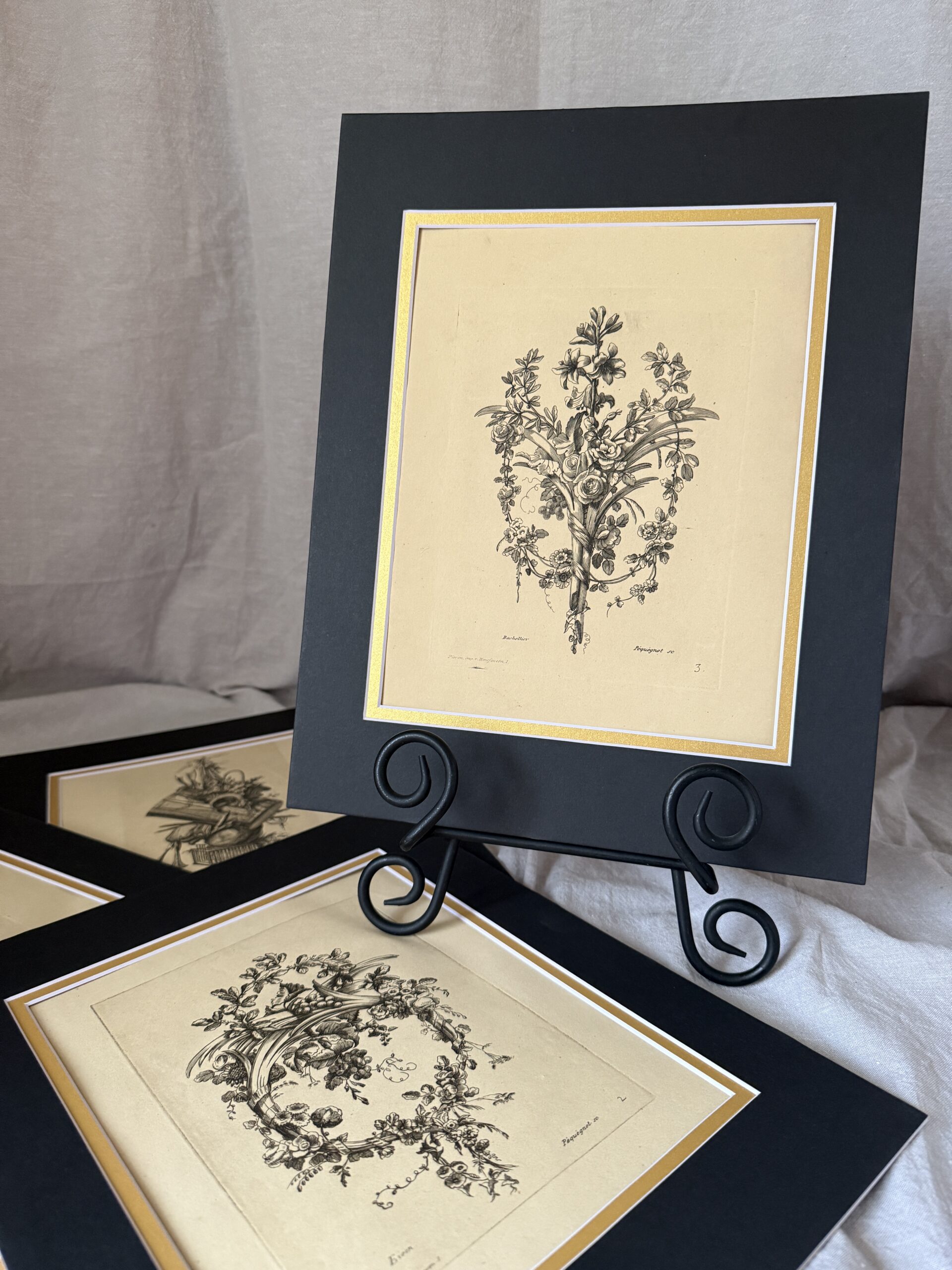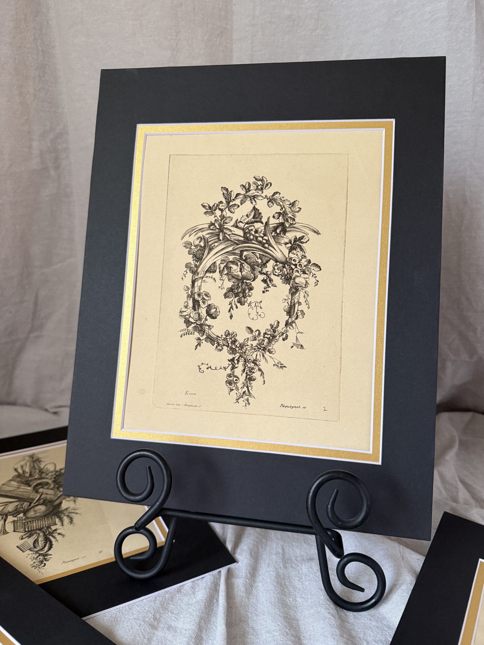 The engravings were created by Auguste Péguénot after paintings by French artists De La Fosse, Eisen, Bachellier, and many others.  Each engraving bears the plate marks, original artist’s name, the printer’s information, and is matted under new black-and-gold mats.  Overall dimensions are 14″ x 11″; the actual book pages measure approximately 12.25″ x 9.25″.  Very good antique condition and ready to frame or display on an easel (not included).