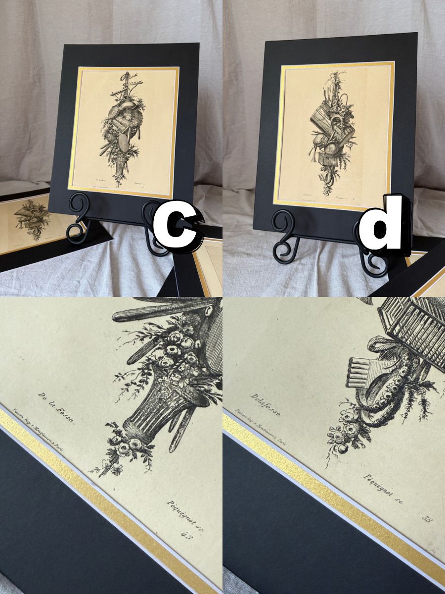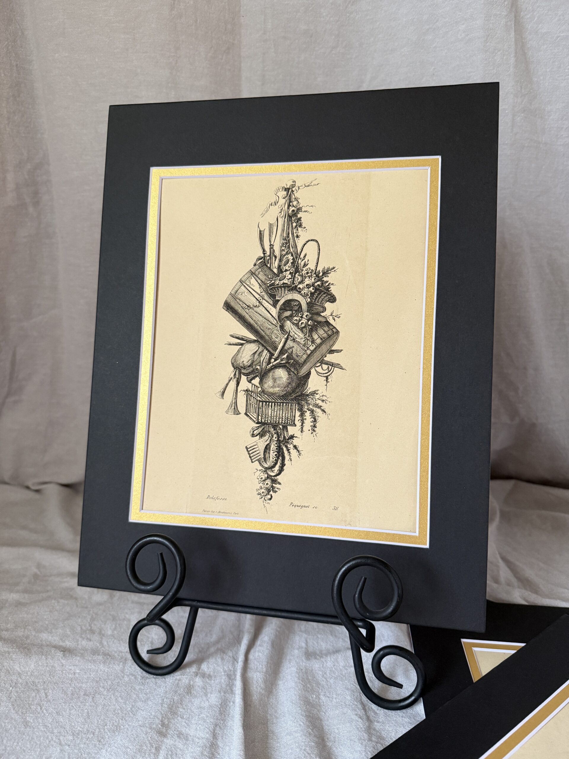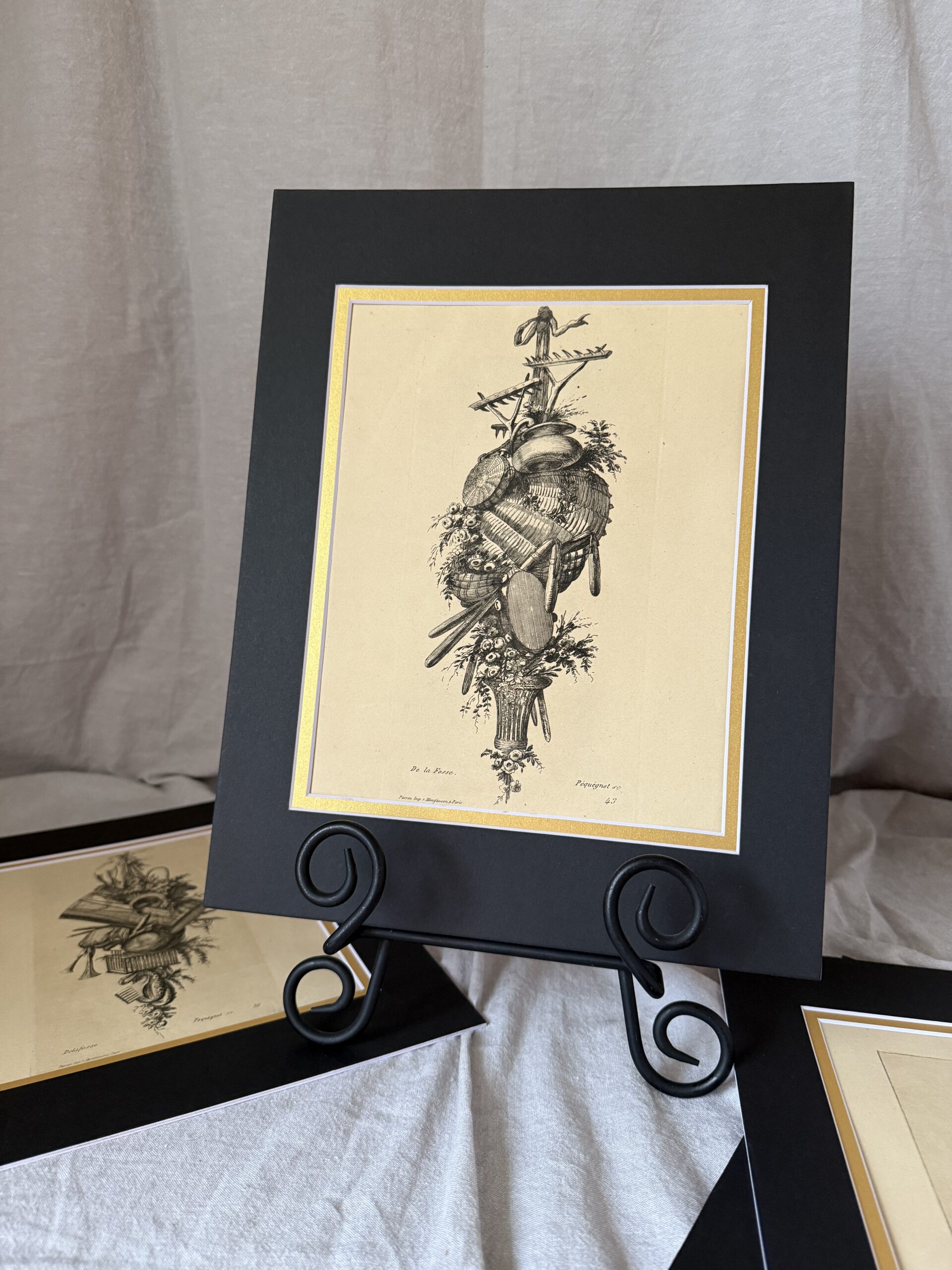 The engravings were created by Auguste Péguénot after paintings by French artists De La Fosse, Eisen, Bachellier, and many others. Each engraving bears the plate marks, original artist’s name, the printer’s information, and is matted under new black-and-gold mats. Overall dimensions are 14″ x 11″; the actual book pages measure approximately 12.25″ x 9.25″. Very good antique condition and ready to frame or display on an easel (not included). (D has some pencil doodles on the back.)