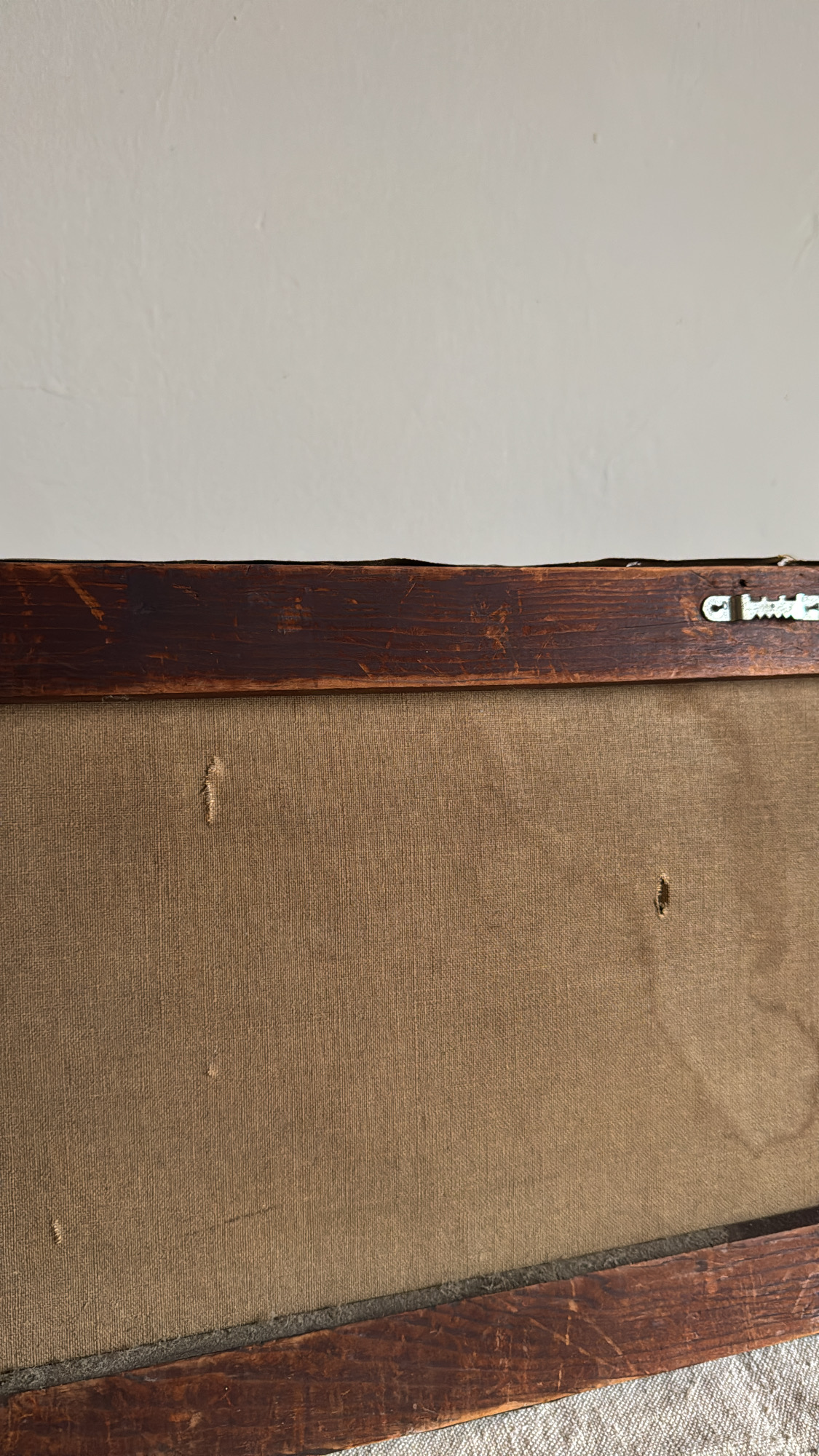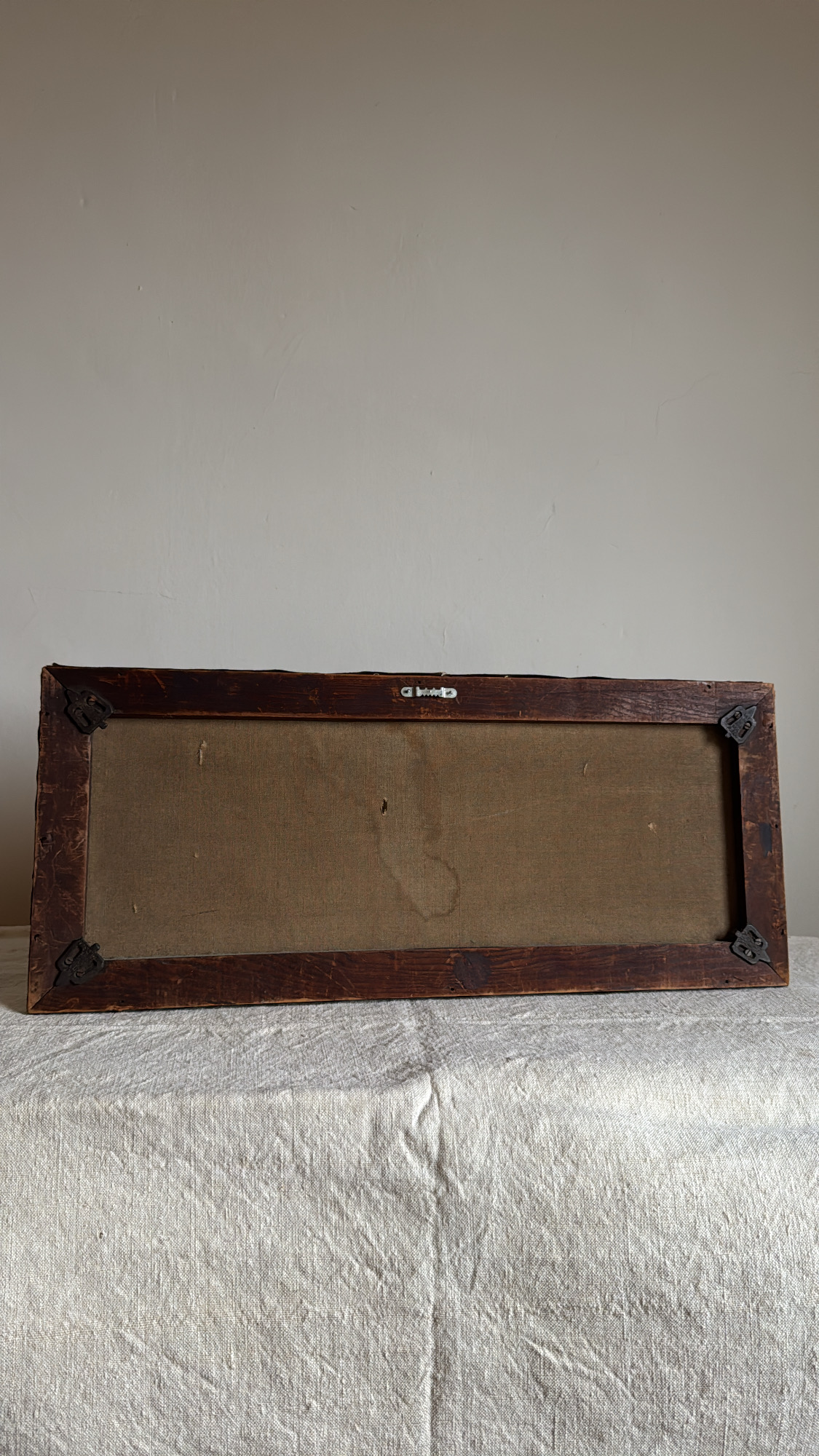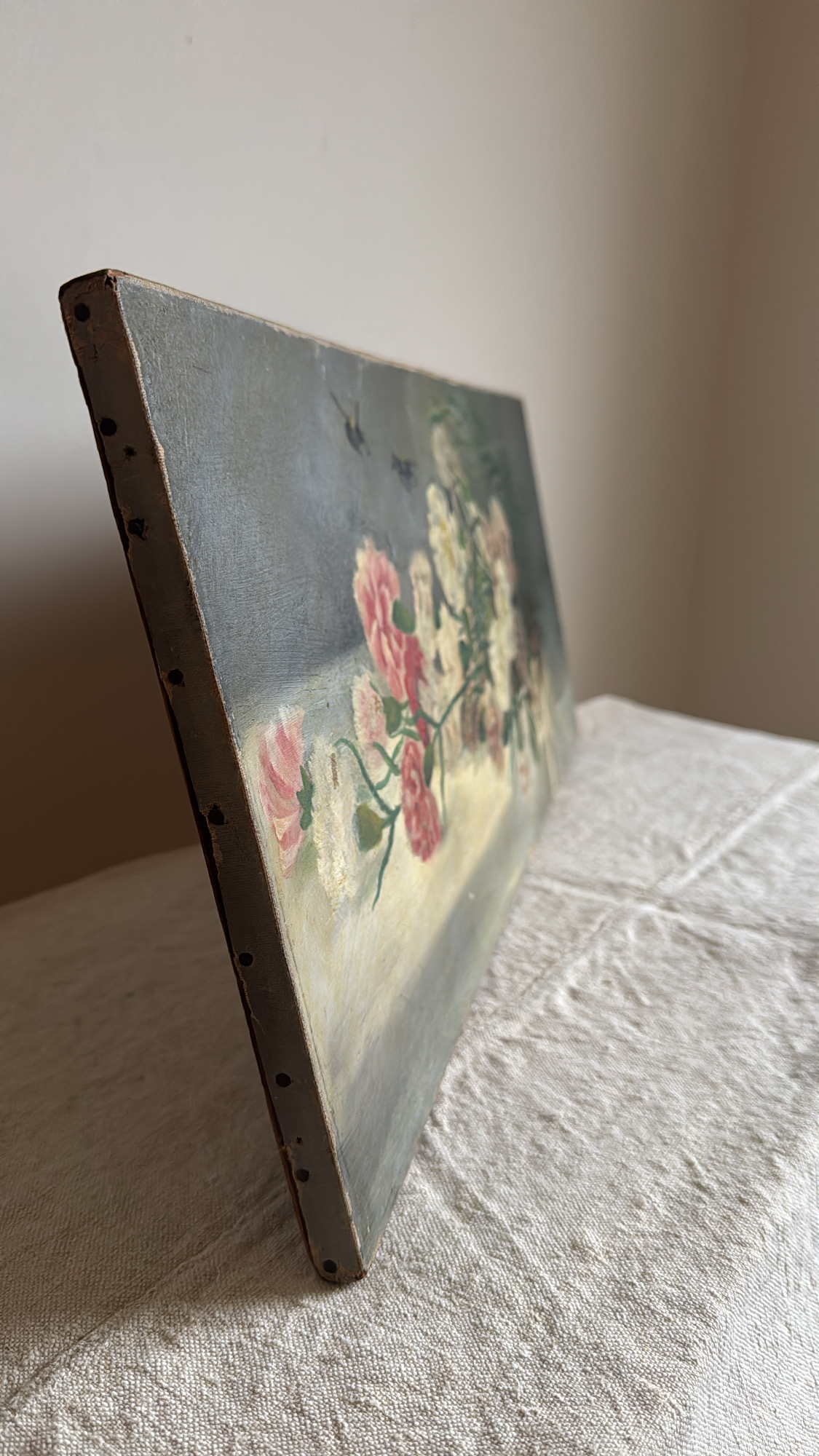 A beautifully aged floral still life rendered in soft, muted tones of ivory, blush, and green. This antique oil painting captures the quiet romance of timeworn blooms, complete with gentle craquelure and a darkened patina that adds to its charm. Framed in its original wooden stretcher—an evocative piece of history perfect for layering into a collected interior. Please note there are two tears in the painting, which I think adds to the patina, and a few of the top nails are missing (see images). Very interesting canvas shape and would look great within a galley wall or hanging above a door or a unique spot.
