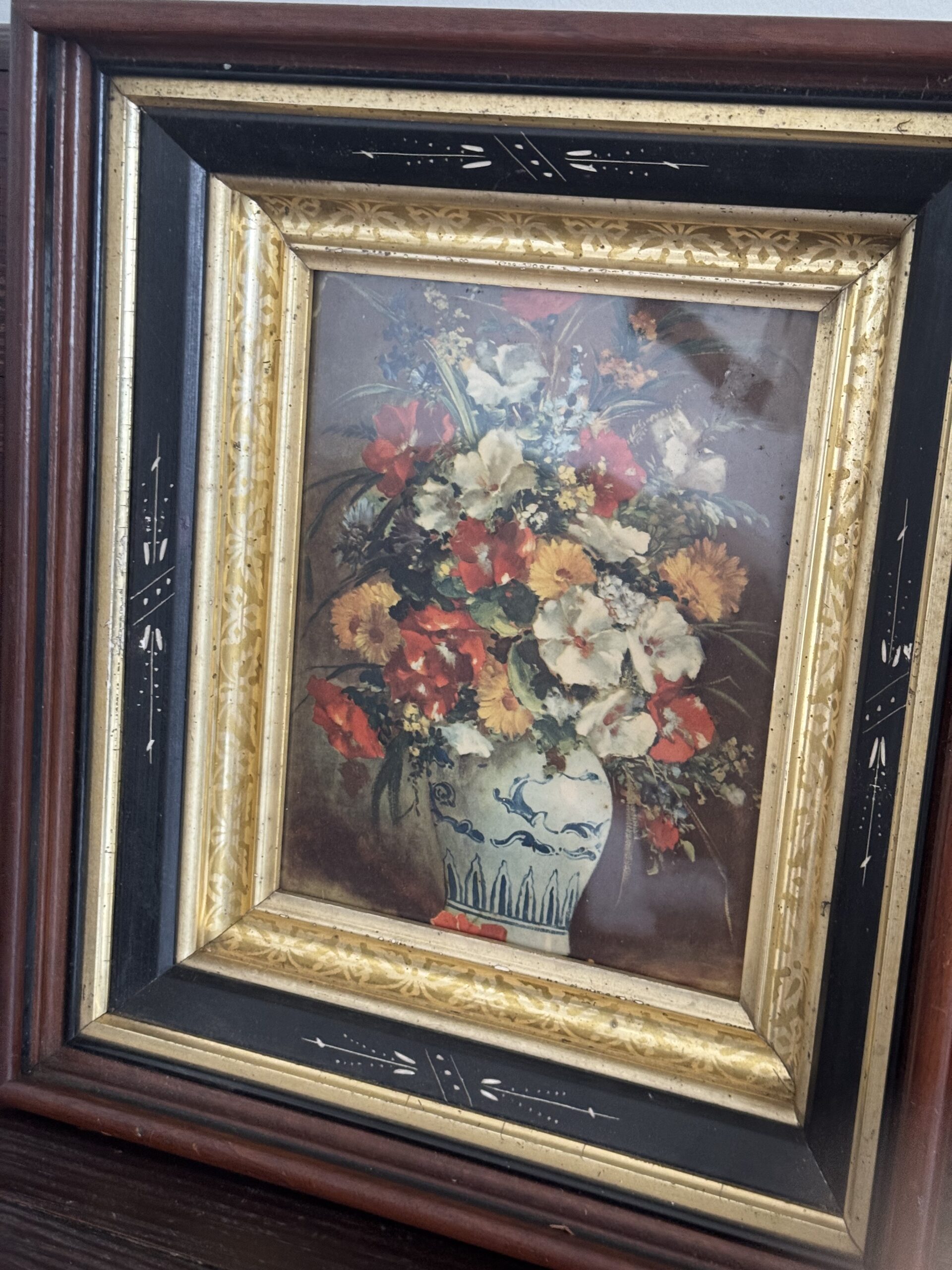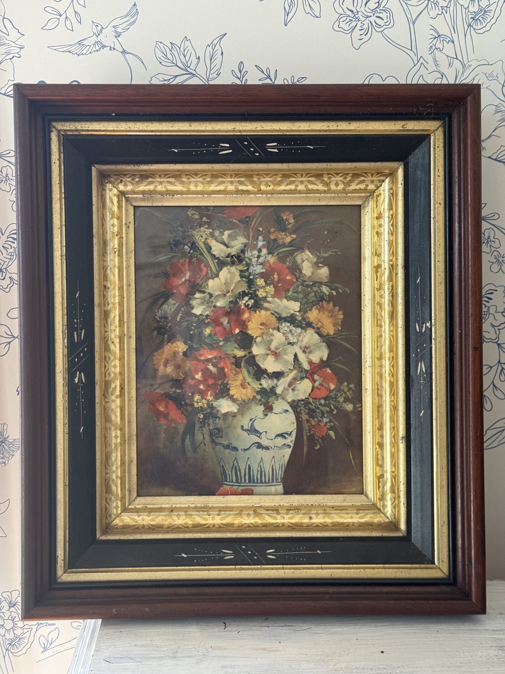Beautiful antique chunky frame, sweet floral print under glass.