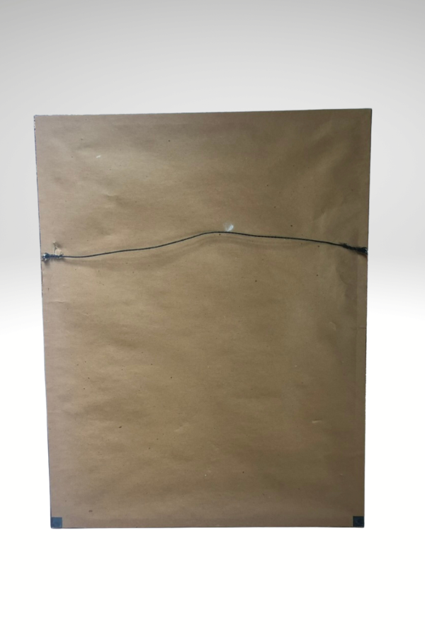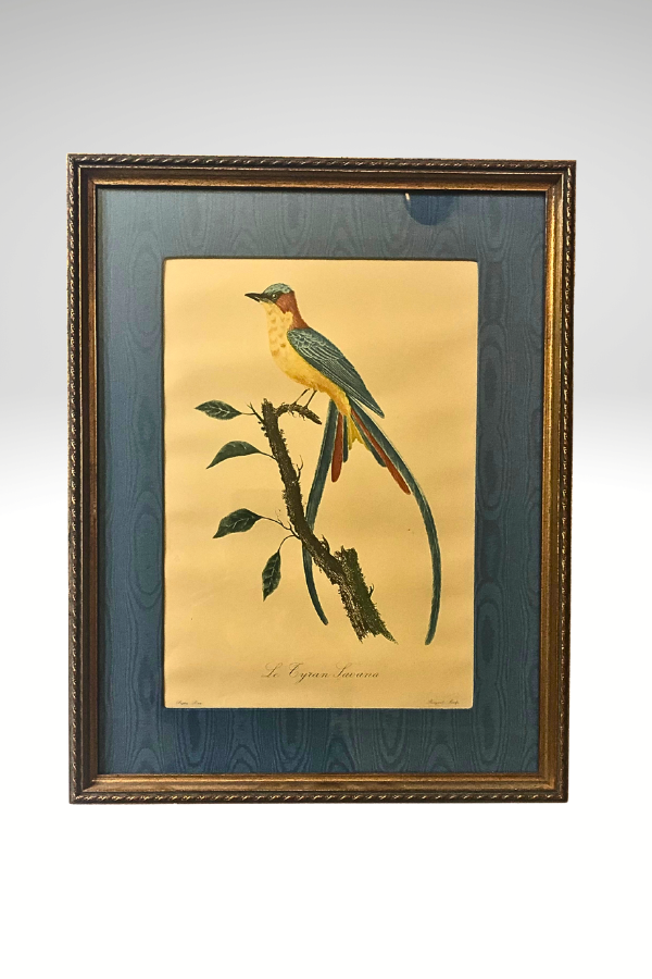 Beautiful sapphire blue, silk-look mat and gold painted frame. Print has browned a bit over the years and shows a little rippling in the mount.