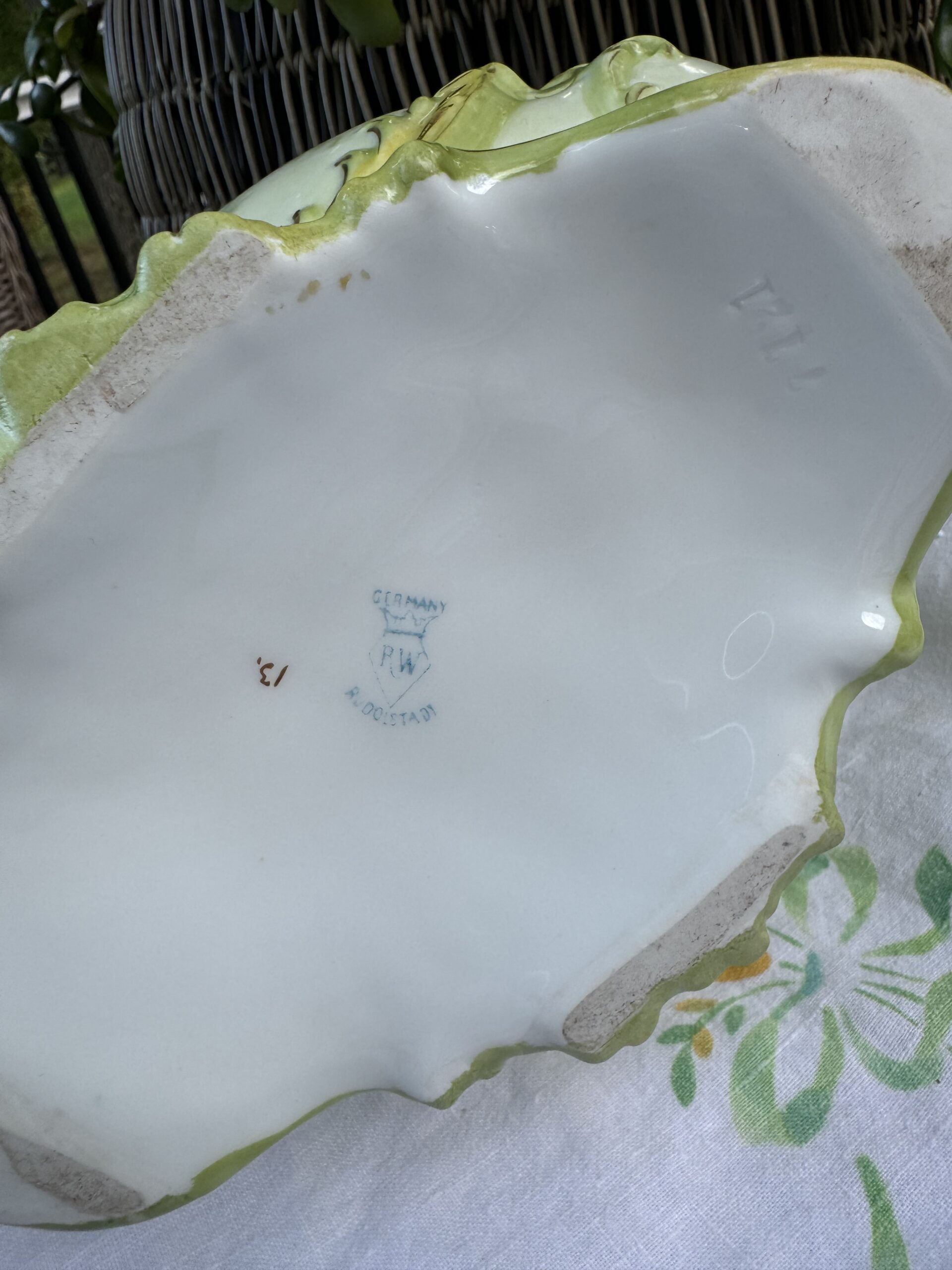 Antique German porcelain jardiniere by Ruldostadt. Triple marked with markers stamp, gilt “13”, and etched numerals. Hand-painted floral motif on front, back and sides. One small chip to inner lip can be seen in 3rd photo.
