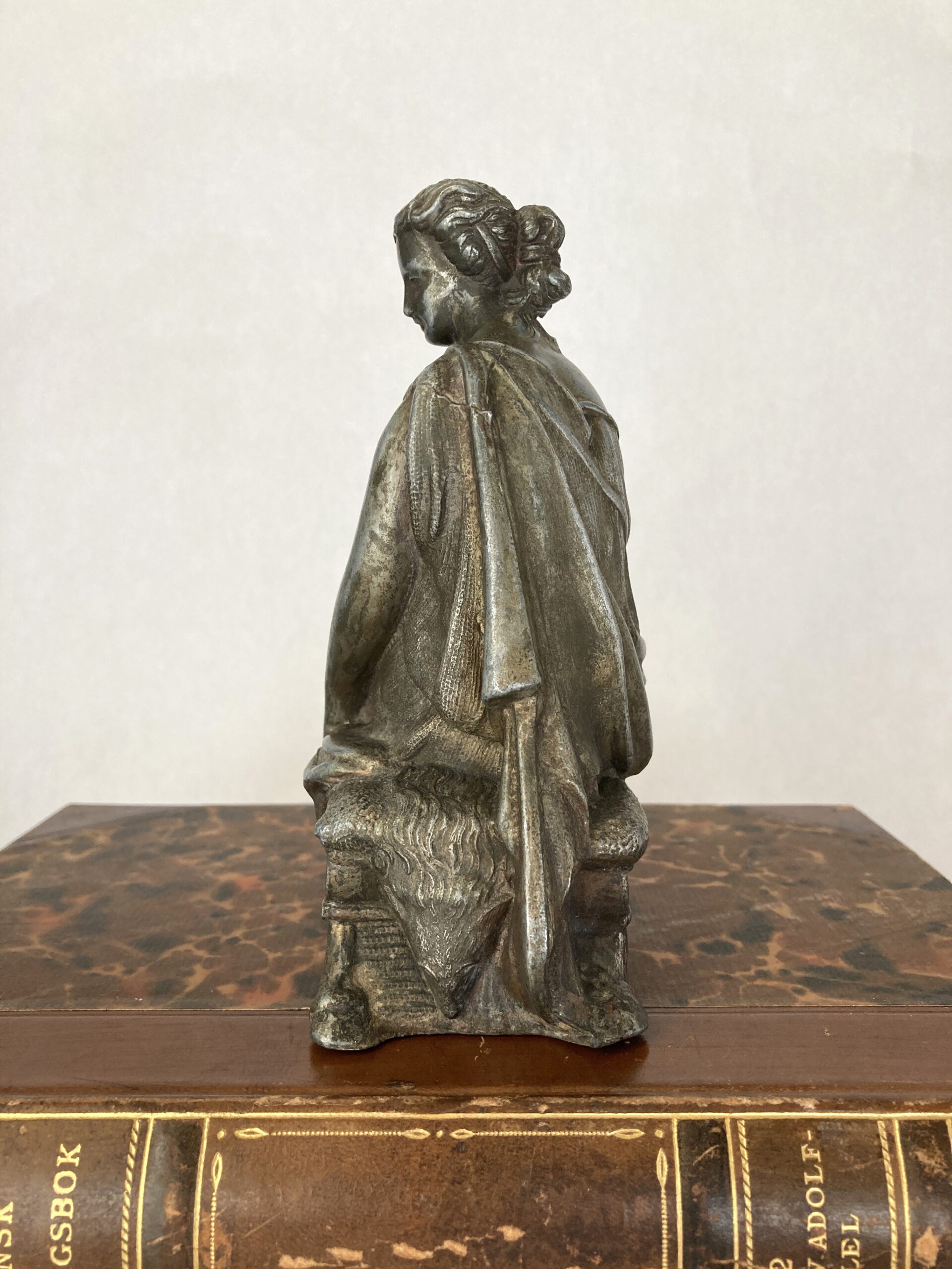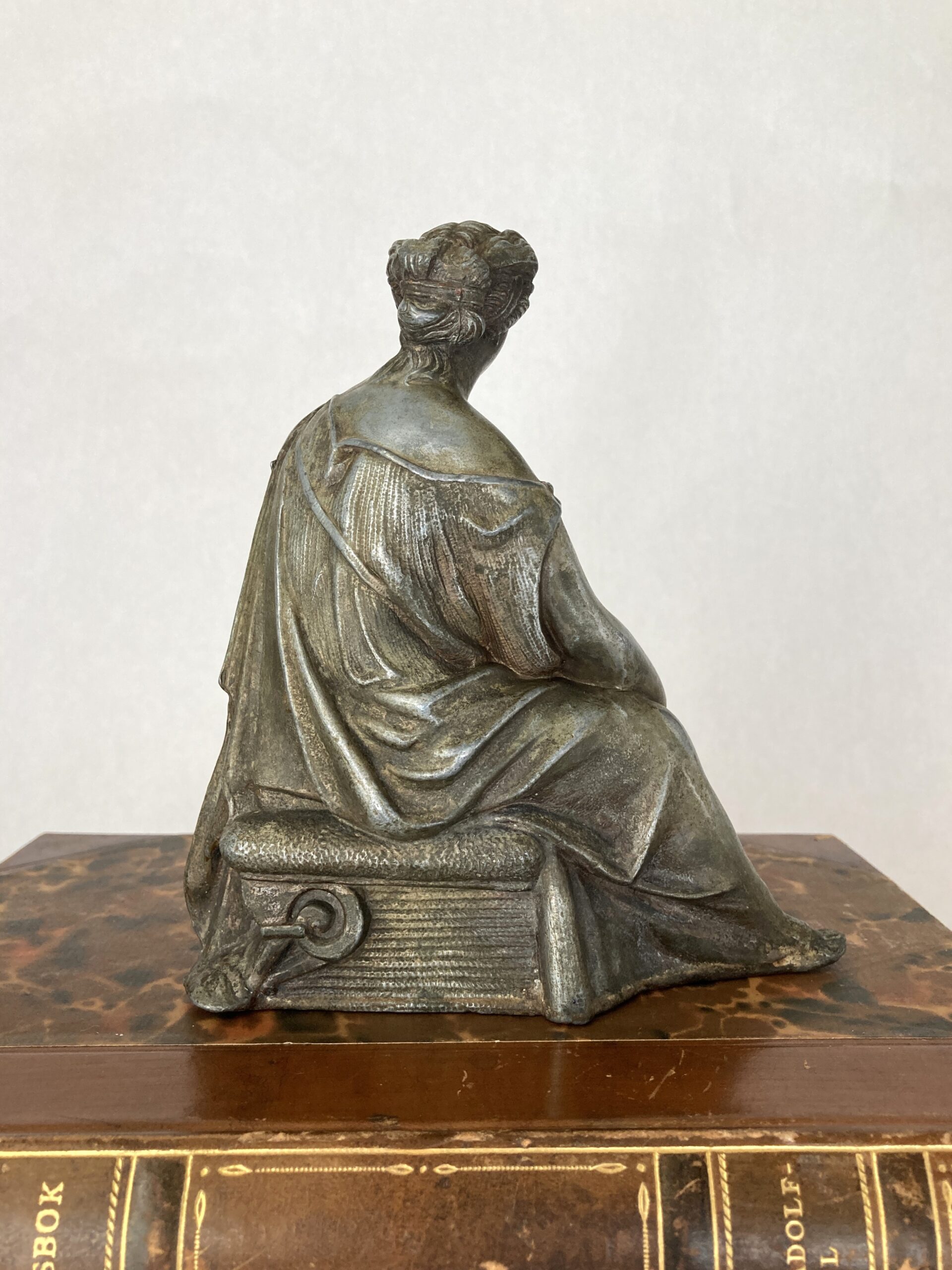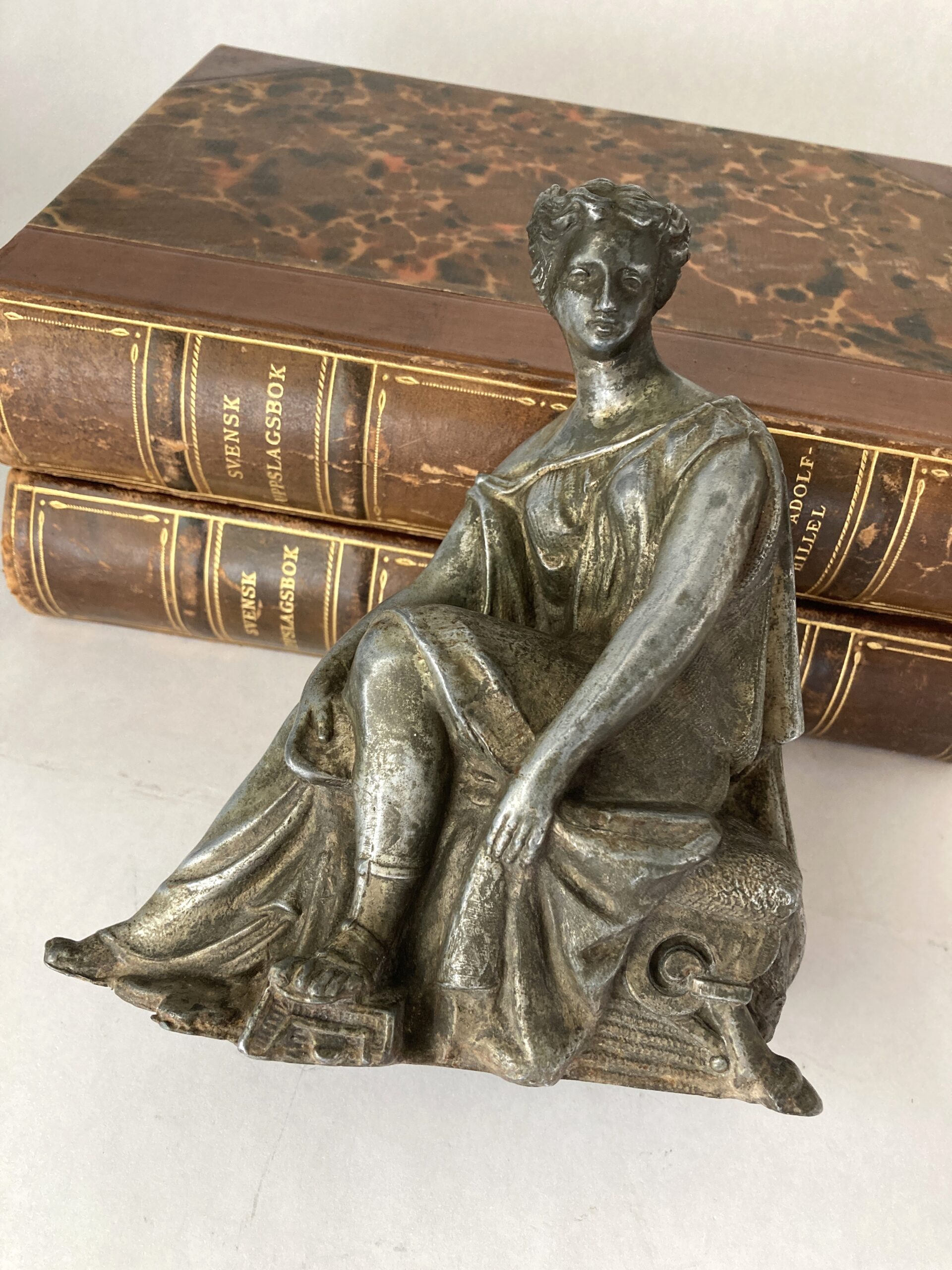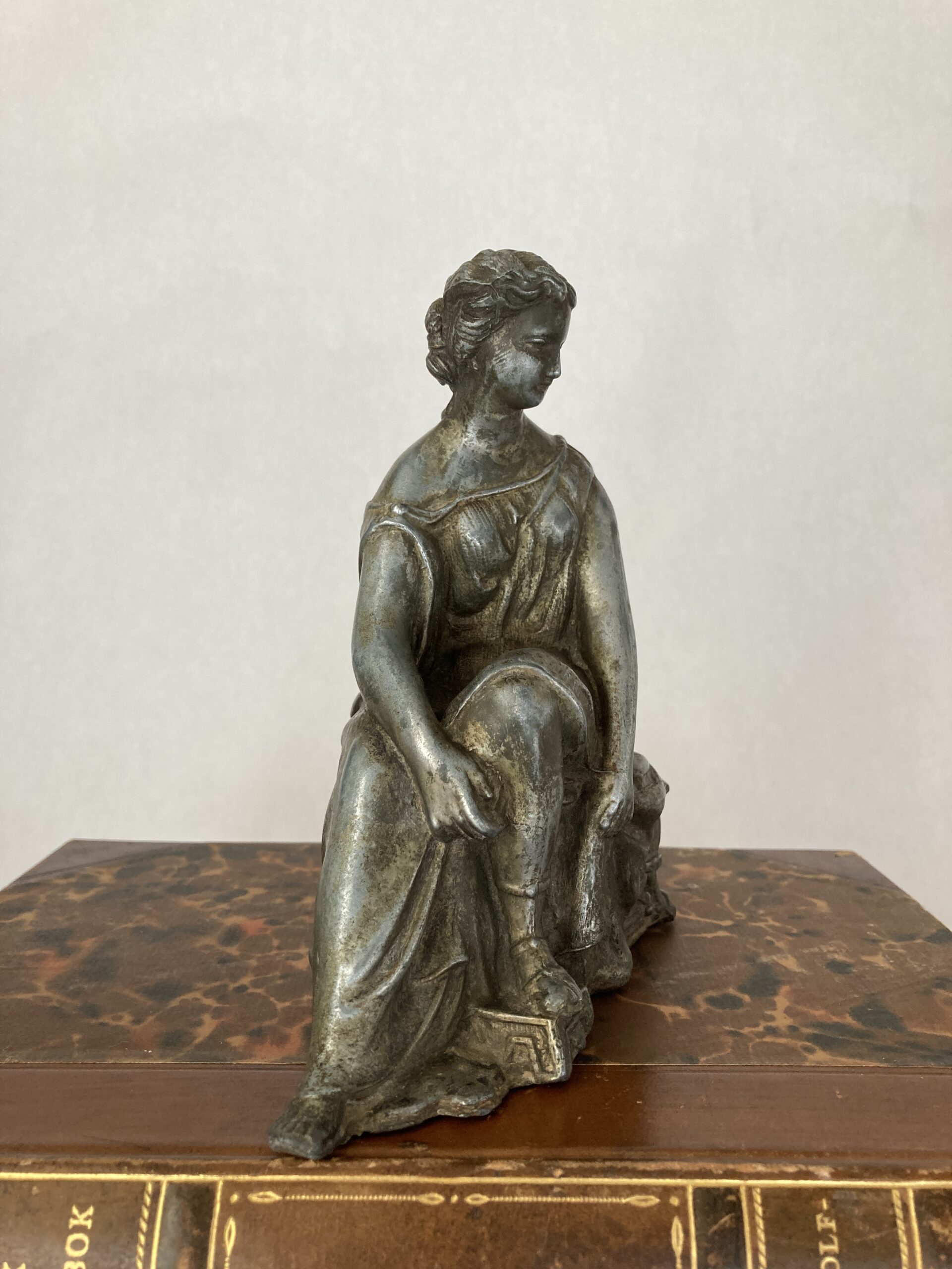 This elegant antique clock topper features a seated classical female figure, finely cast in spelter with a dark bronze-like patina. Likely dating from the late 19th to early 20th century, she embodies the neoclassical style popular in French and European decorative arts of the period. The figure is draped in flowing Greco-Roman robes, intricately detailed with gathered folds and a cinched waist. Her attire leaves one shoulder exposed in the classical tradition, suggesting both grace and strength. Her sandaled feet rest atop a stylized architectural fragment—possibly a broken column or scroll—reinforcing the theme of antiquity. Her hair is worn in an elegant updo, parted in the middle and gathered into symmetrical coils or buns, reminiscent of ancient Roman coiffure. A soft expression and serene gaze enhance her timeless beauty, while the scrollwork and fluted base beneath her seat suggest she once crowned a decorative mantel clock or garniture set. She’s seated on a taxidermy stool with horn feet and animal head–see photos. This piece is hollow cast, as was typical for the era, and measures approximately 6 inches tall. A charming example of neoclassical revival artistry, perfect for collectors of antique clocks or figural sculpture. It measures 6″ x 5.5″ x 2.5″ and is in very good antique condition. Great shelf-styling piece/addition to a collection of Greco-Roman art.