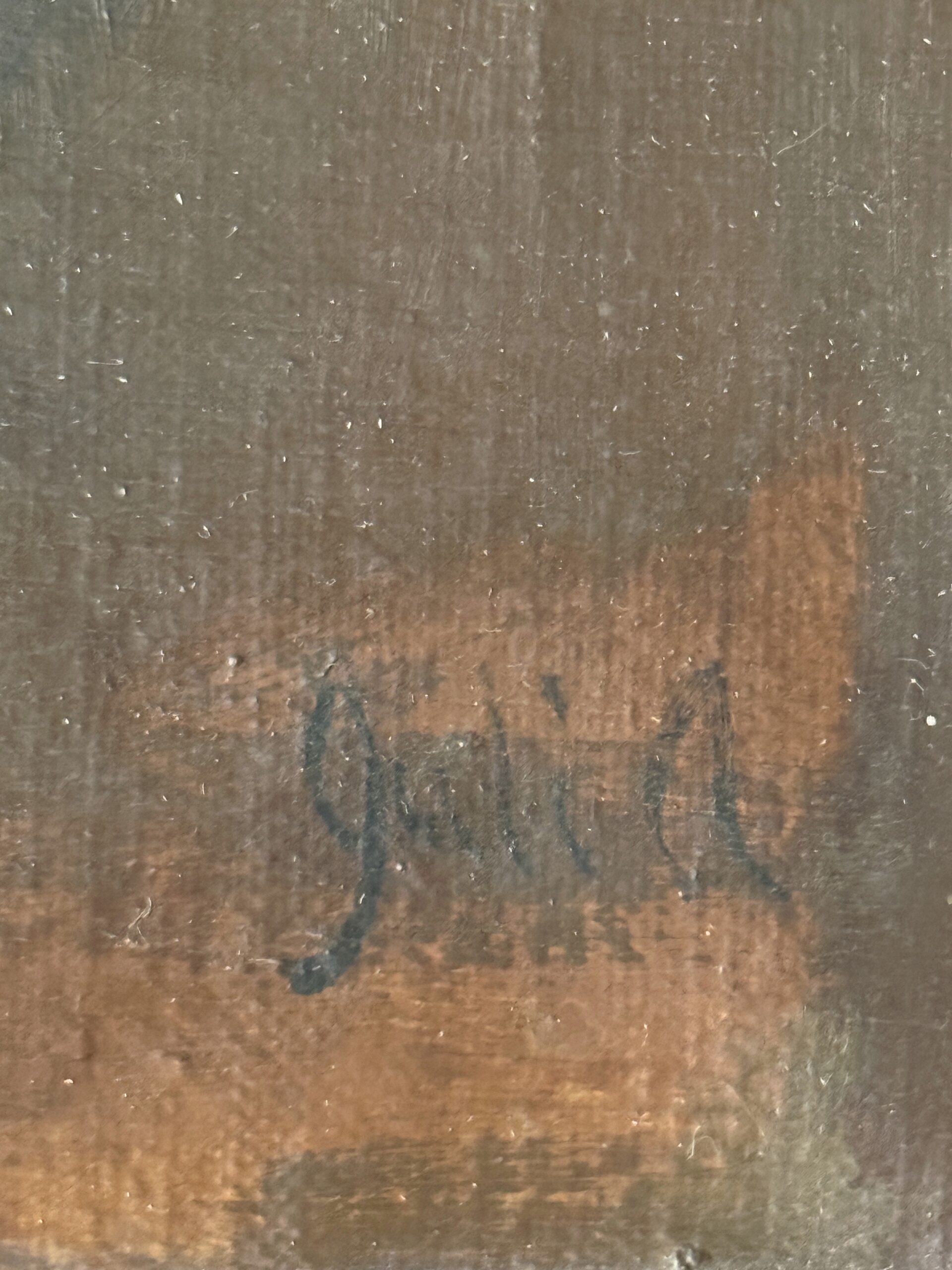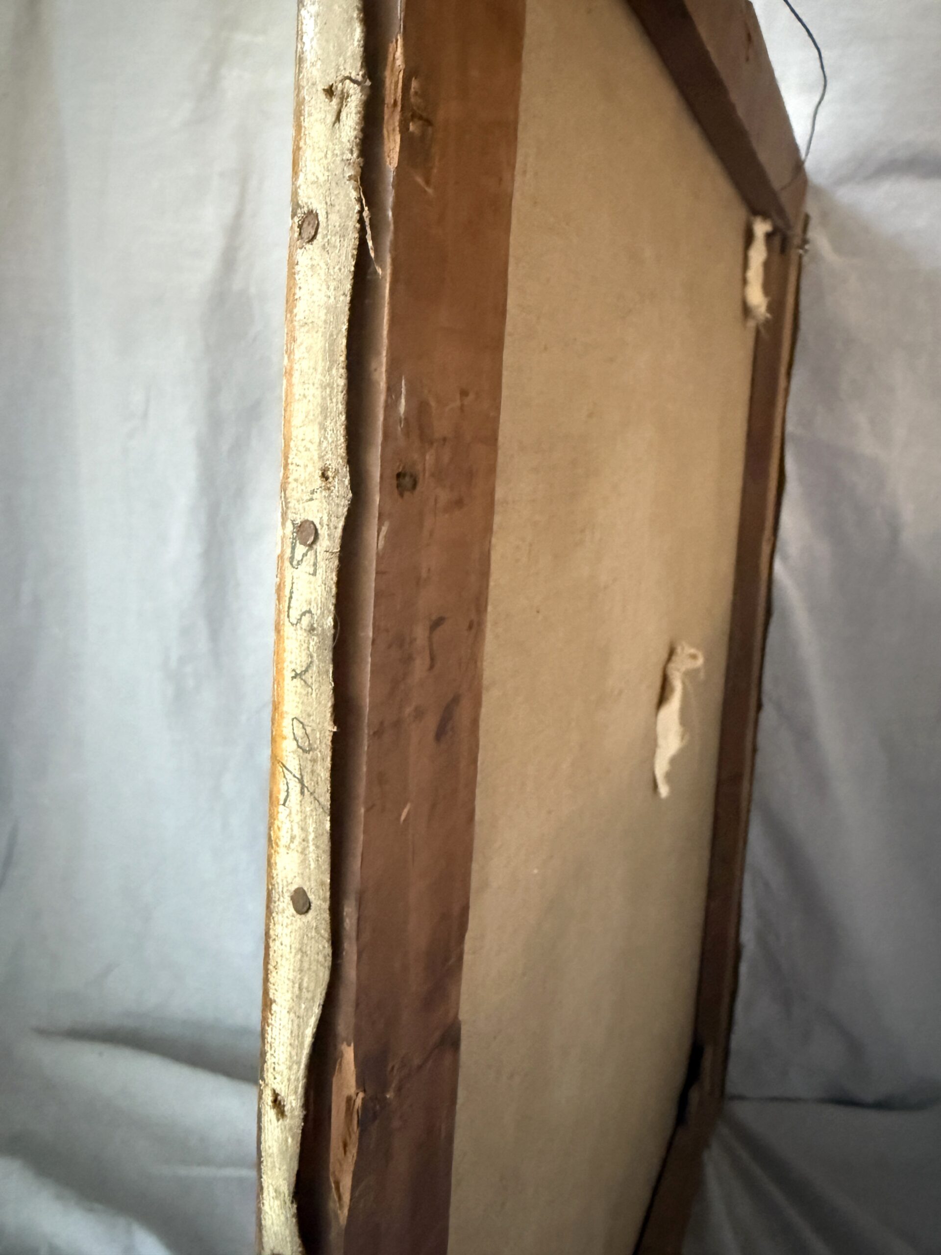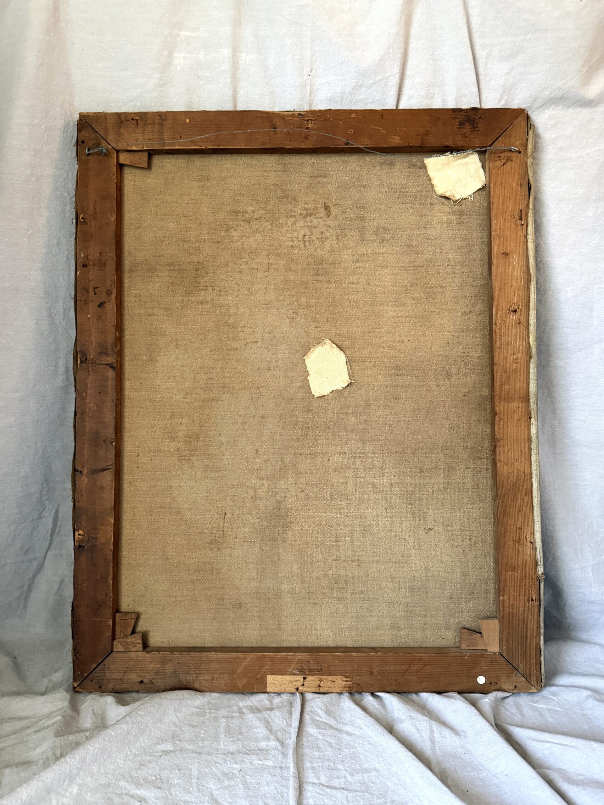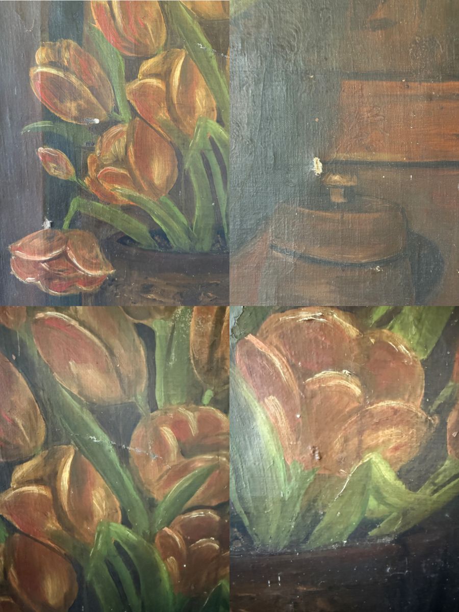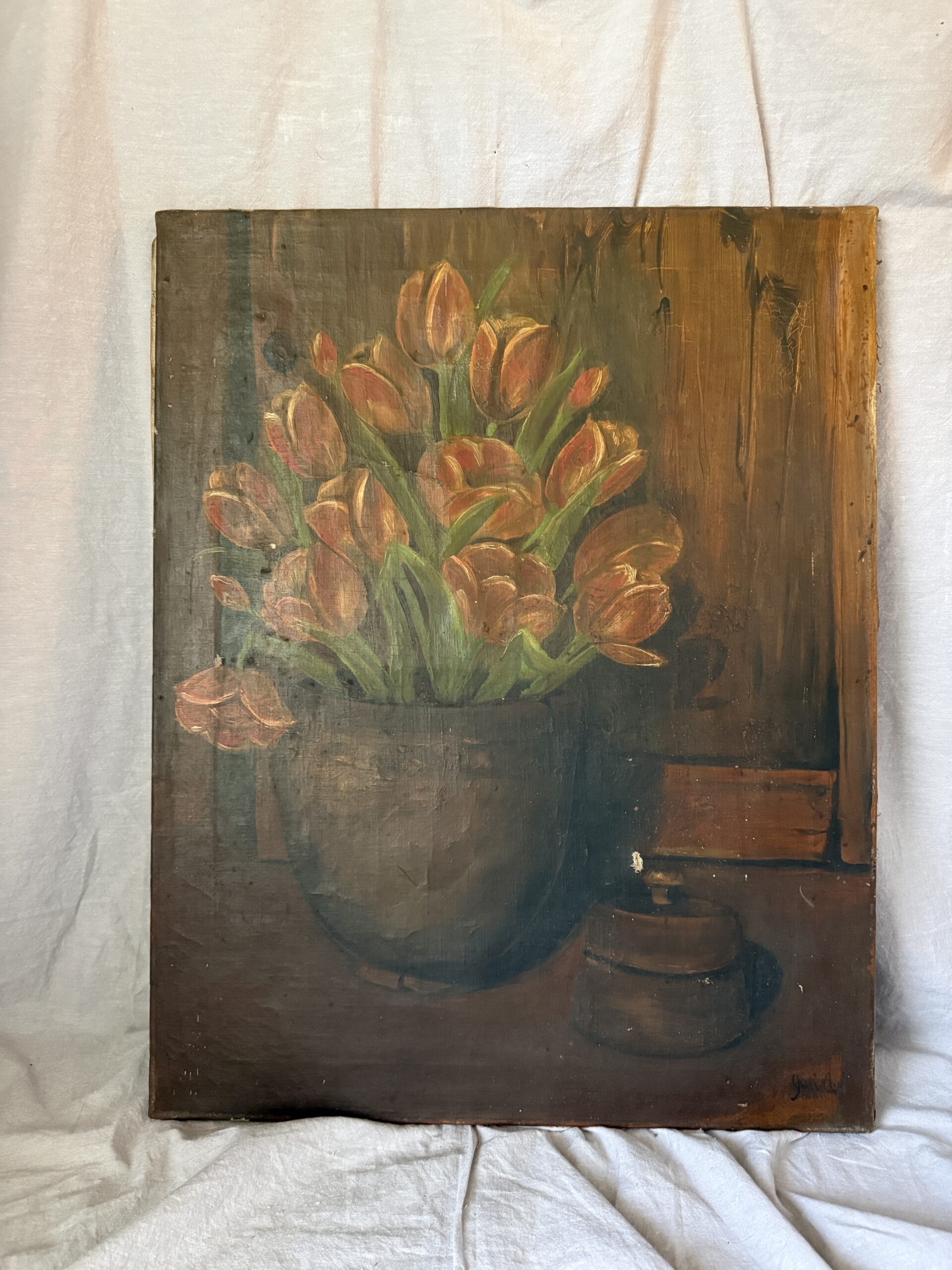 Large antique oil painting of red and yellow tulips in a brown stoneware jug.  An antique butter mold is seen in the foreground right; wood paneling or a cabinet front in the background.  It’s signed on the bottom right but illegible (Juli A??  JuliA??)  The canvas is attached to the wooden stretcher with tacks and is labeled on the side with the dimensions 71 x 55, approx. centimeter-equivalent to the size in inches (28″ x 21.75″), which points to a European origin.  There are a couple of repairs done from the back side, as well as a couple of other areas of damage and paint loss as seen on the front–overall, a rustic, worn look, but still holding lots of moody appeal and charm.  NOTE: it’s darker in person than in the photos.
