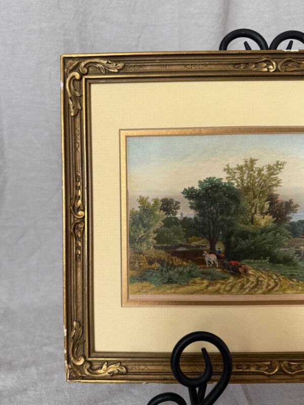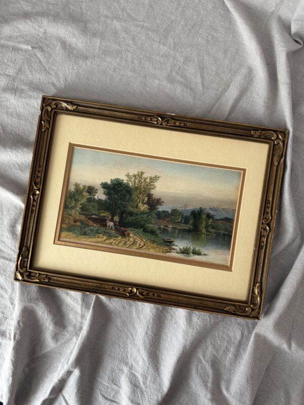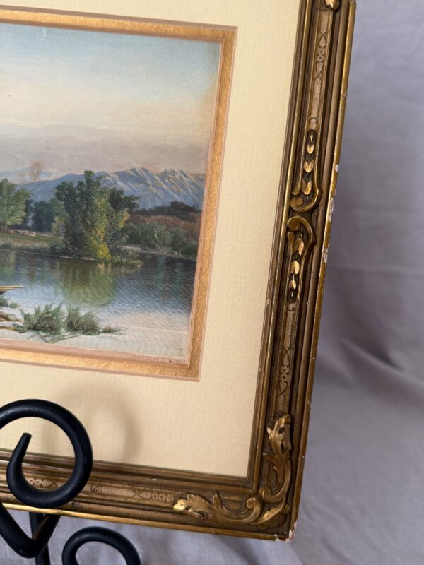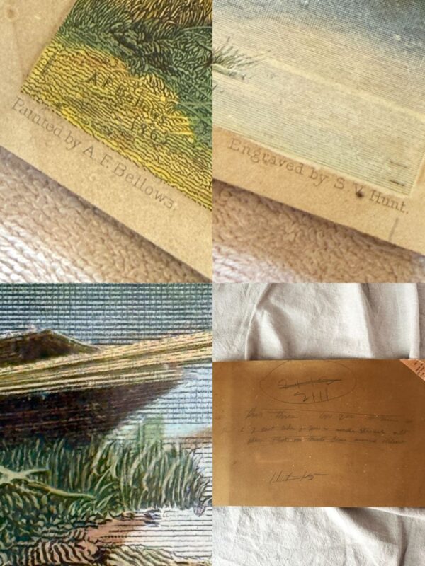 Antique steel engraving by S. V. Hunt after A. F. Bellows’ 1863 painting “The Housatonic” in gilded gesso-on-wood frame, double-matted under glass (history below). Stunning coloration. Signed on the plate: “A. F. Bellows 1863”; legend, bottom left: “Painted by A. F. Bellows”; bottom right: “Engraved by S. V. Hunt”; center: ” Entered according to Act of Congress A.D. 1864, by M. Knoedler, in the Clerk’s Office of the District Court of the Southern District of N. York.” There’s a note to the framer handwritten in pencil on the back of the engraving, mostly illegible. Overall measurements are 12.75″ x 9.75. Visible print measures 9″ x 5″. Excellent antique condition with some minor nicks on the frame.