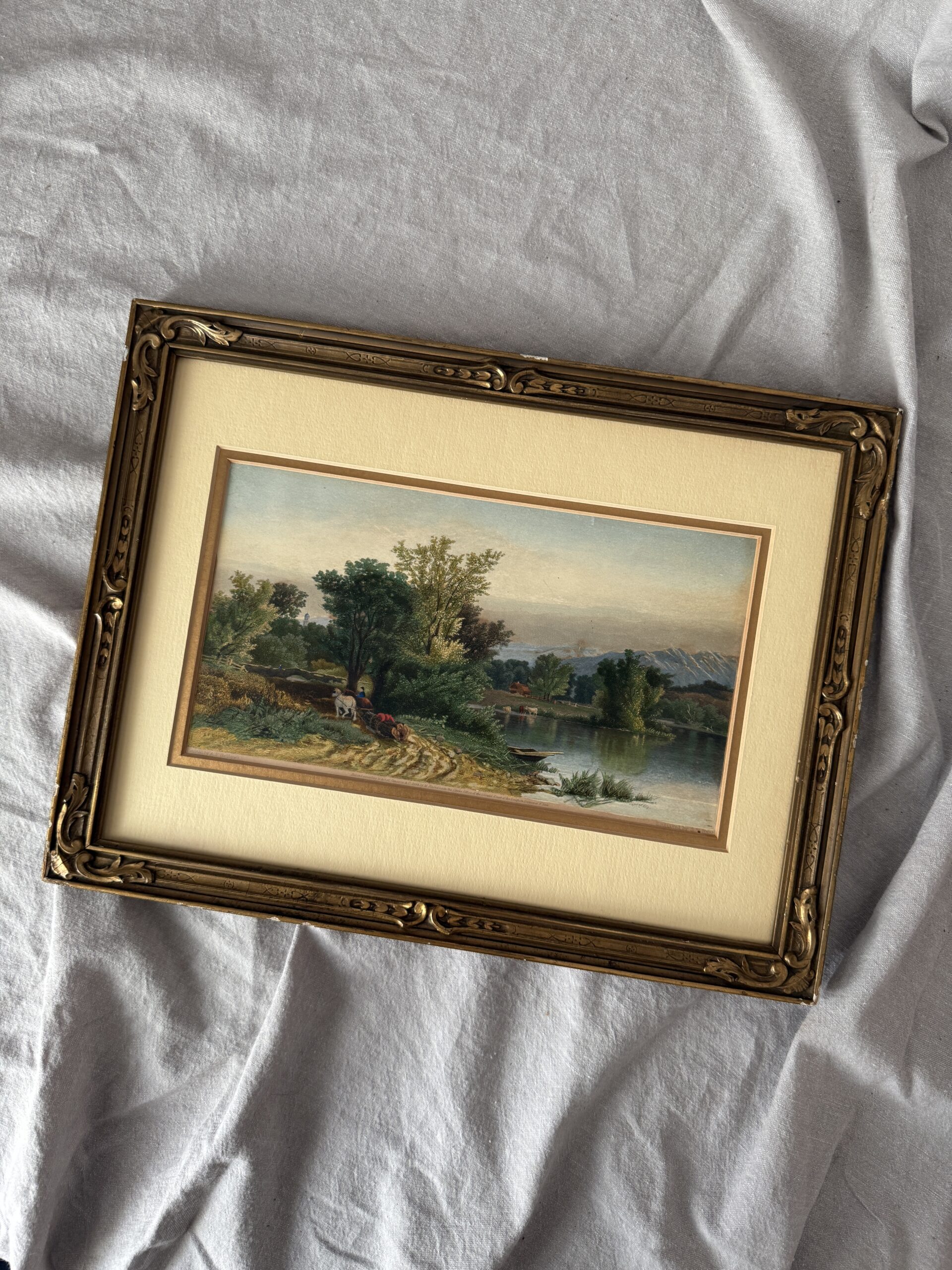 HISTORY (from online sources): “The Housatonic” by Albert Fitch Bellows (A. F. Bellows, American, 1829 – 1883) is a 19th-century of the Housatonic River which flows through western Massachusetts and Connecticut. A monochromatic steel engraving of this painting by S. V. Hunt (Samuel Valentine Hunt, English, 1803–1893), published by D. Appleton & Co., in 1874, appeared in the popular series Picturesque America. The scene depicts a pastoral landscape with cows, a log being hauled by horses, and a distant church spire, capturing the idyllic rural beauty of the river.