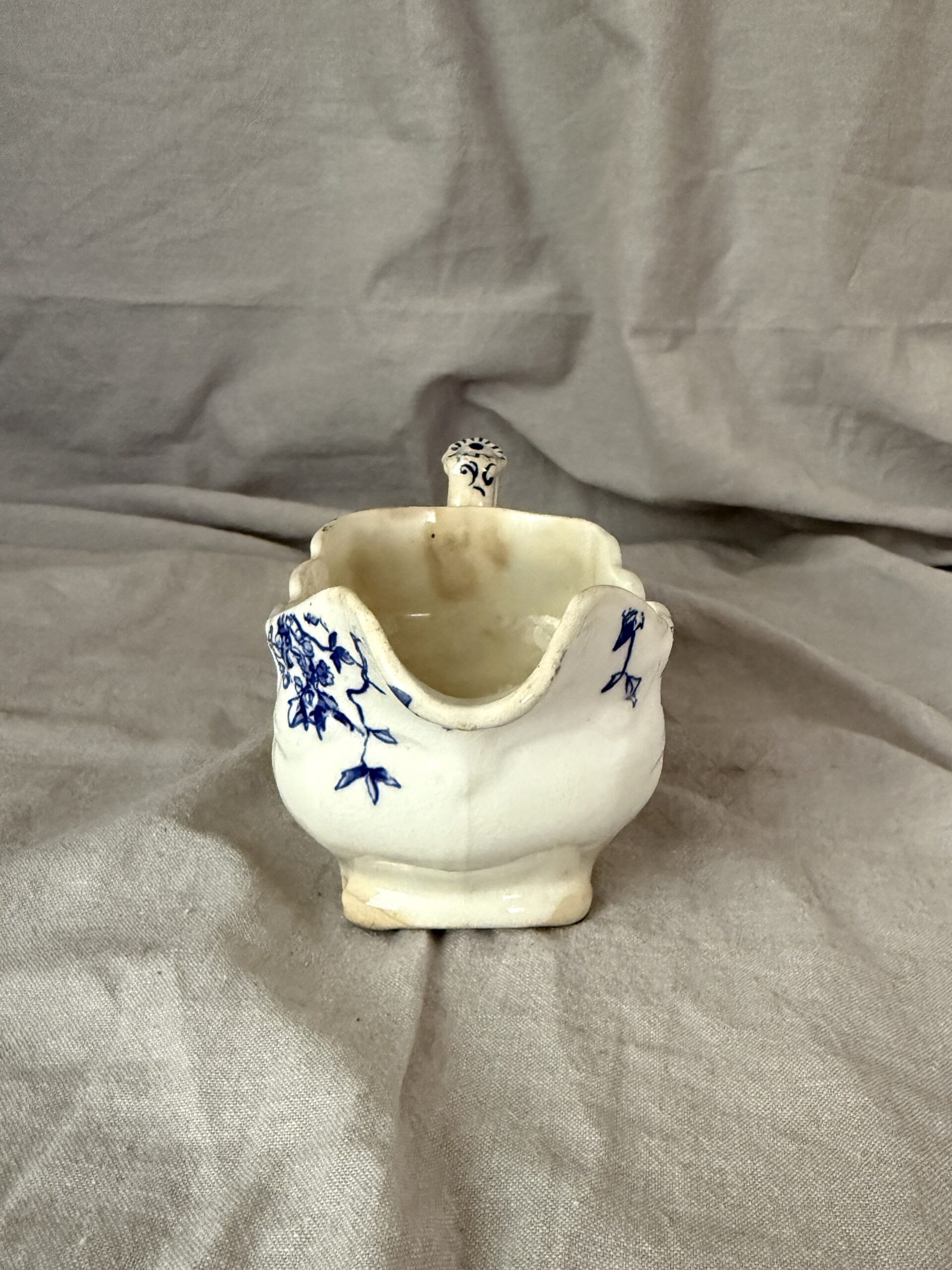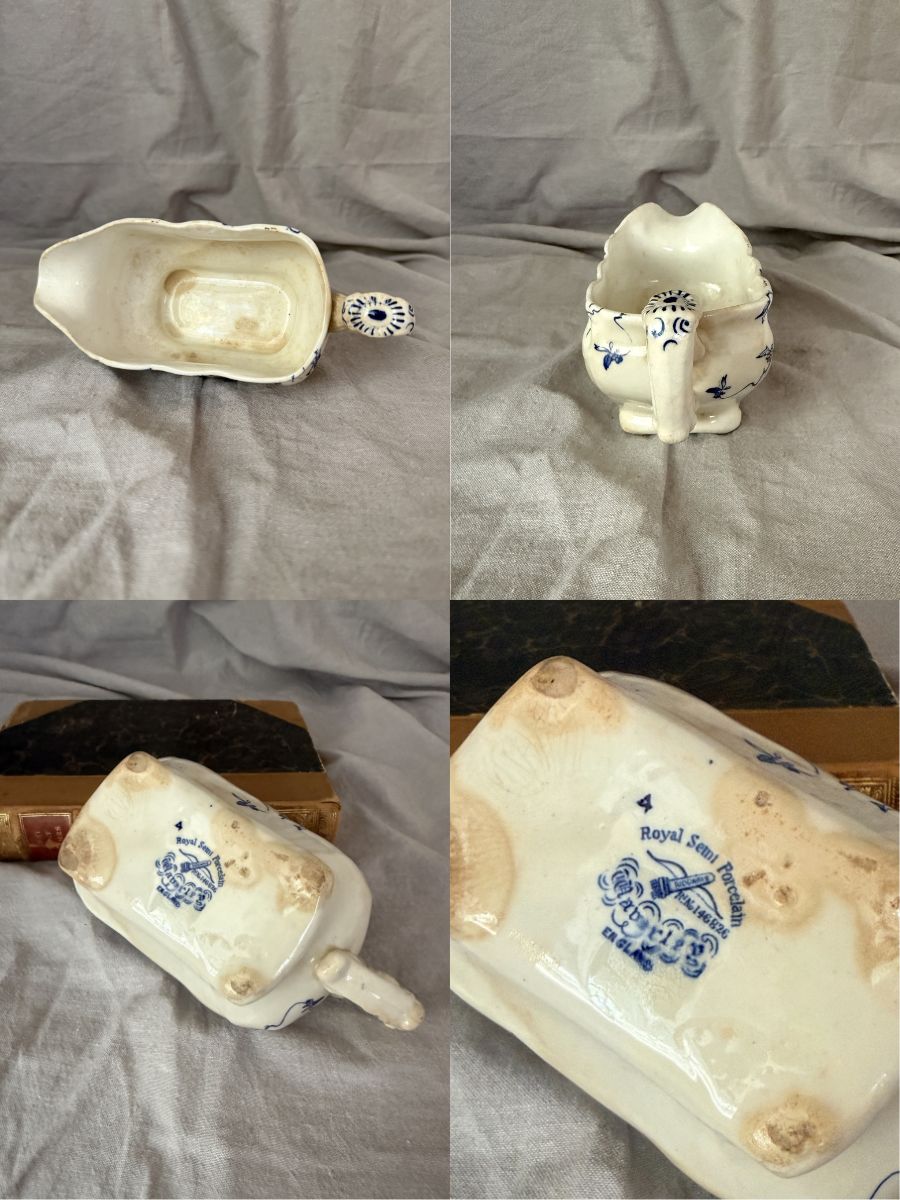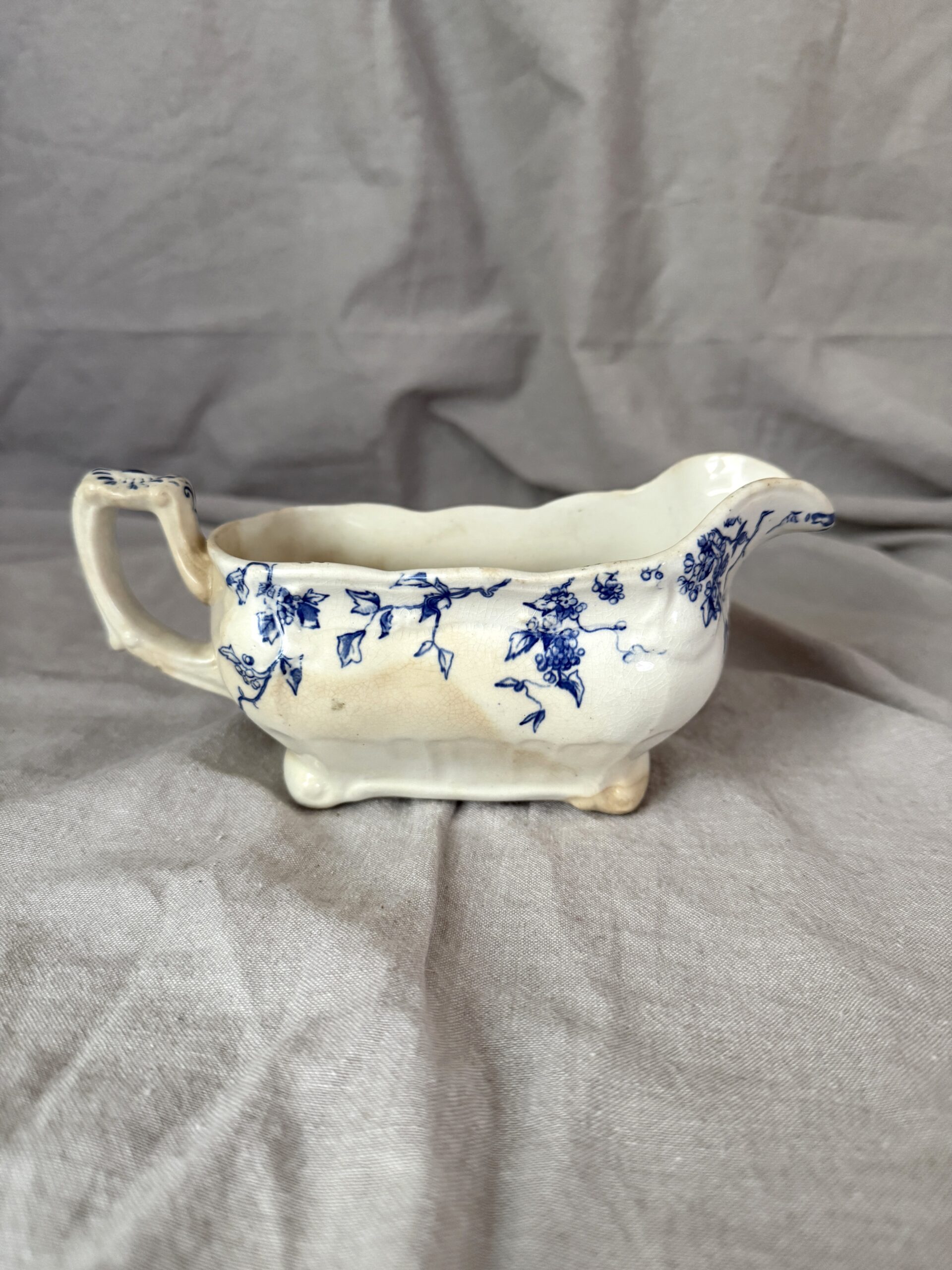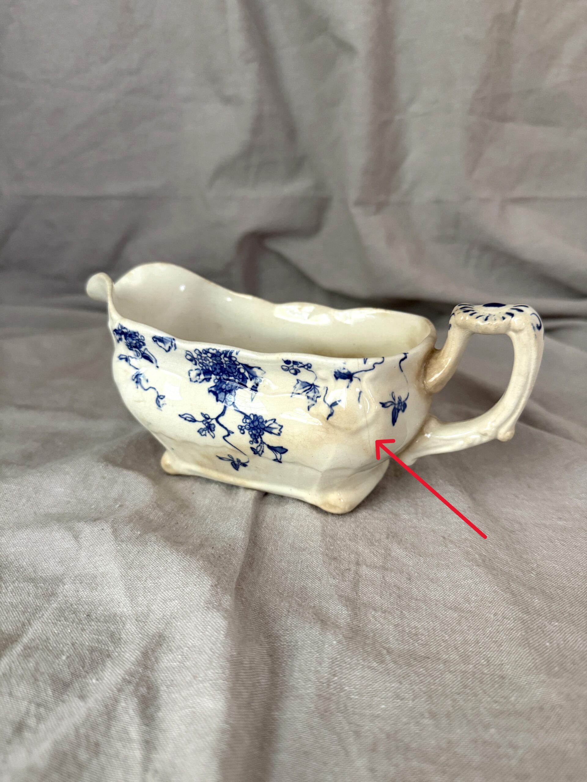 Antique semi-porcelain transferware sauce or gravy boat in the rare blue “Waverley” pattern by Ridgways, made in England. It features an embossed design along the rim, base and on the handle, as well as a floral motif cascading from the rim towards the base. The thumb grip on the handle features a geometric medallion-style accent. The underside is marked “Royal Semi Porcelain, Ridgways [with bow and quiver logo], Rd. No. 146826 [English Registry number corresponding to the years 1890 – 1891], Waverley, England,” and the number 4. It measures about 8″ spout to handle x 3.5″ at its tallest x 3.25″ at its widest and holds 1-1/2 cups of liquid. Please note that the gravy boat is stained throughout, which lends instant antique character. There is a stable vertical hairline crack near the handle on the left side (holds water–last image) but no chips; otherwise, very good antique condition for age and great addition to a collection of antique blue-and-white dinnerware.