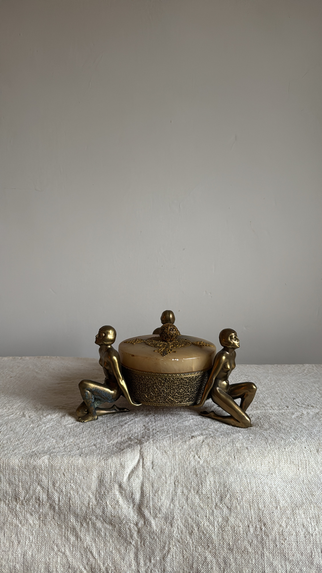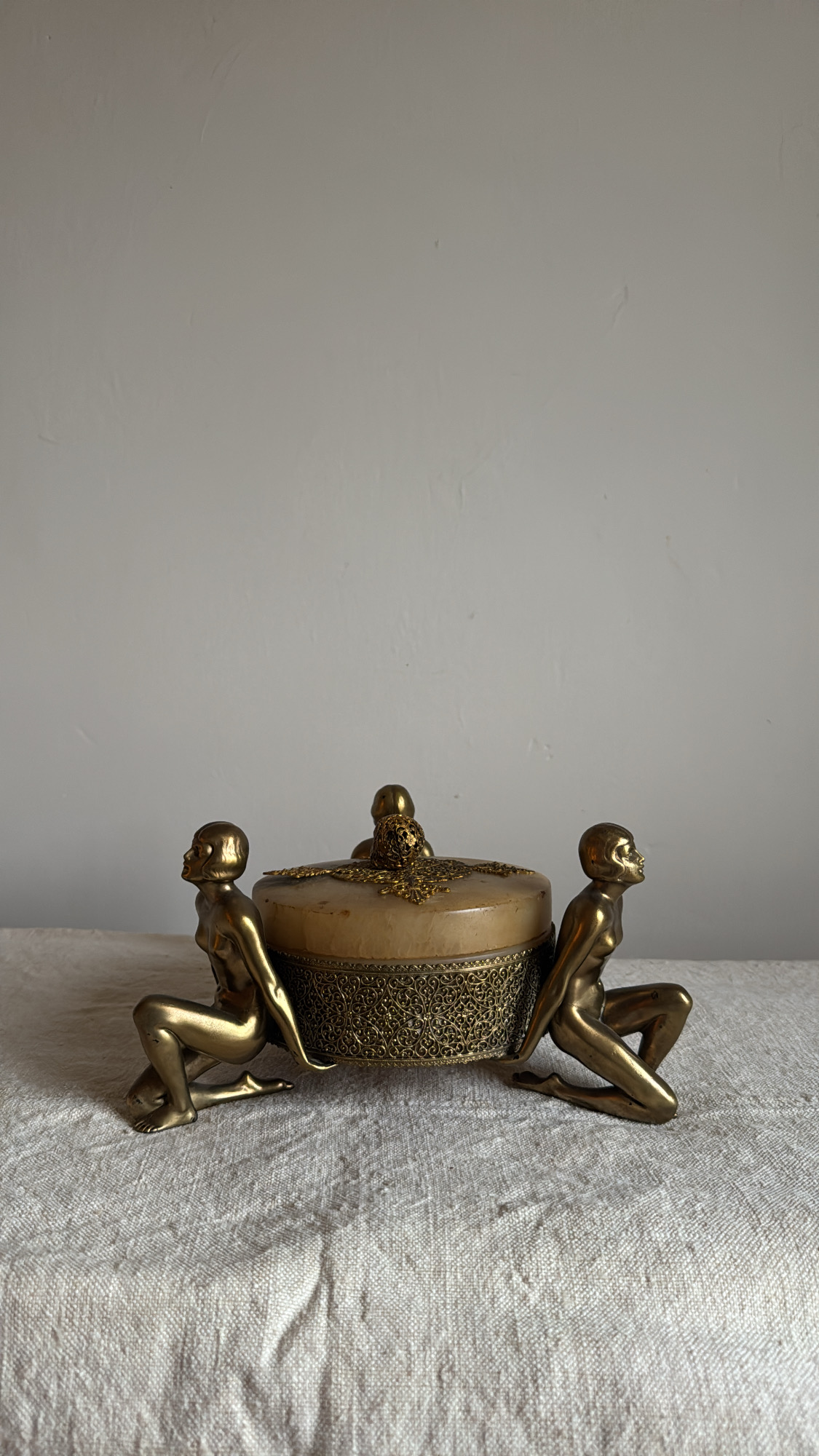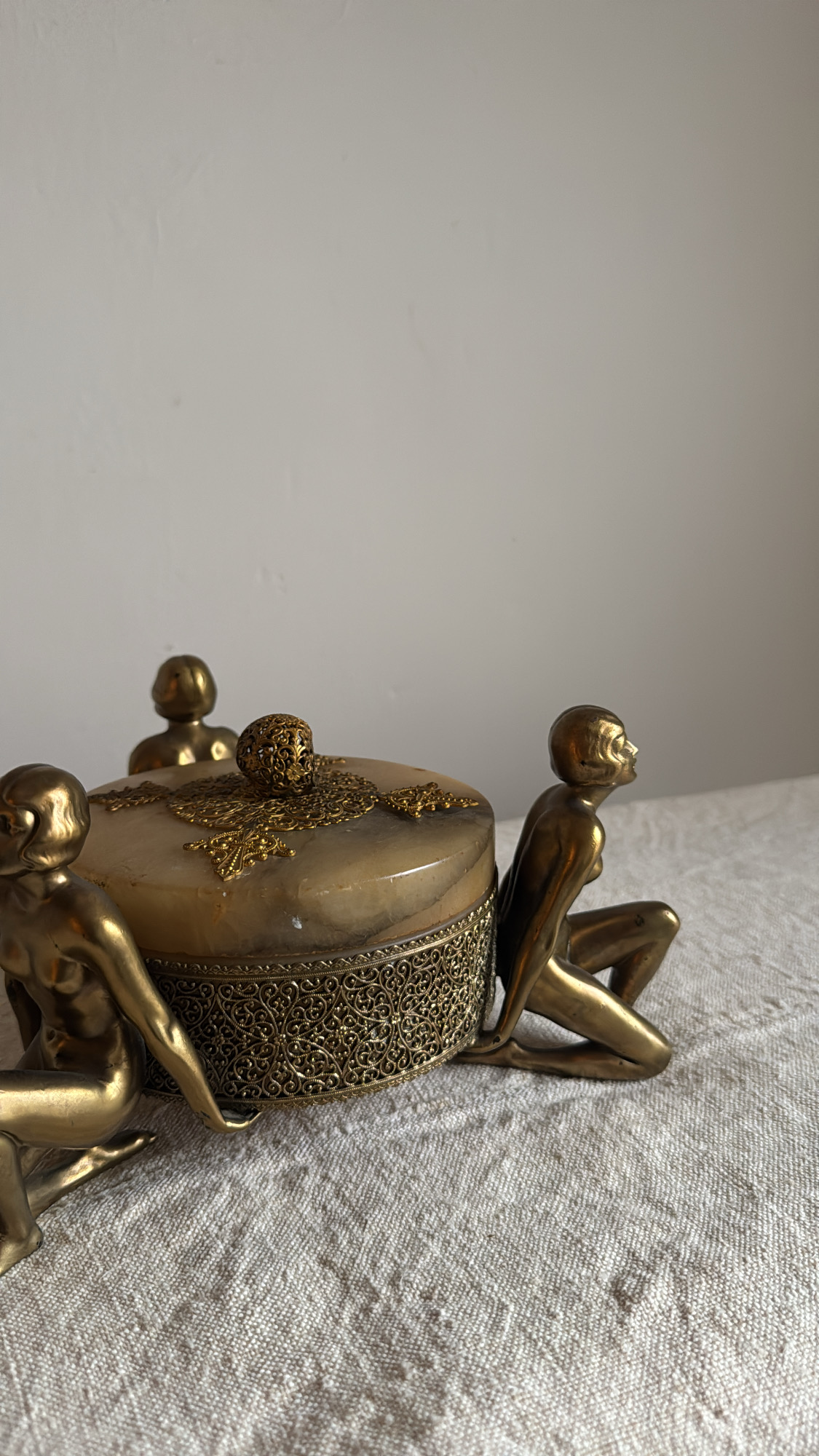 1920s Art Deco Alabaster Jewelry Box with Three Gilded Nude Figures