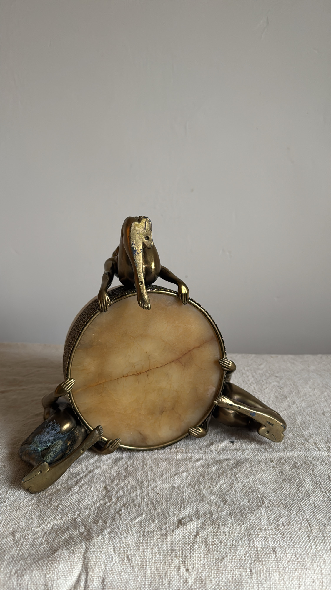 A striking 1920s Art Deco / Nouveau jewelry or dresser box featuring three gilded nude female figures supporting a lidded alabaster vessel. The piece showcases exquisite detailing in both form and finish—an elegant harmony of sculpture and utility. A true collector’s piece that captures the sensual sophistication of early 20th-century design. Vintage patina and wear with one of the lady’s legs (see images), and the round knob on top of the lid is slightly bent (see images).