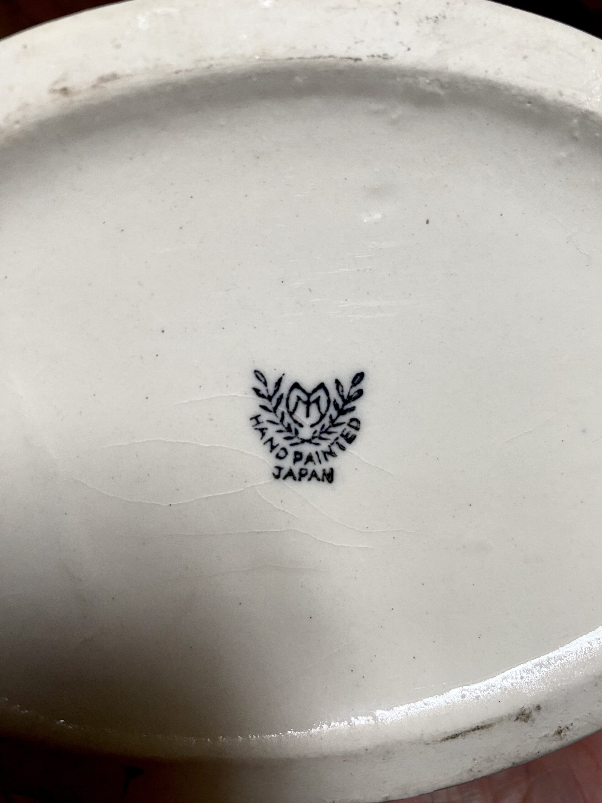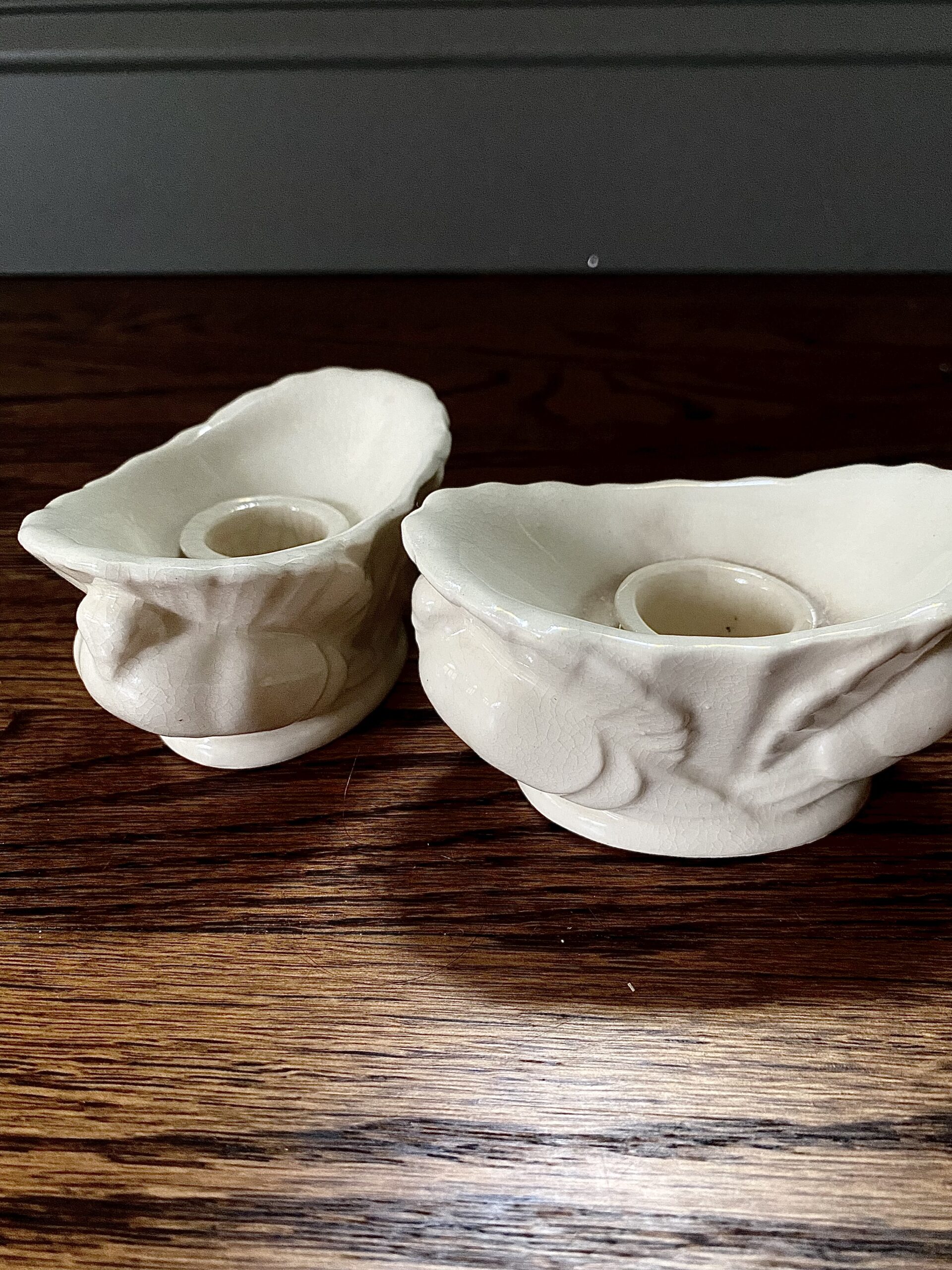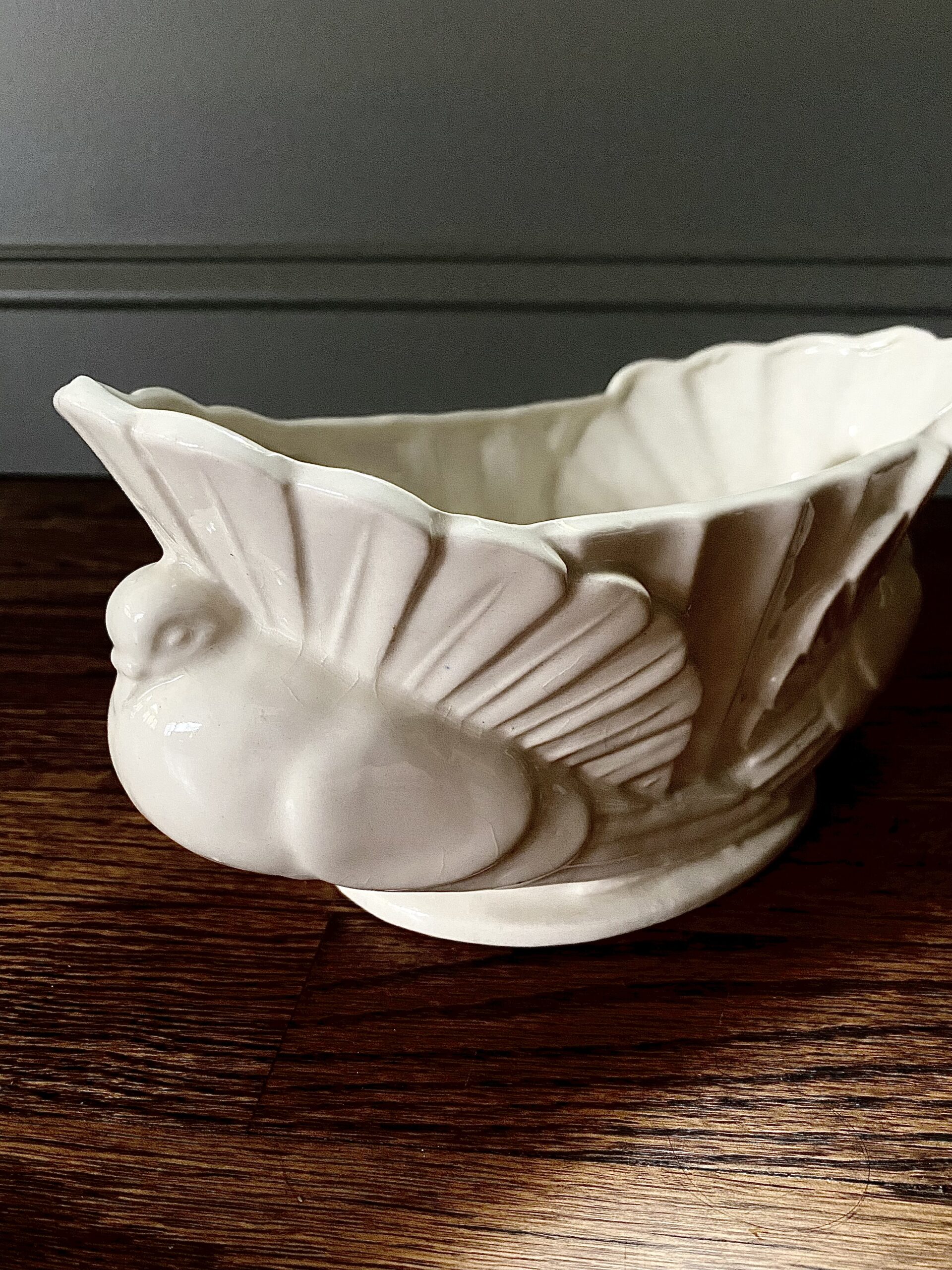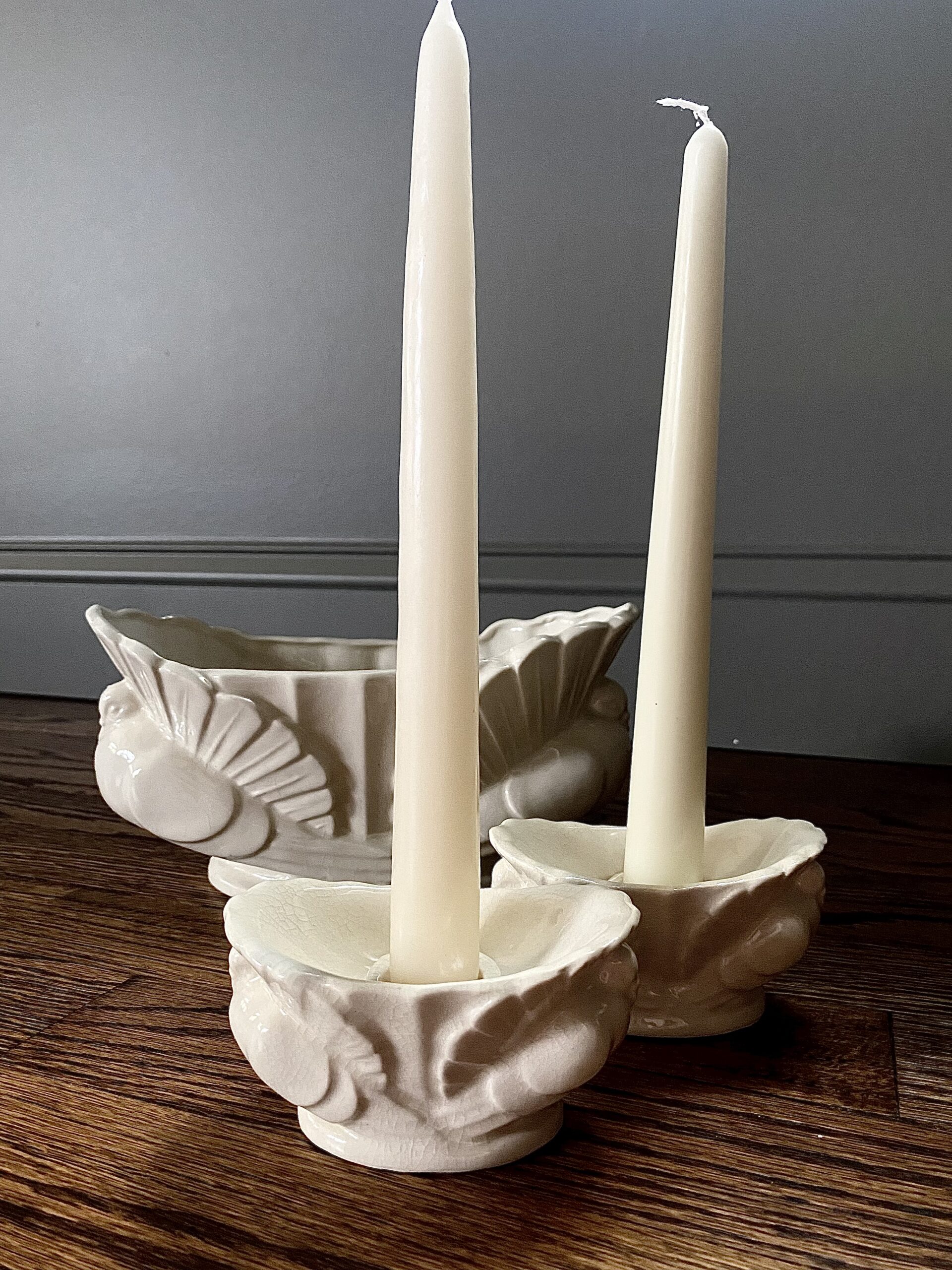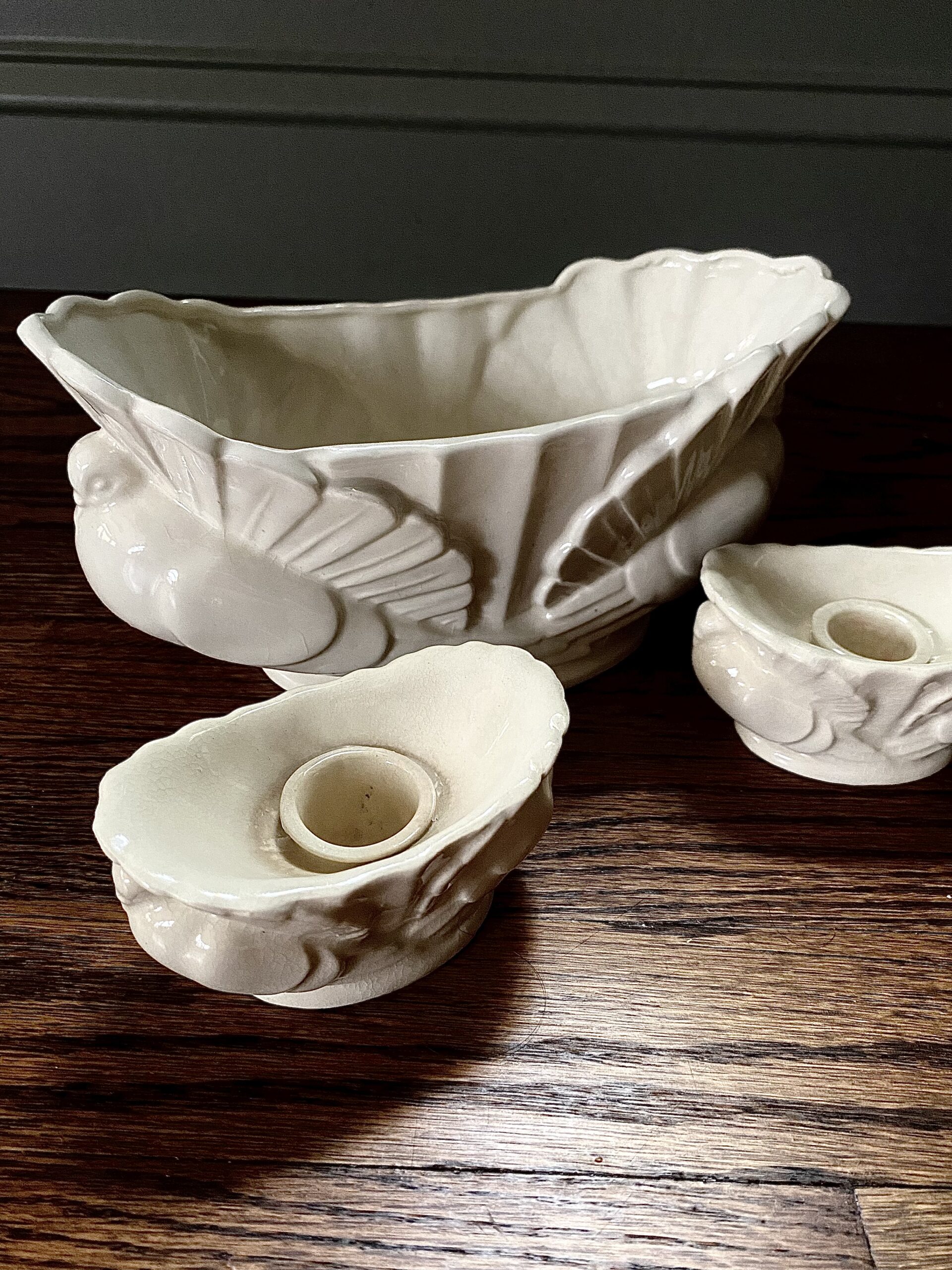 Art Deco cachepot and two candlestick holders in the form of doves. Produced in Japan in the 1930’s. The cachepot measures 9″ long, 4.5″ tall, and 4.25″ wide. The taper candle holders measure 4″ long, 2″ tall, and 2.5″ wide.