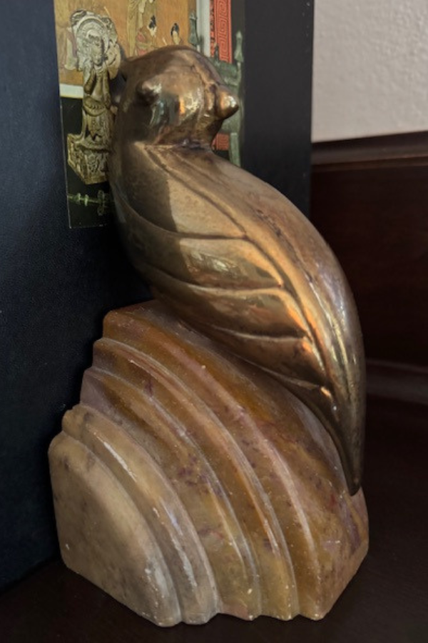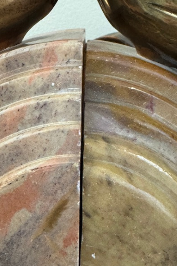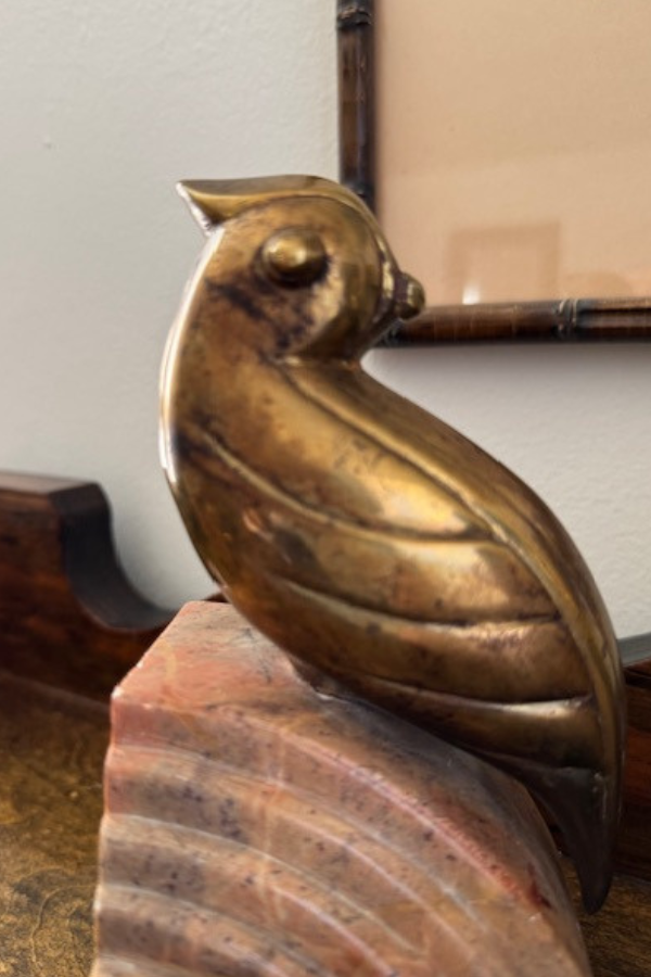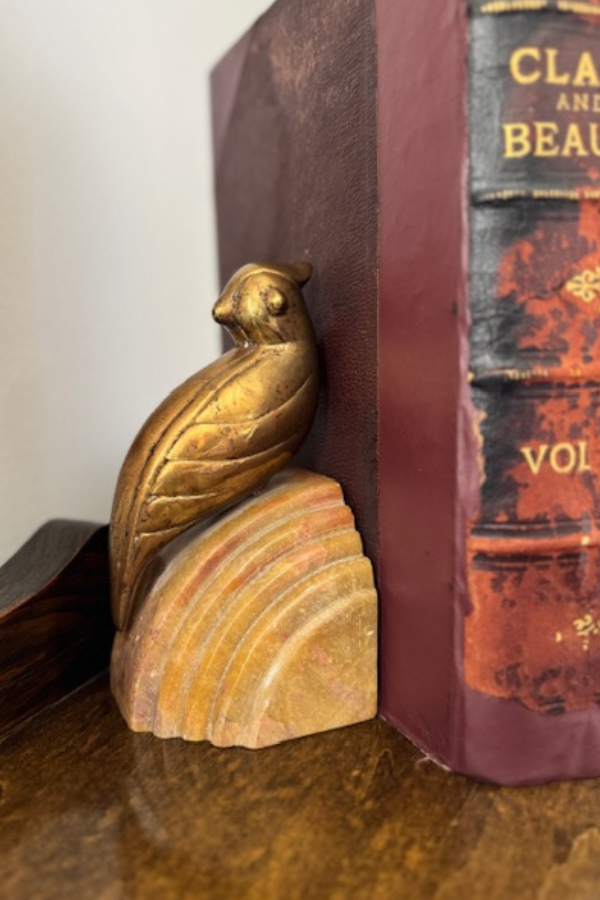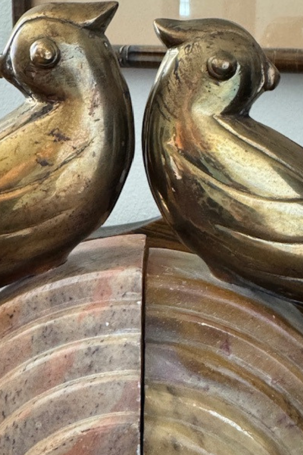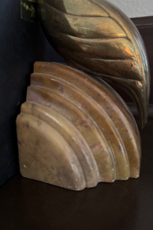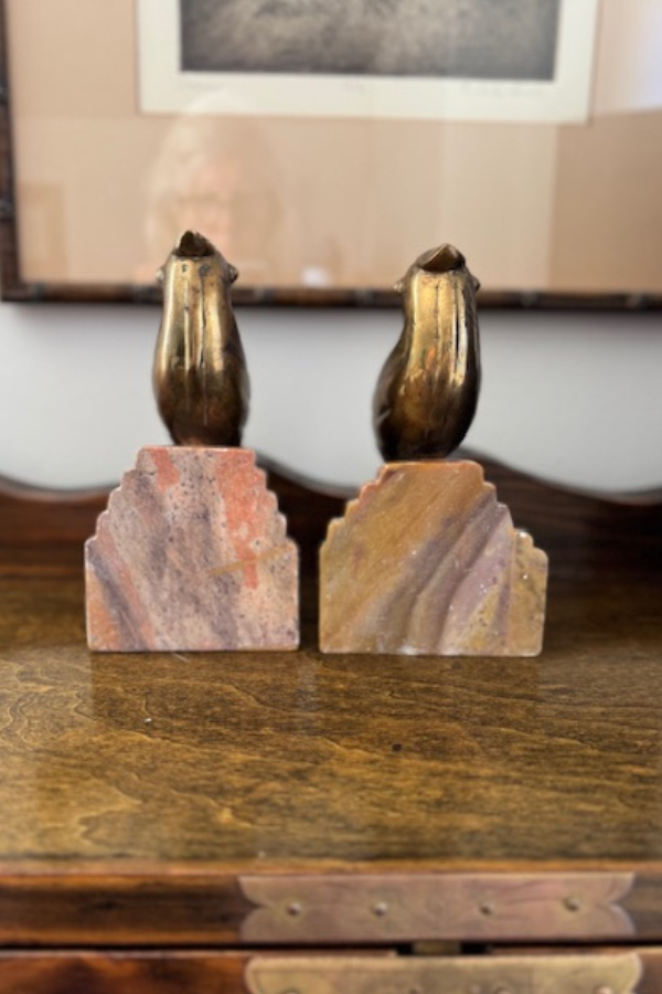 Beautiful Art Deco styled heavy marble bookends with brass quail. The marble has pretty coloring in shades of salmon, gray, tan, and caramel. Each bookend is unique with the base of one just a little smaller than the other. I do not think this detracts when they are used to hold up books, but you can see the comparison in the last couple of photos. Both are labeled “Nora Fenton Designs and state that they were hand crafted by marble artists. There is also a Made in India tag on one. These are probably from the mid twentieth century.