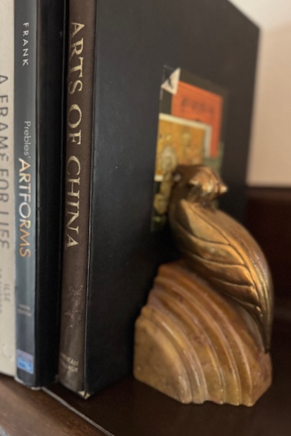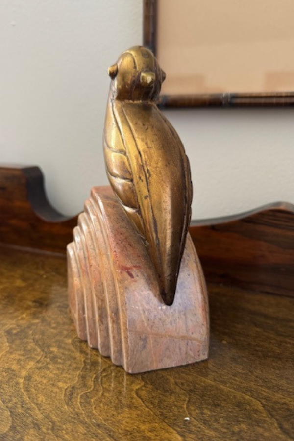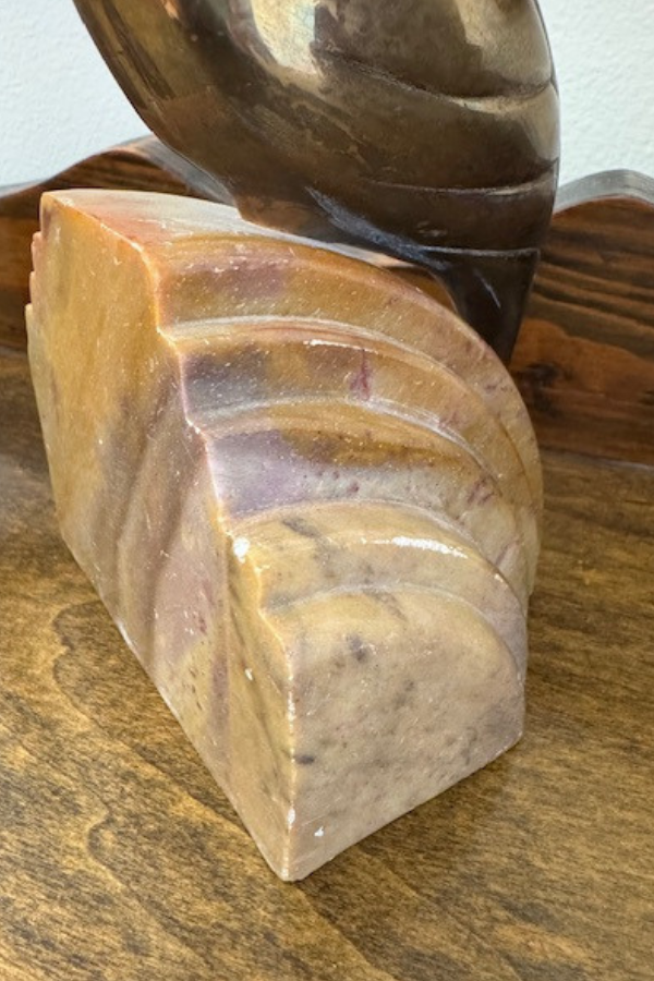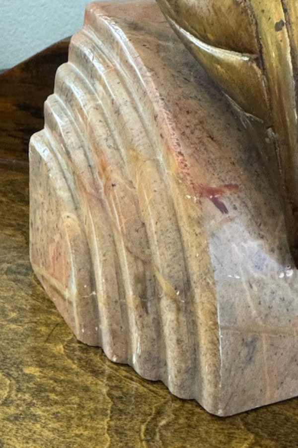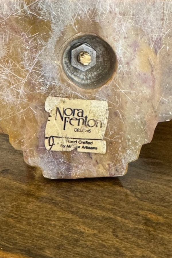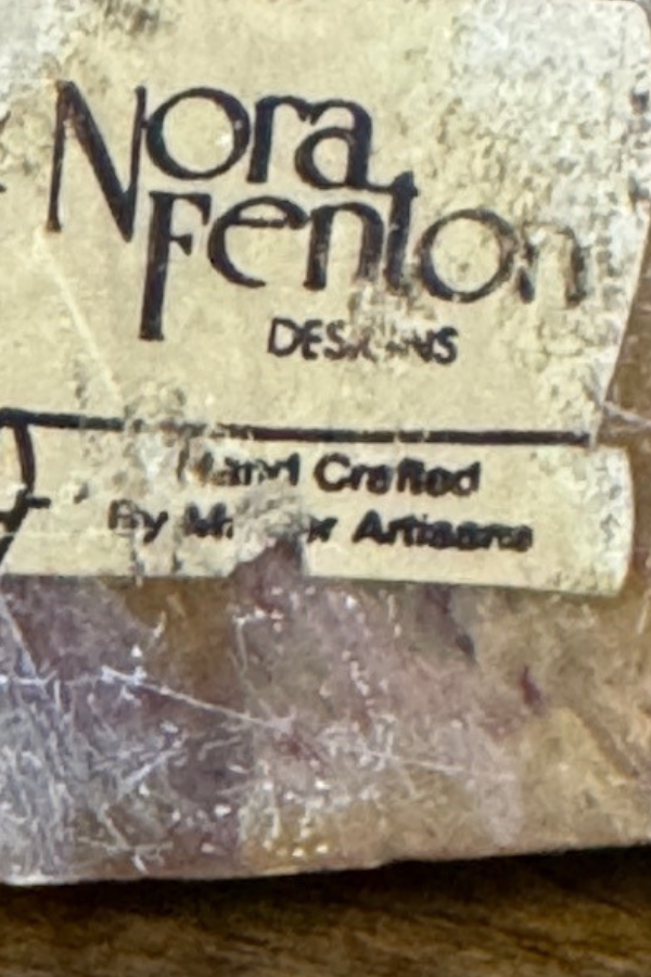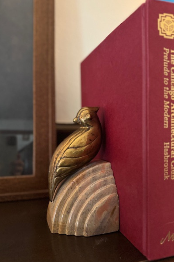 Beautiful Art Deco styled heavy marble bookends with brass quail. The marble has pretty coloring in shades of salmon, gray, tan, and caramel. Each bookend is unique with the base of one just a little smaller than the other. I do not think this detracts when they are used to hold up books, but you can see the comparison in the last couple of photos. Both are labeled “Nora Fenton Designs and state that they were hand crafted by marble artists. There is also a Made in India tag on one. These are probably from the mid twentieth century.
