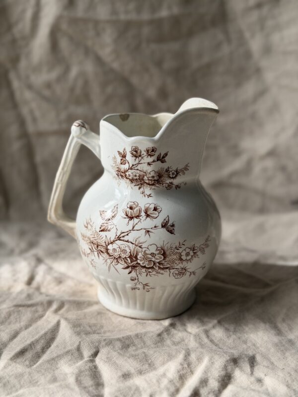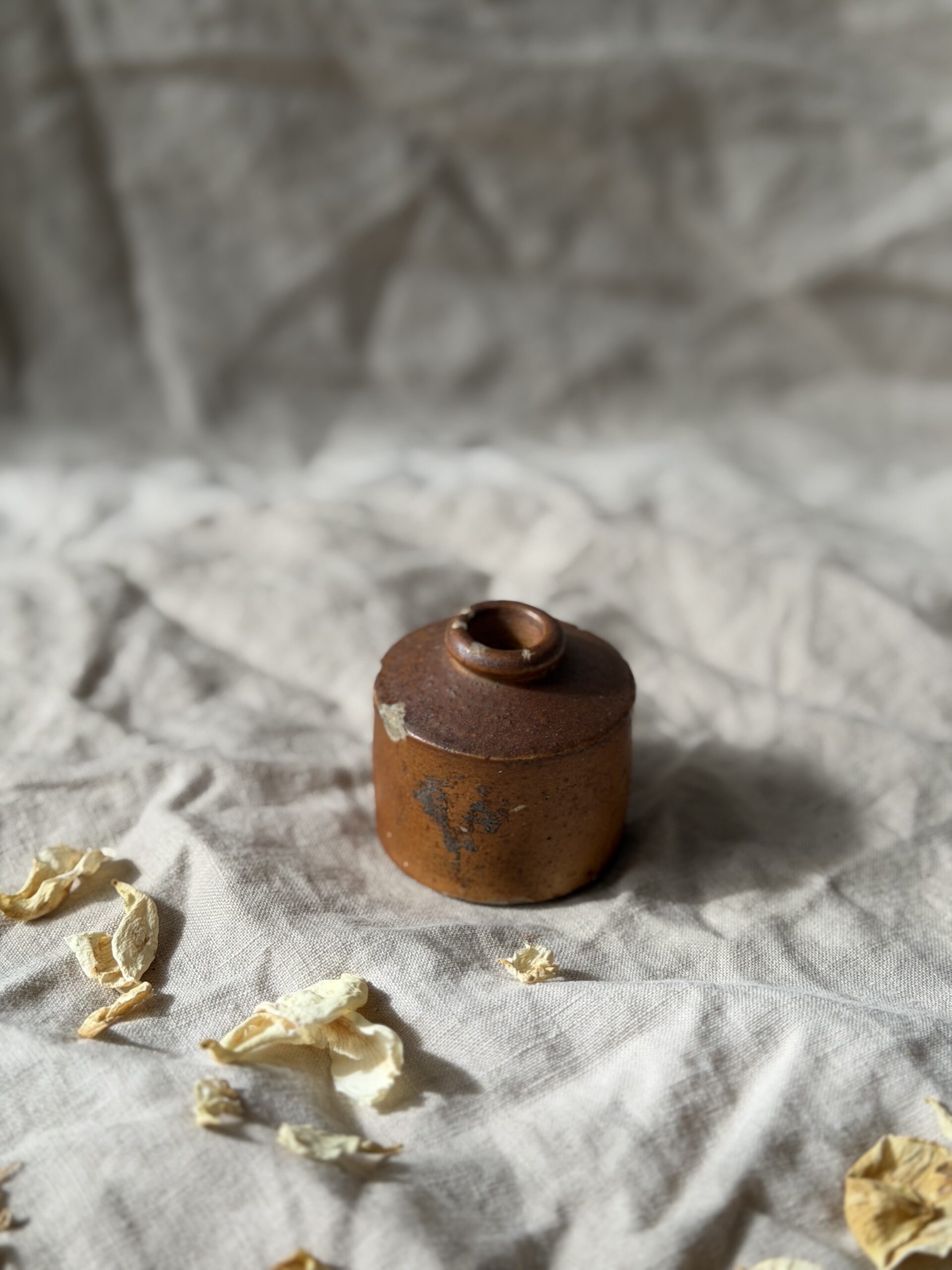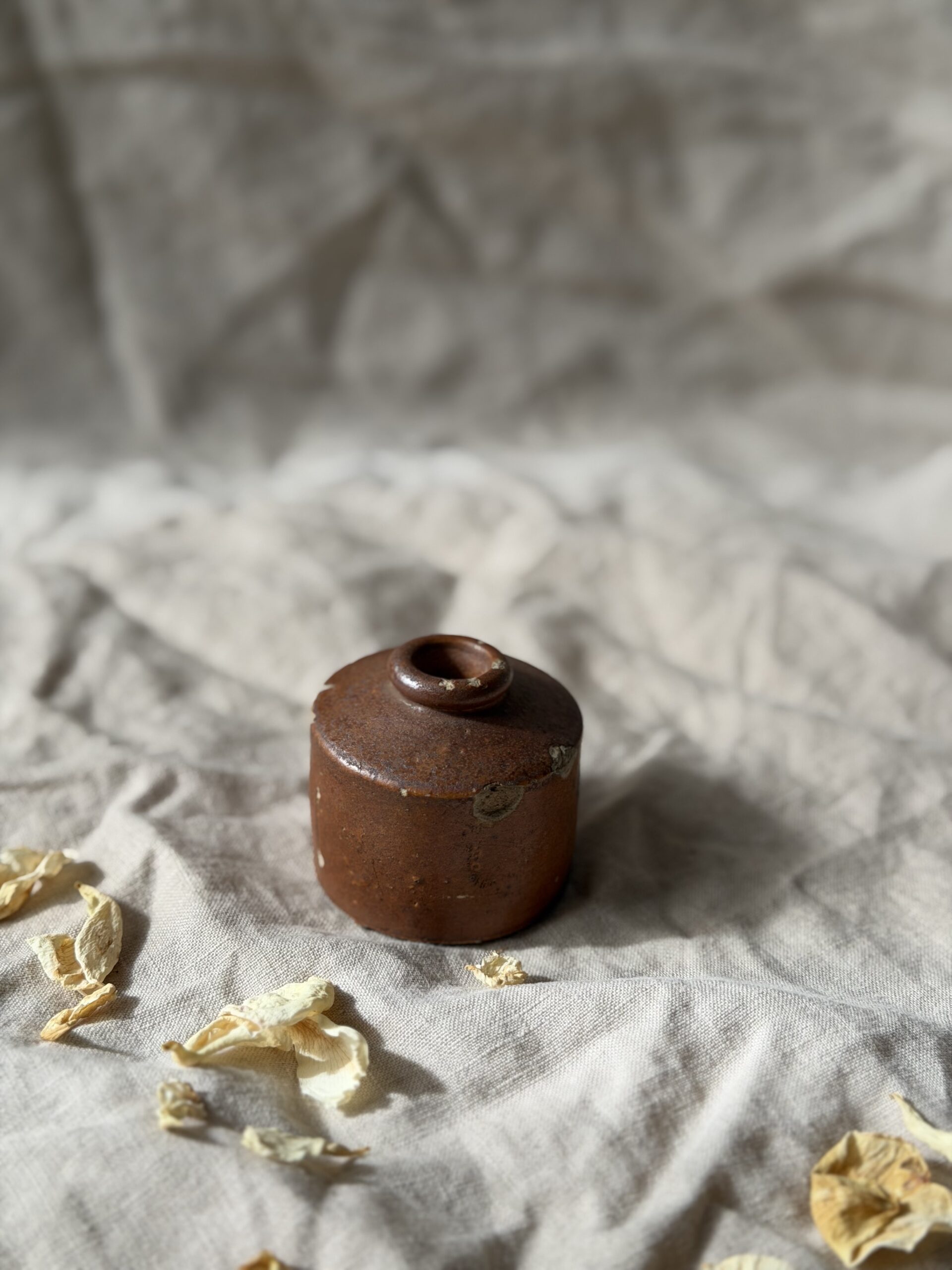 A petite antique stoneware ink bottle, in a warm rustic brown glaze. This piece brings old world charm to any space with its weathered surface and natural imperfections.