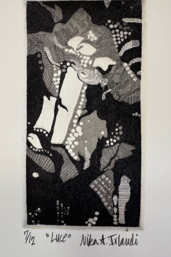 Black and white abstract. Signed and numbered from a small run of 12. The artist is Nika A Irlandi. The print measures 20 x 13.25 inches (total paper) with a print area of about 4 x 7.” Shipping is included but only within the contiguous US.