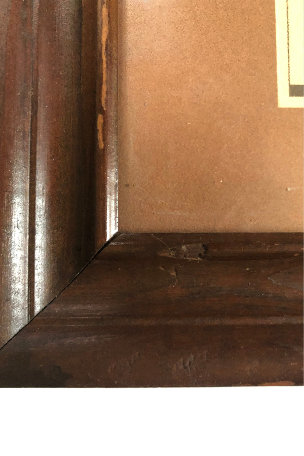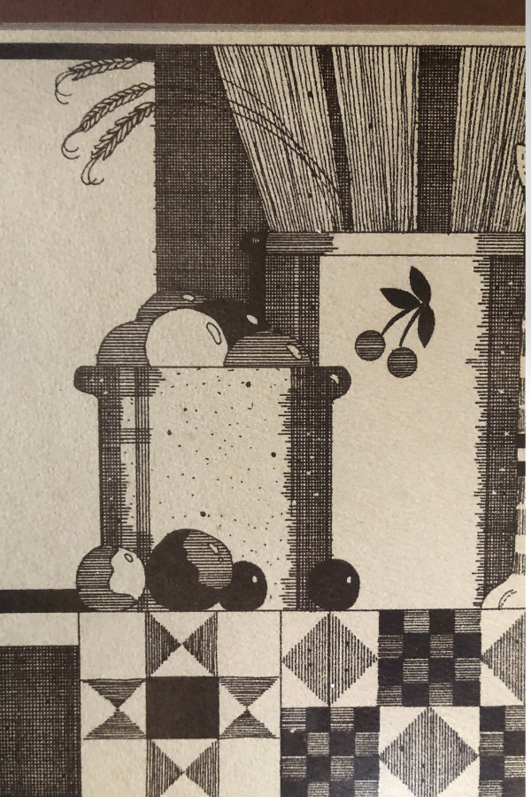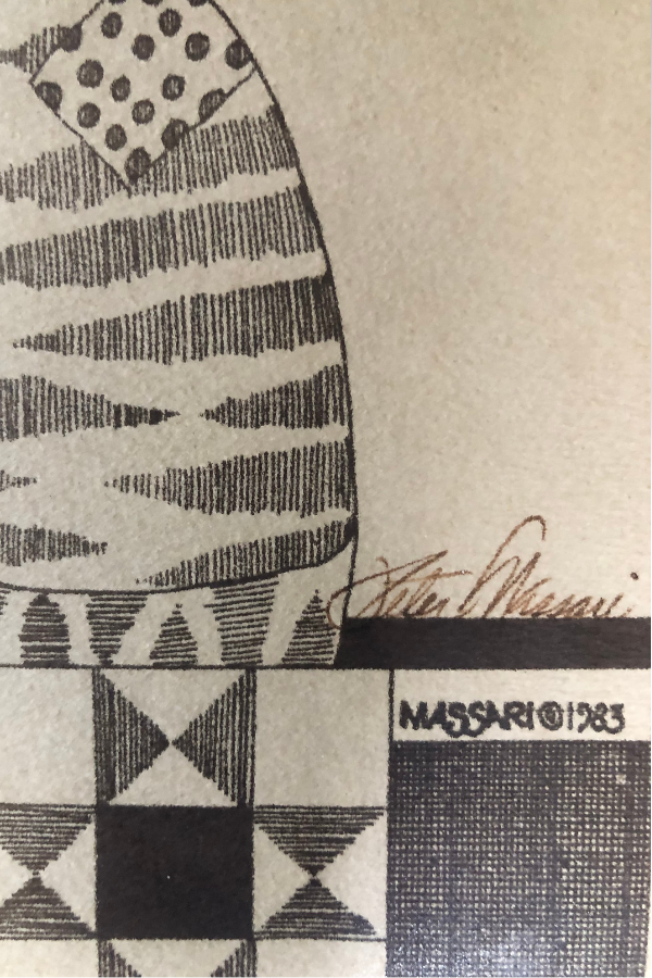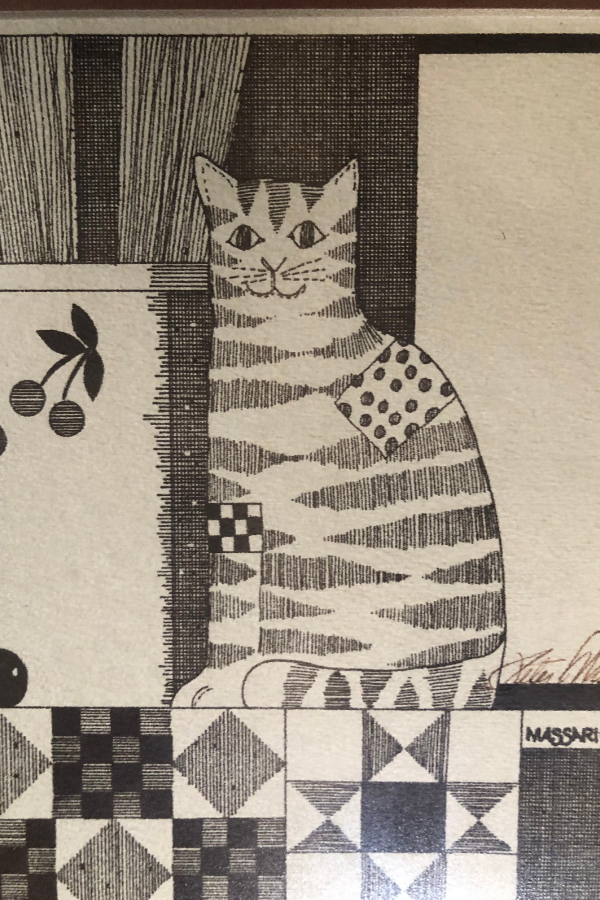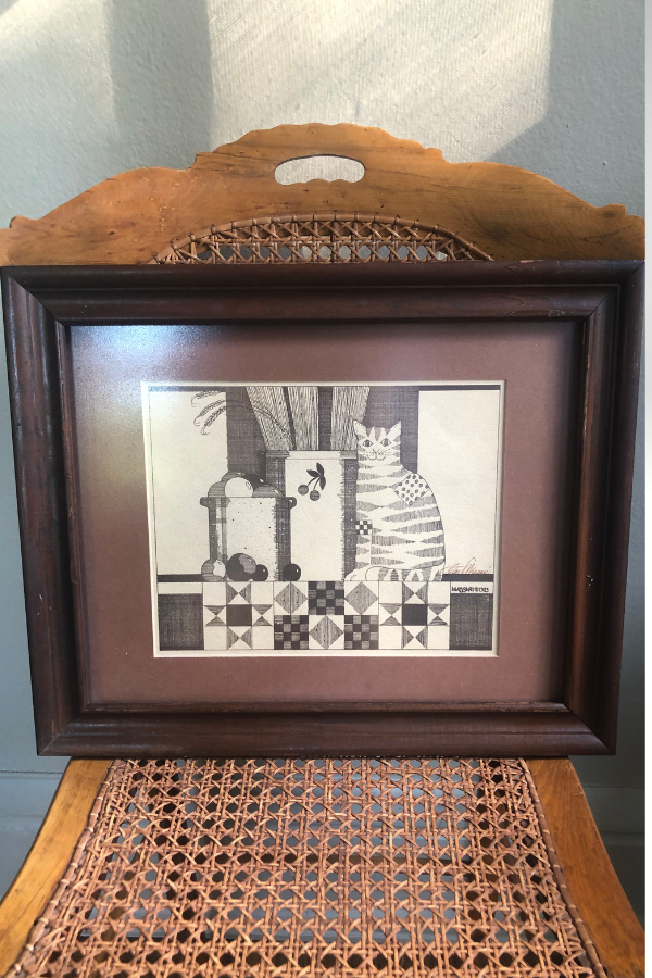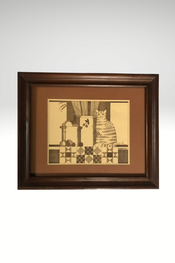 Folk art style block print by Peter Massari. The black and white art features a sweet cat siting on a table draped with a quilt. The print is set inside a brown mat that is showing some age. The wooden frame also shows some age. I have swiped it with some Old English to freshen it up a bit. I believe it has anti glare glass. The print is from 1983. It measures 16.5 x 13.5 inches. Shipping is included, but only within the contiguous US.
