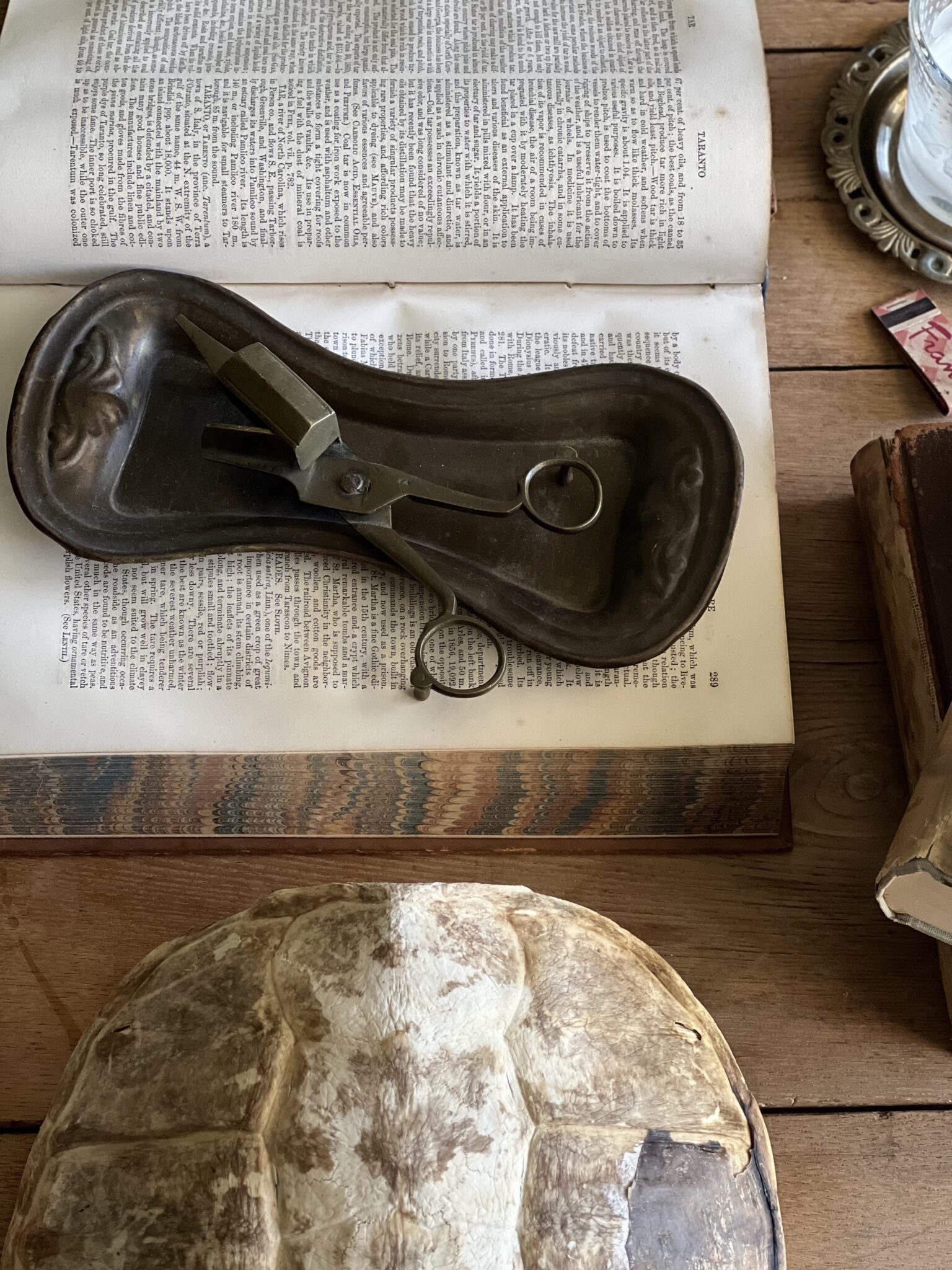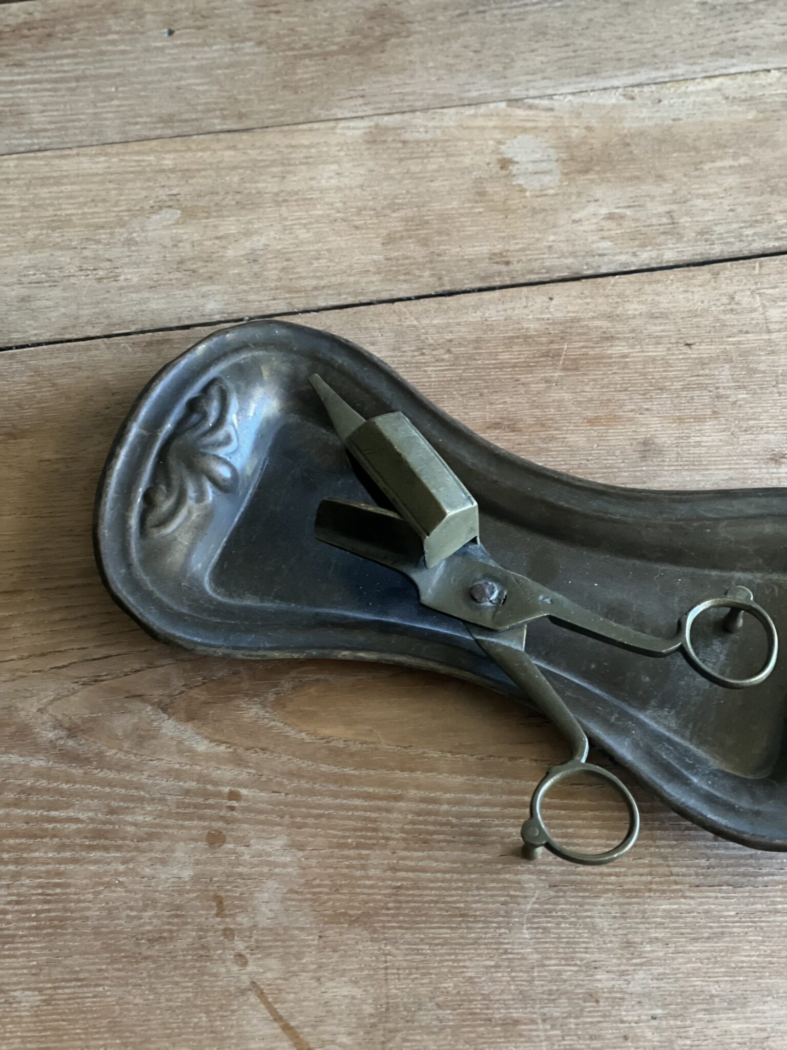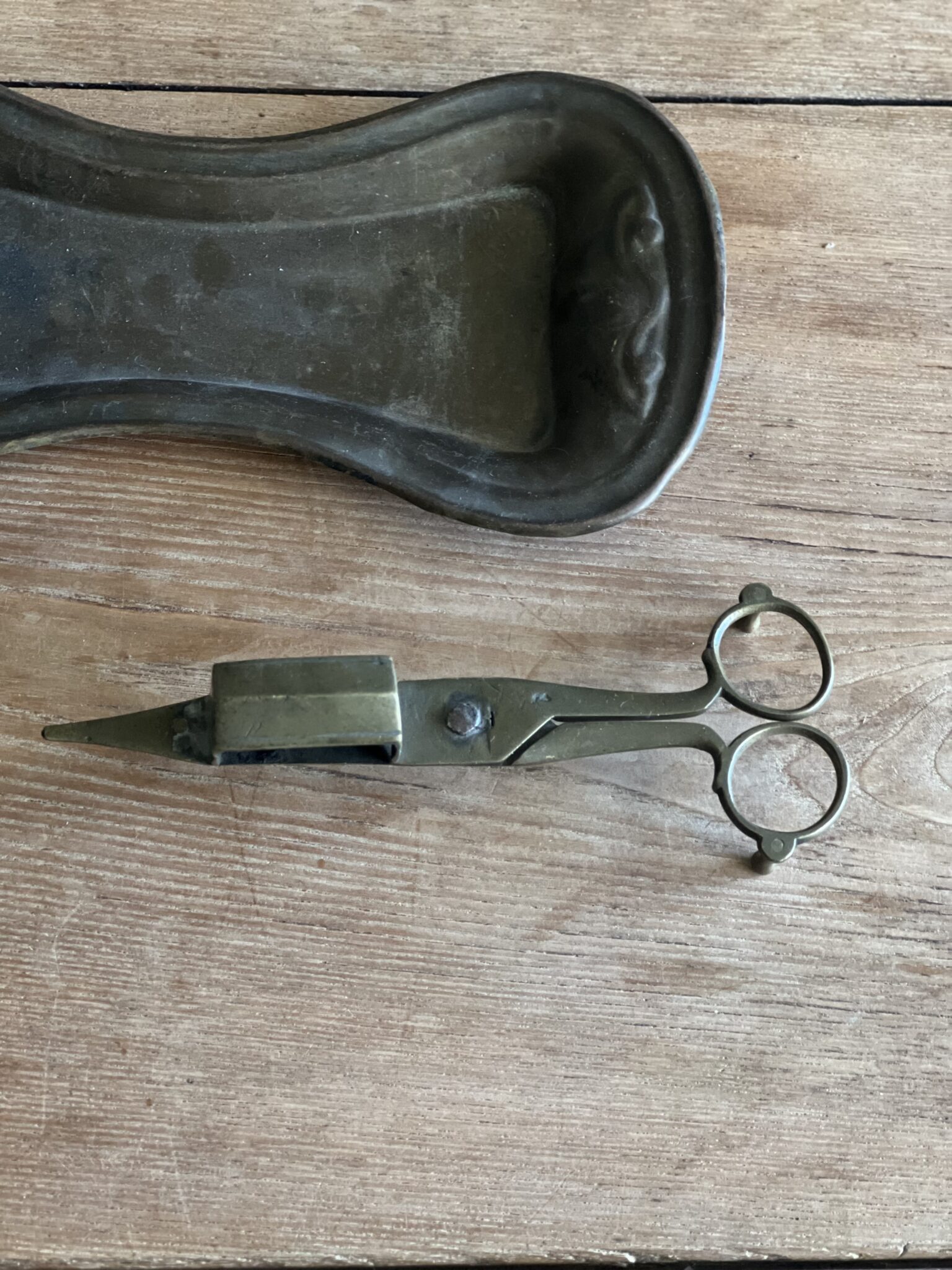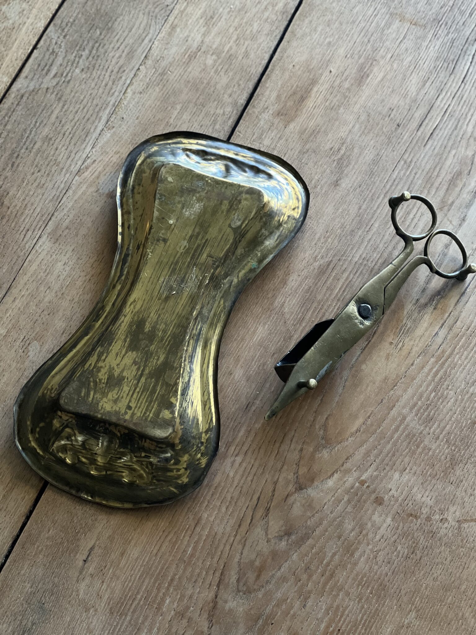 Beautifully worn brass candle snuffer scissors and tray. Perfect set for adding in some interest to a tabletop or layering on a shelf.