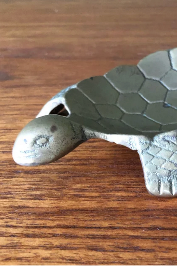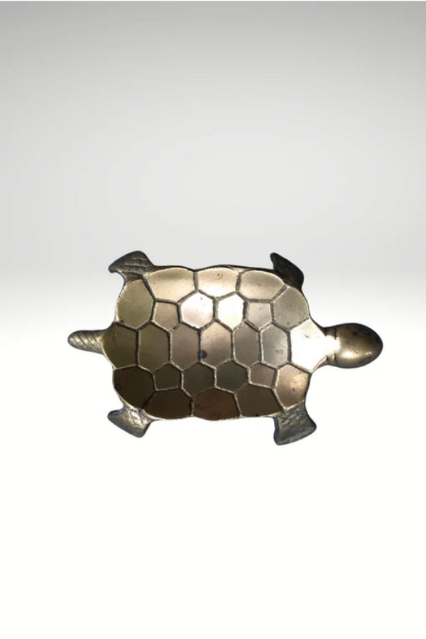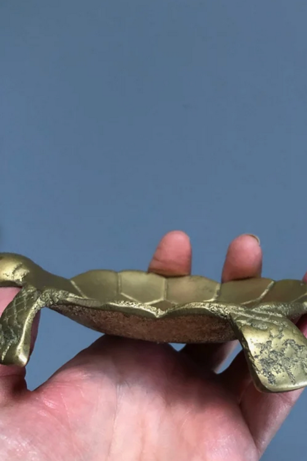 Little brass turtle dish. Could use for a soap dish or ring/jewelry/trinket dish. Some patina. 6 x 4”