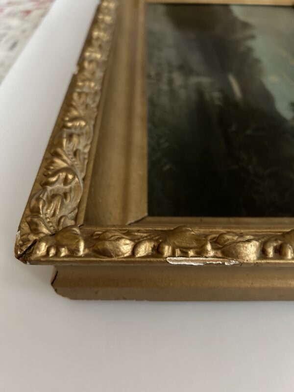 Another breathtaking naturescape in this collection. Housed in the most beautiful ornate gold wooden frame. There are some chips in the frame as shown in the pictures. The hanging hardware on the left has to be re-attached as seen in the picture.