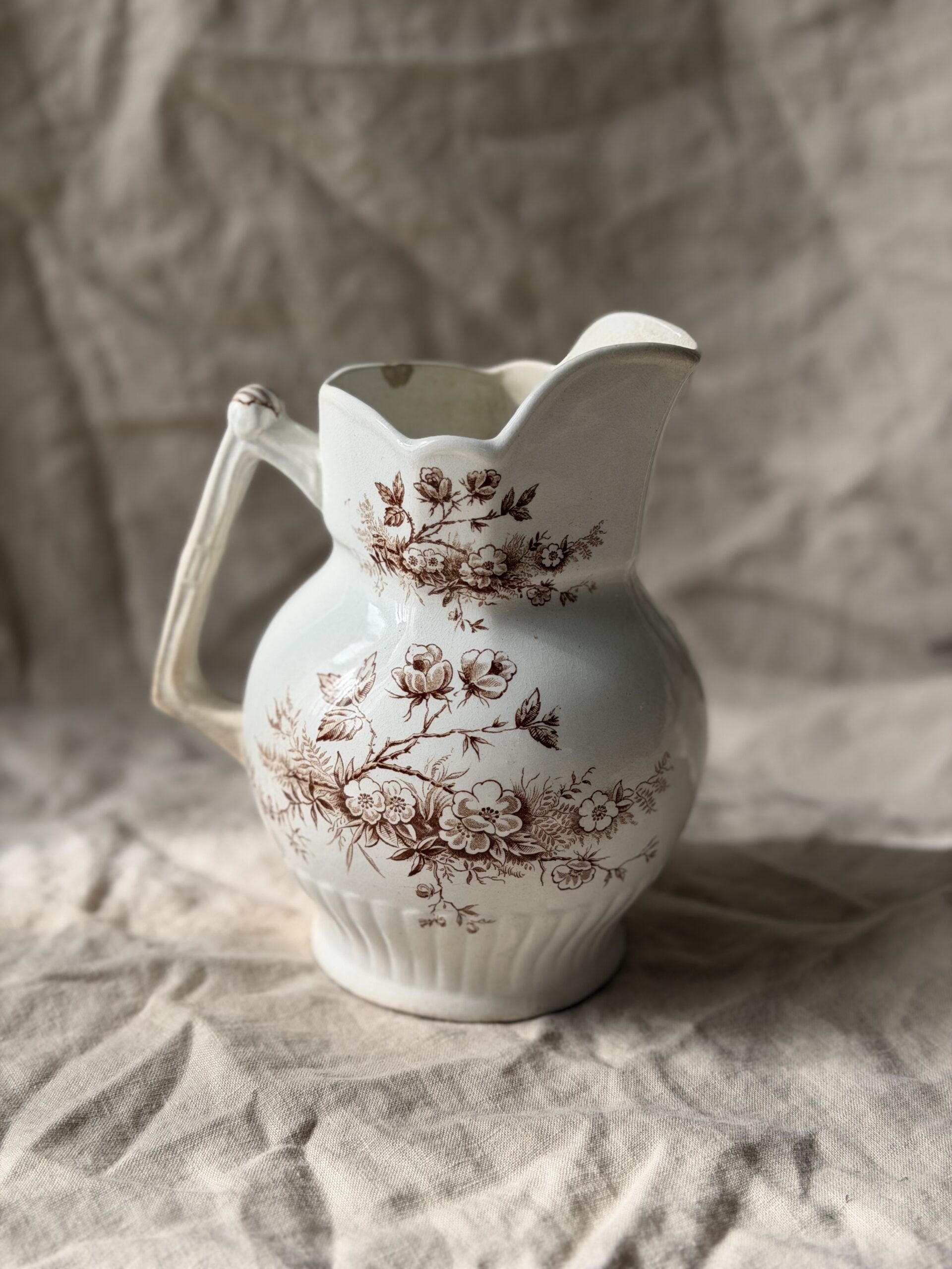 Beautiful brown English transferware pitcher decorated in romantic florals.