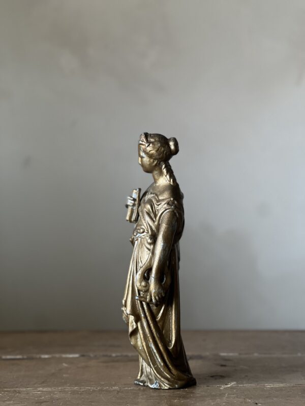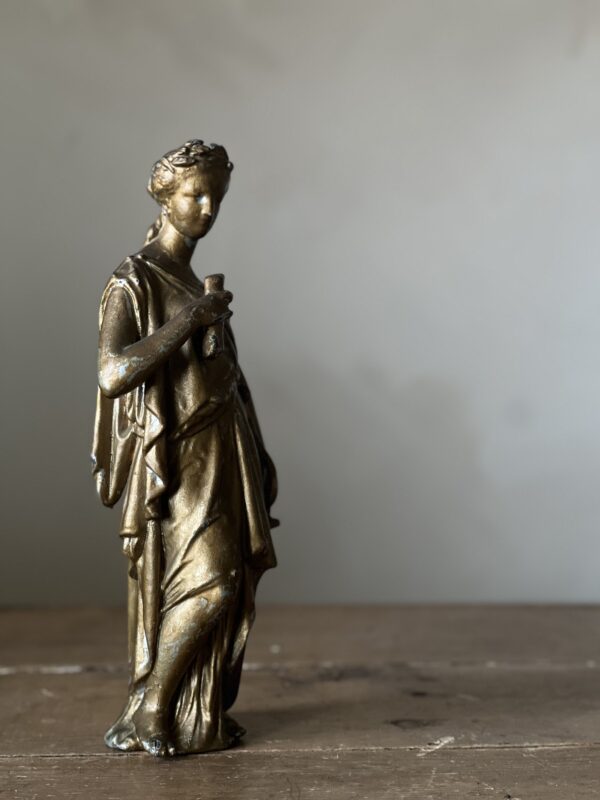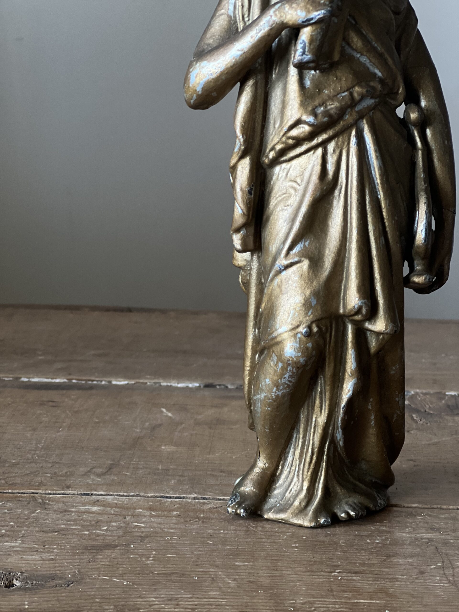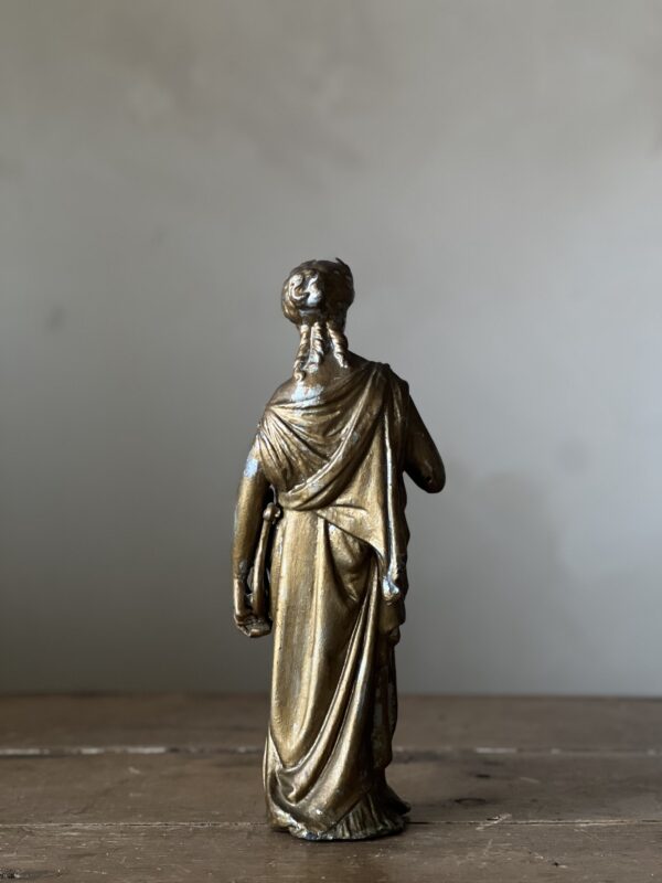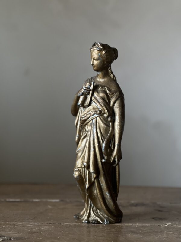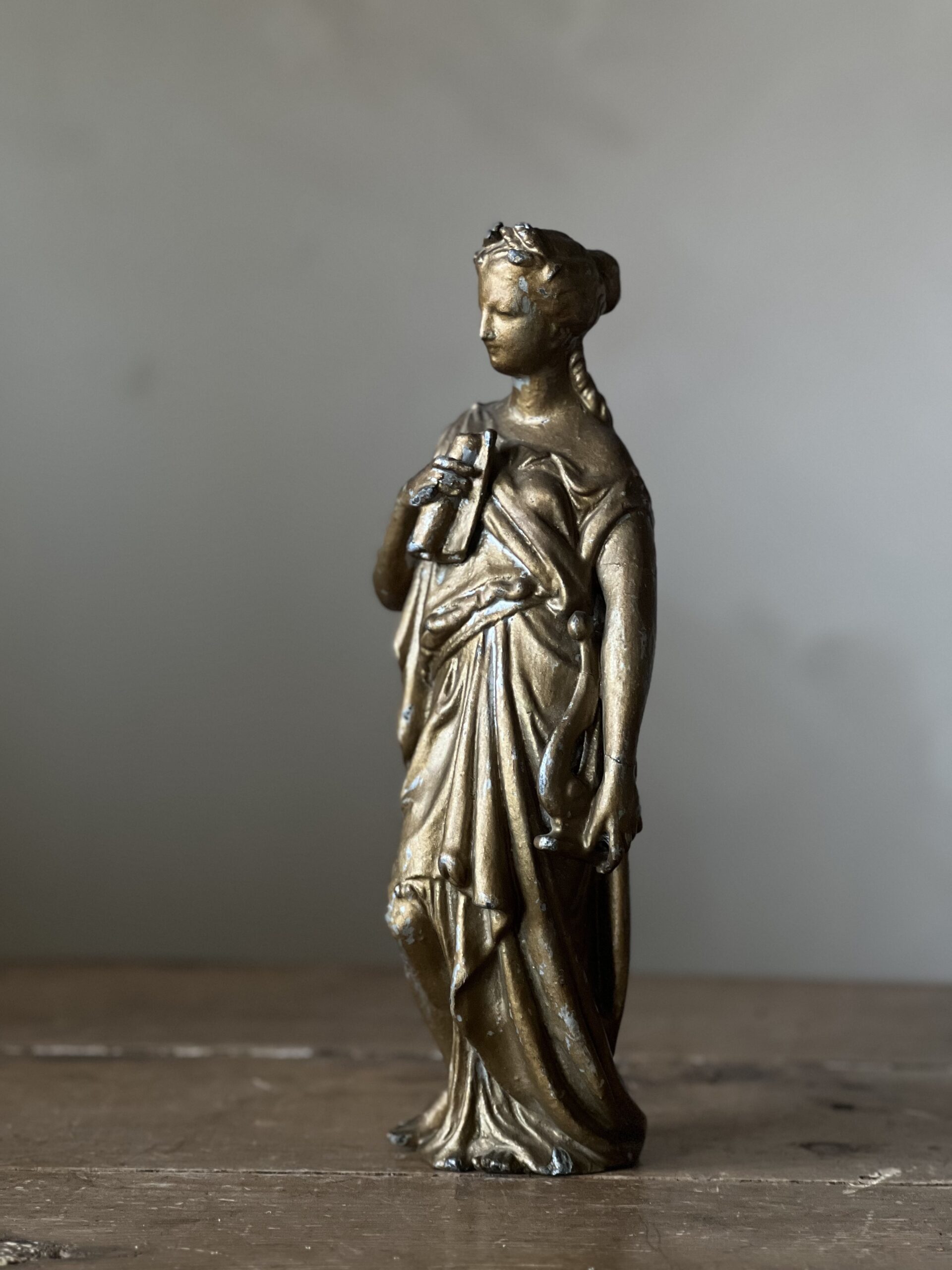 Lovely gold-toned cast statue of Calliope, the Greek muse of epic poetry and eloquence. Spots of worn and chipping gold paint. Depicted with a laurel leaf crown and holding a scroll. She is sometimes thought to be Homer’s muse for the Iliad and the Odyssey, and in some cases, she is said to be the mother of Sirens.