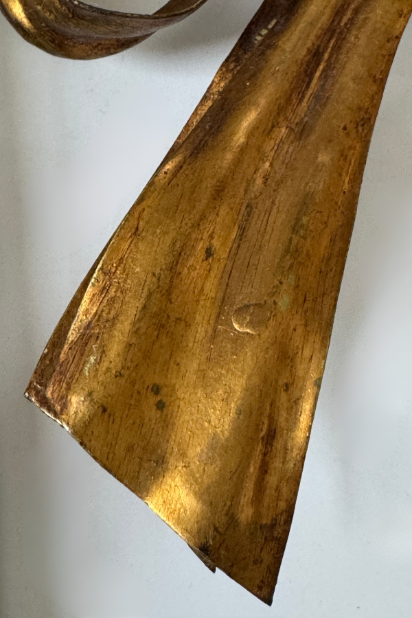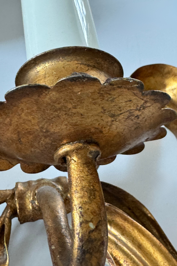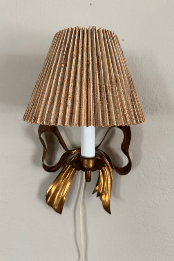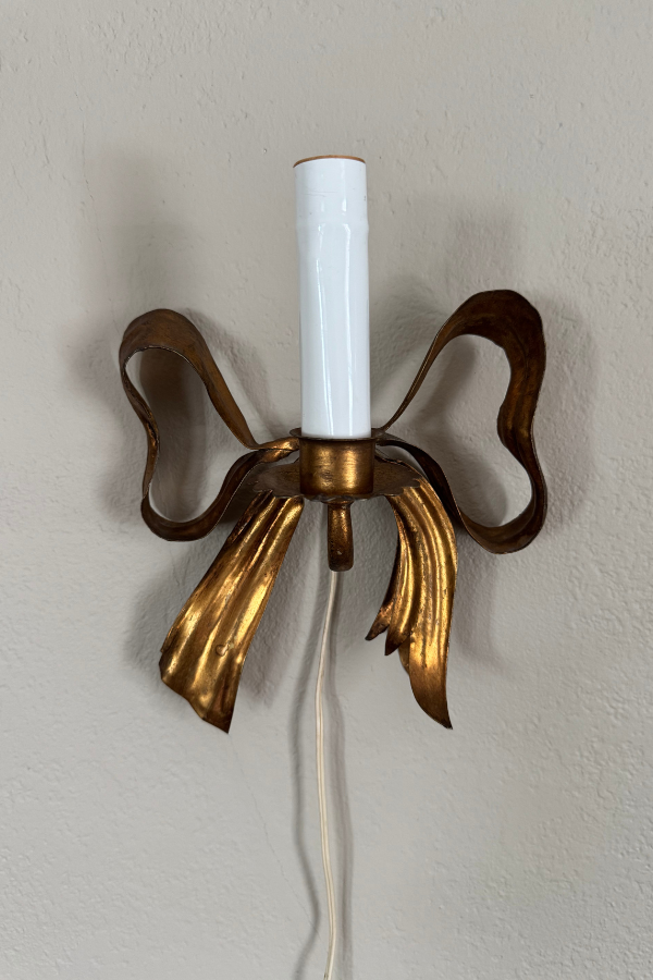 Candlestick light sconce with gilded metal bow behind. This has a cord, but could probably be adapted to a hard-wire. Shade NOT included.