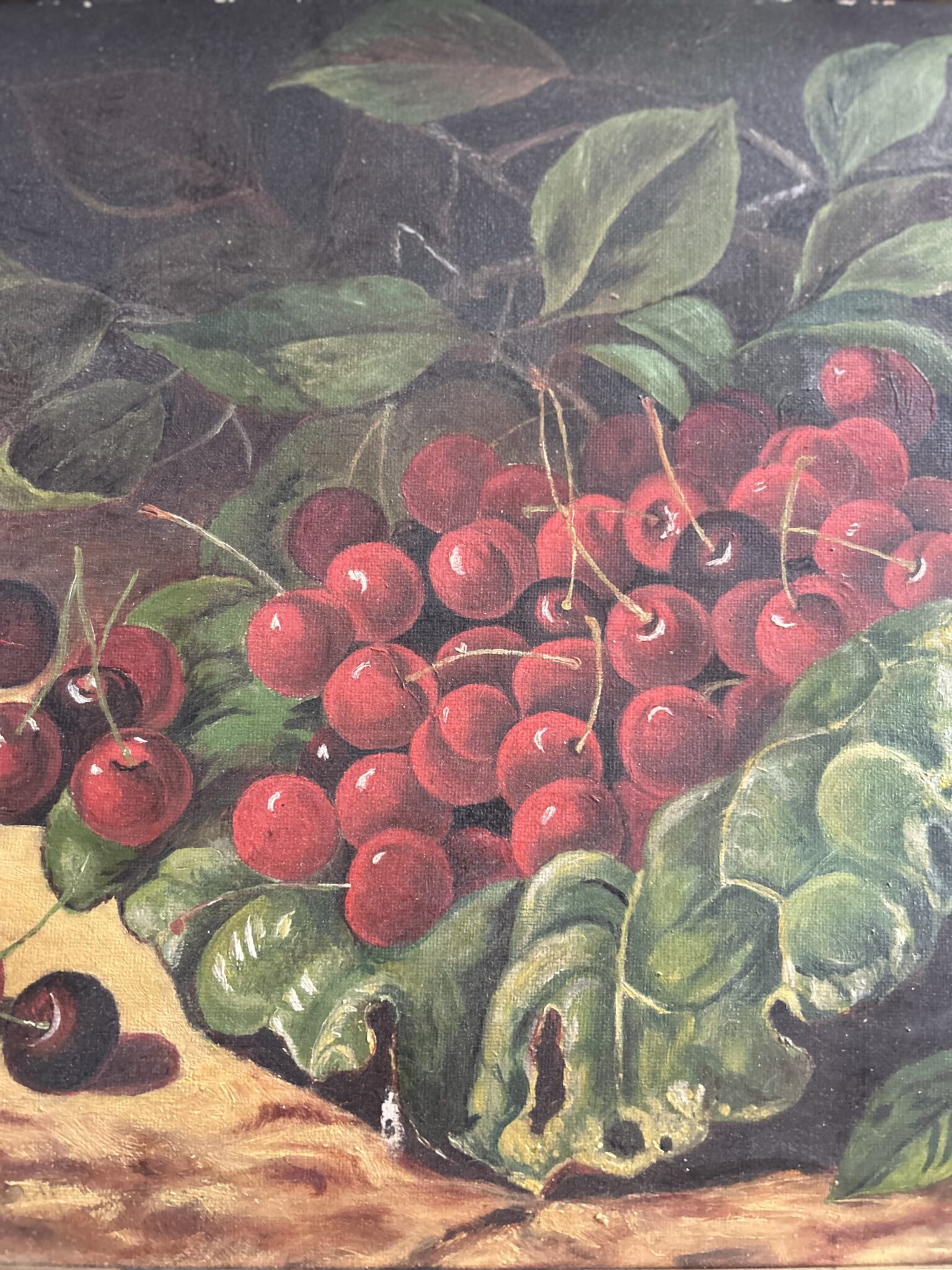 Stunning cherries still life oil painting (most likely antique). This would be such a beautiful addition to any collection. The pop of red is muted in the overall moody brushstrokes of this lovely painting.