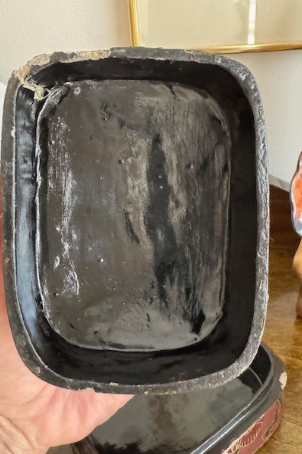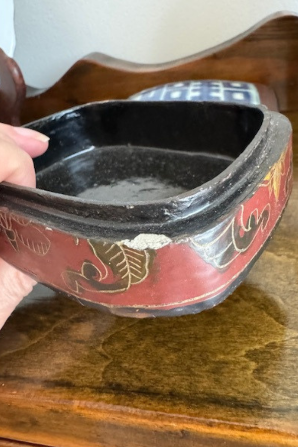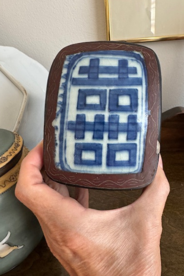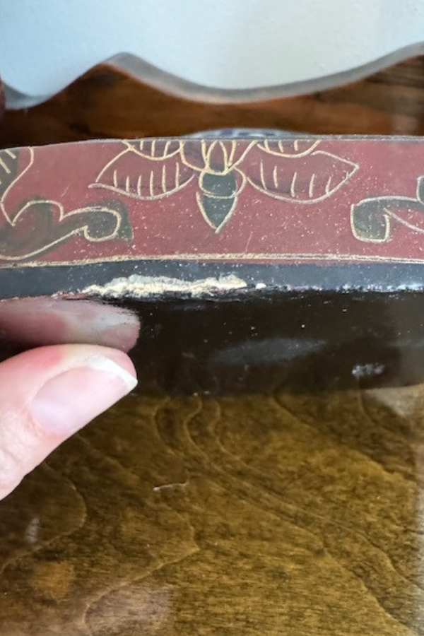 Chinese lacquered shard box. Design on sides. Blue and white pottery shard on top. There are chips to the finish, especially on the lid (see close-ups) and bottom fade. Not perfect, but beautiful. 4.5” x 3.25” and 2.25” tall. Shipping is included, but only within the contiguous US