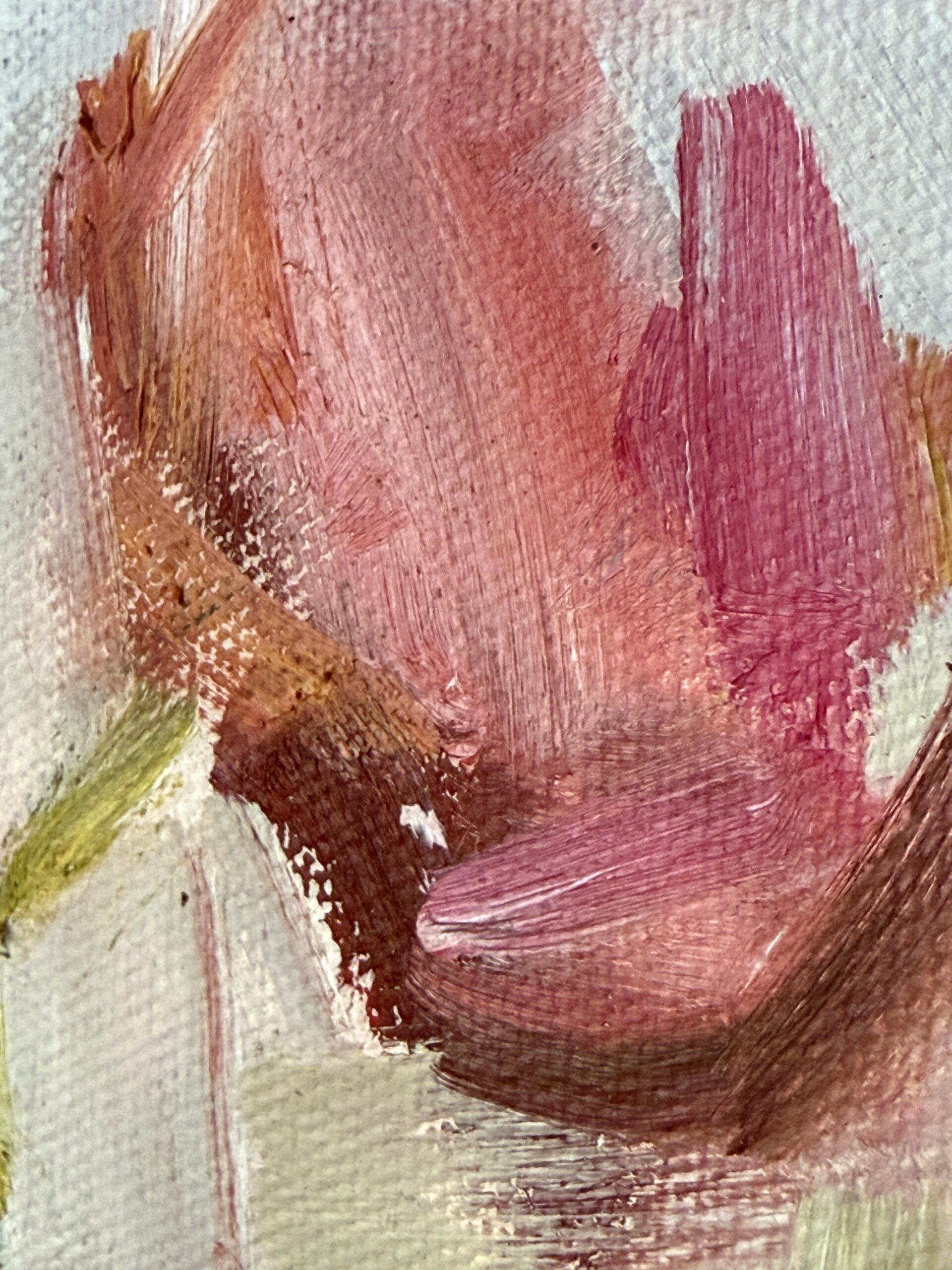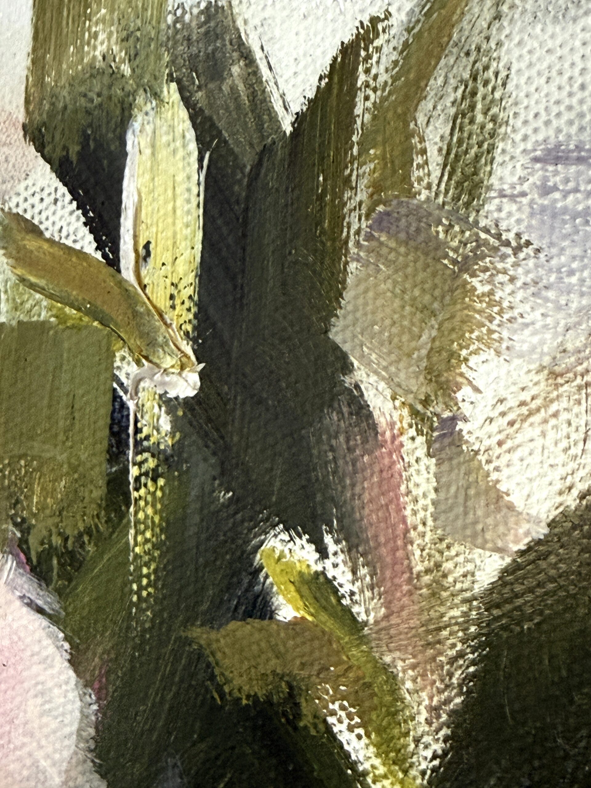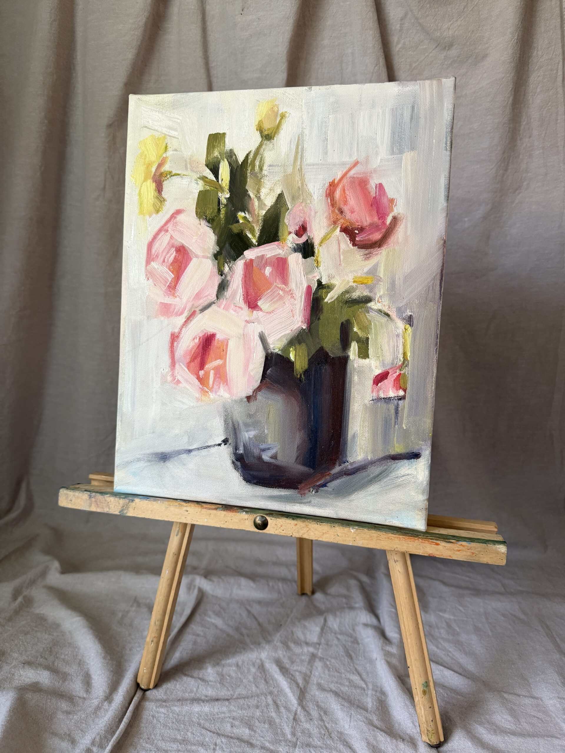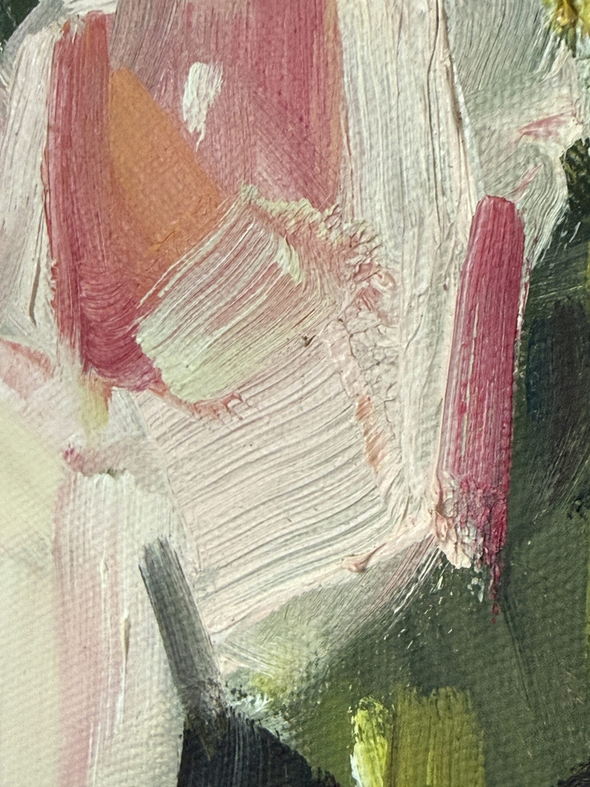 Contemporary oil painting purchased from the octogenarian artist’s estate. It features pink and yellow flowers in a dark vase with gray and purple tones against an abstract light-color background. Executed on a 14″ x 11″ stretched canvas in a style best described as impressionistic, it exhibits visible brushstrokes applied in an impasto-like technique. Signed LK 05/2016. Great addition to a “shabby chic” or “cottagecore” aesthetic. Excellent preowned condition, from the artist’s estate. Ready to frame or display on an easel (not included).