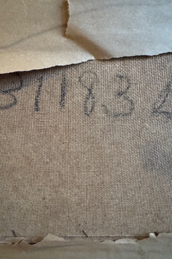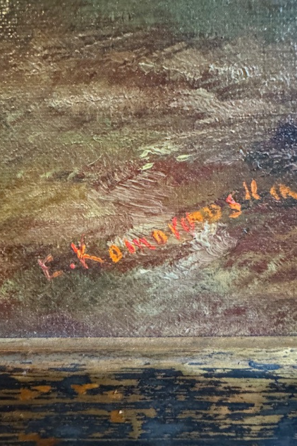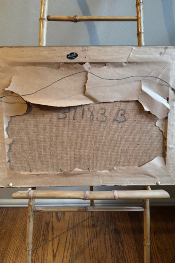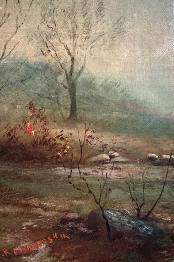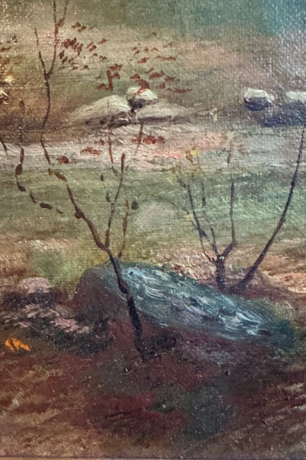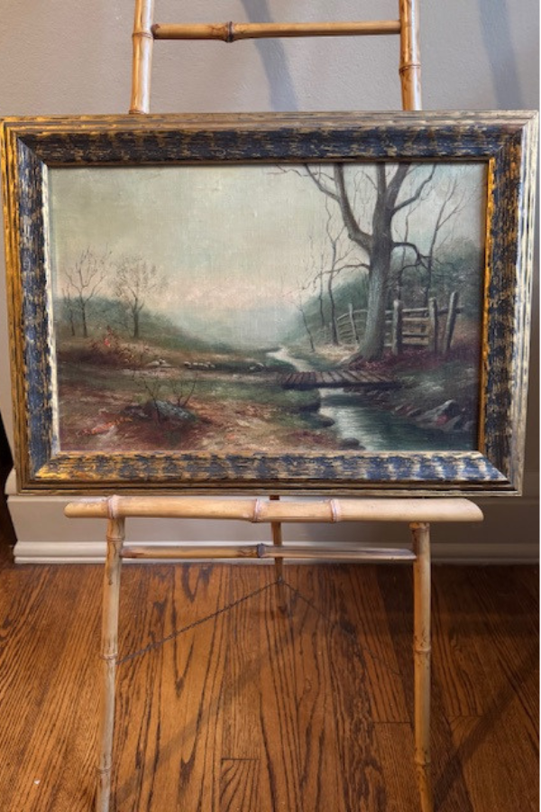 This oil painting just captures that quiet countryside beauty in the fall and winter. Beautiful shades of blue green and brown golds. Features a quiet creek and an old wooden footbridge. Framed in a textured wooden frame that has been painted gold and has been highlighted in black for an antiqued look. The oil is on board. Framing label from Milwaukee. Torn brown paper backing and wire for hanging. Framed piece measures 16 x 22 inches. Shipping is included but only within the contiguous US.