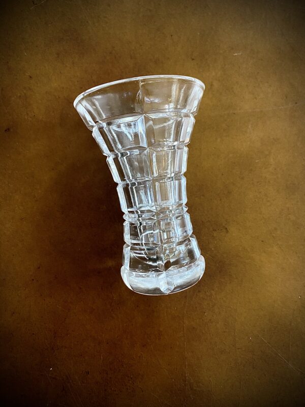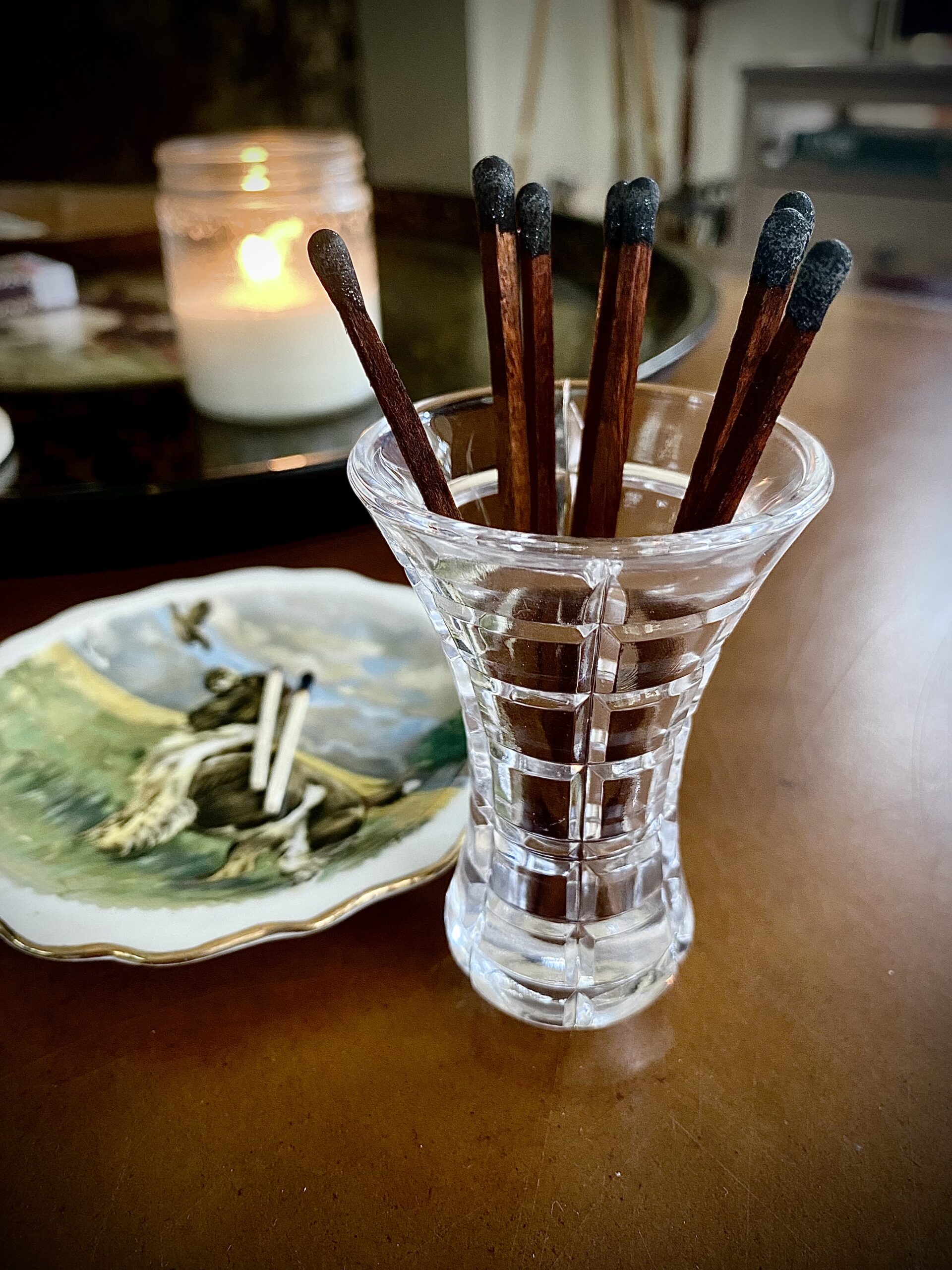 Cut crystal match holder/toothpick holder. Measures 3″ tall and 2″ at opening.