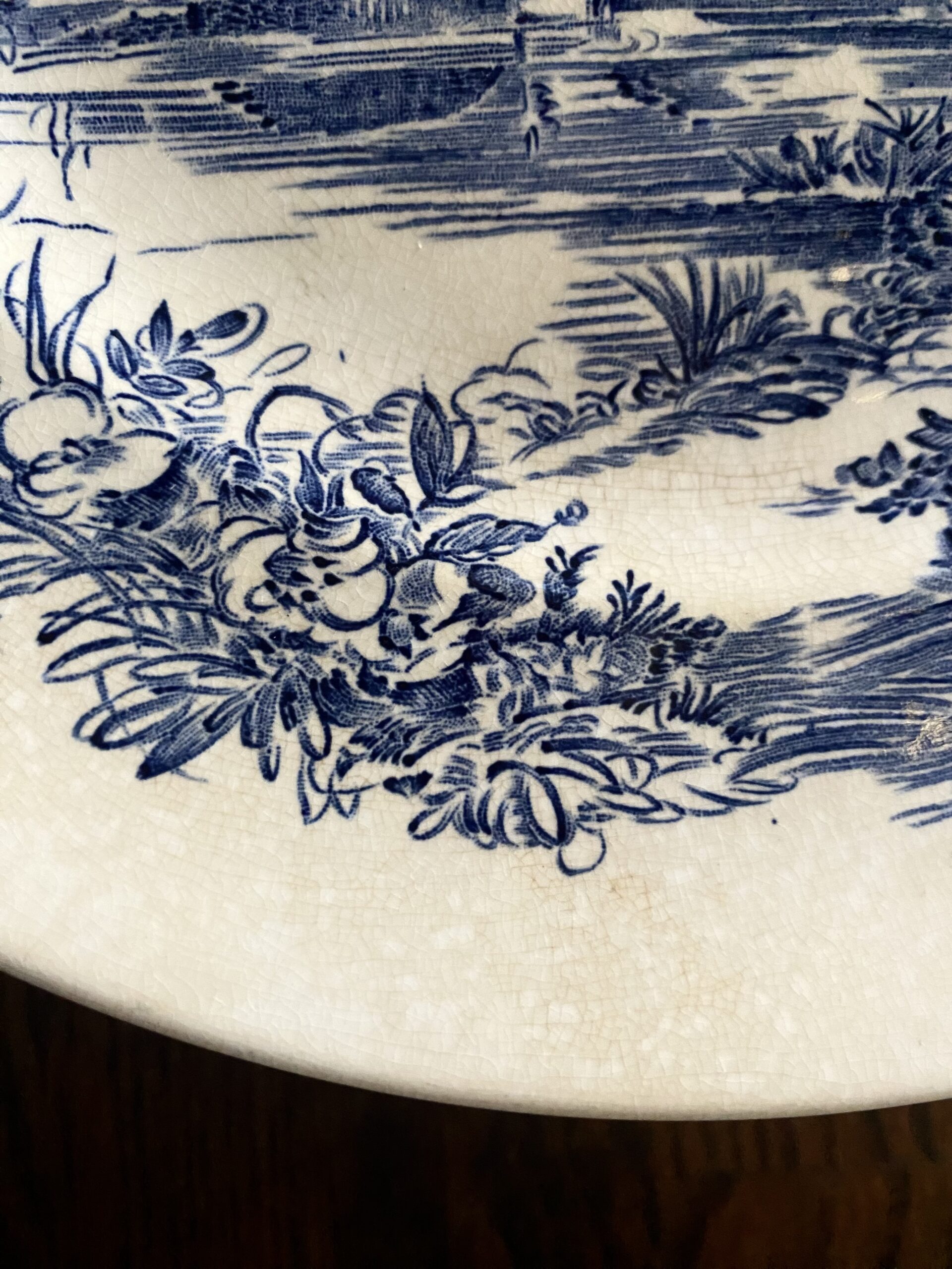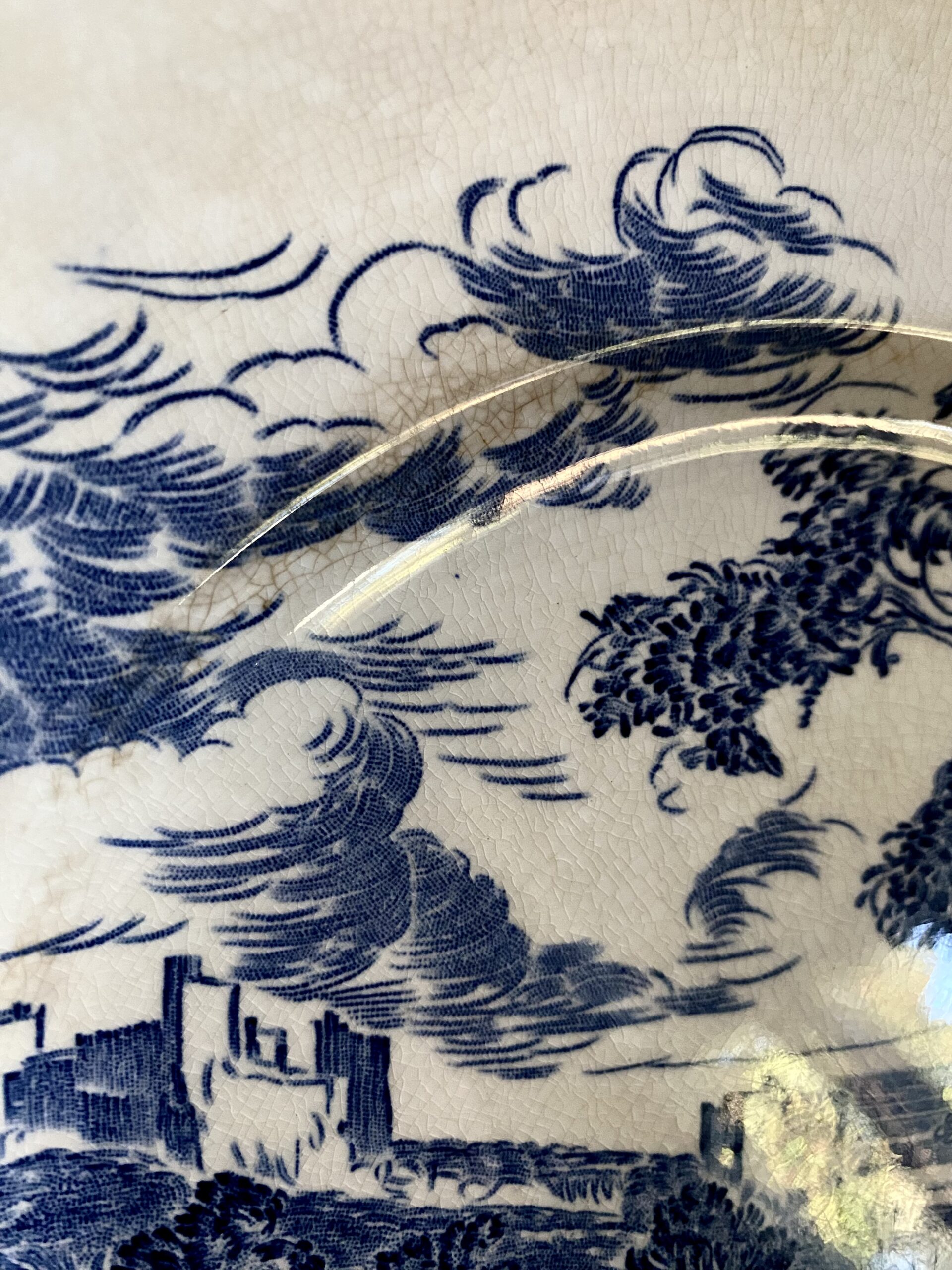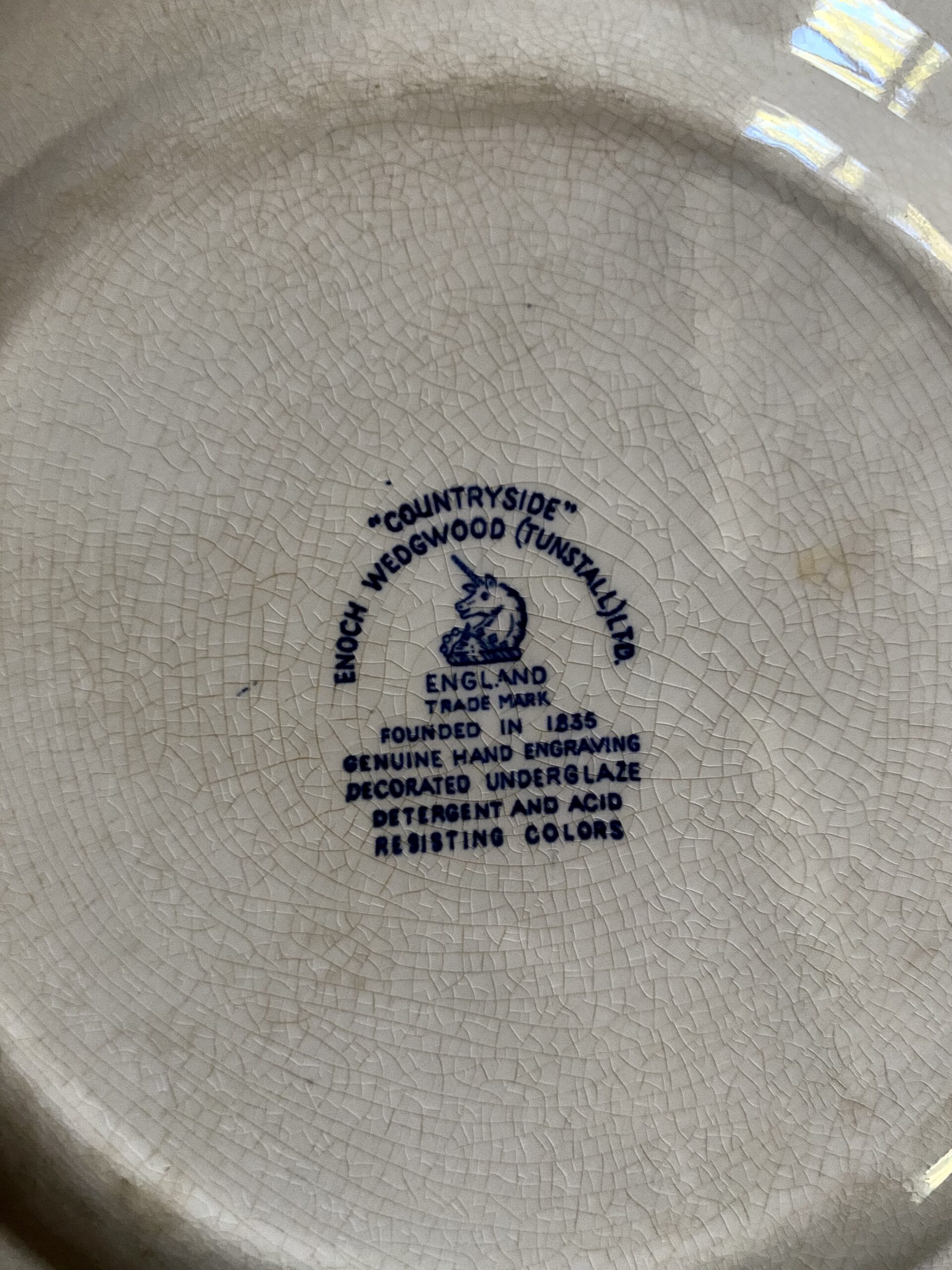 Blue and white, genuine hand engraved (not transferware). Enoch Wedgewood, England, “Countryside” pattern. Dates to the 1960’s. Features a landscape with castle and bridge. Has a 10″ diameter. Beautiful for a plate wall!