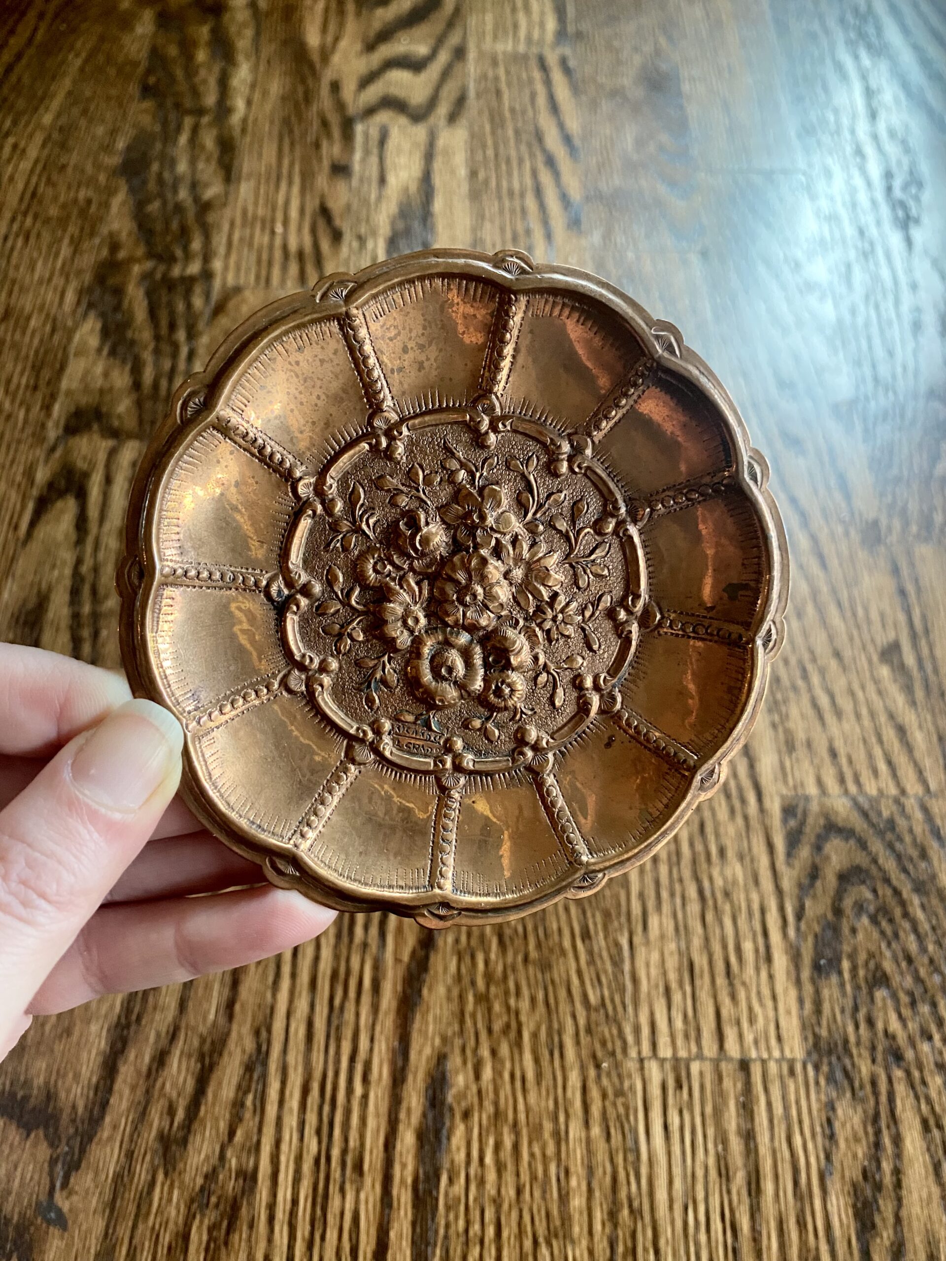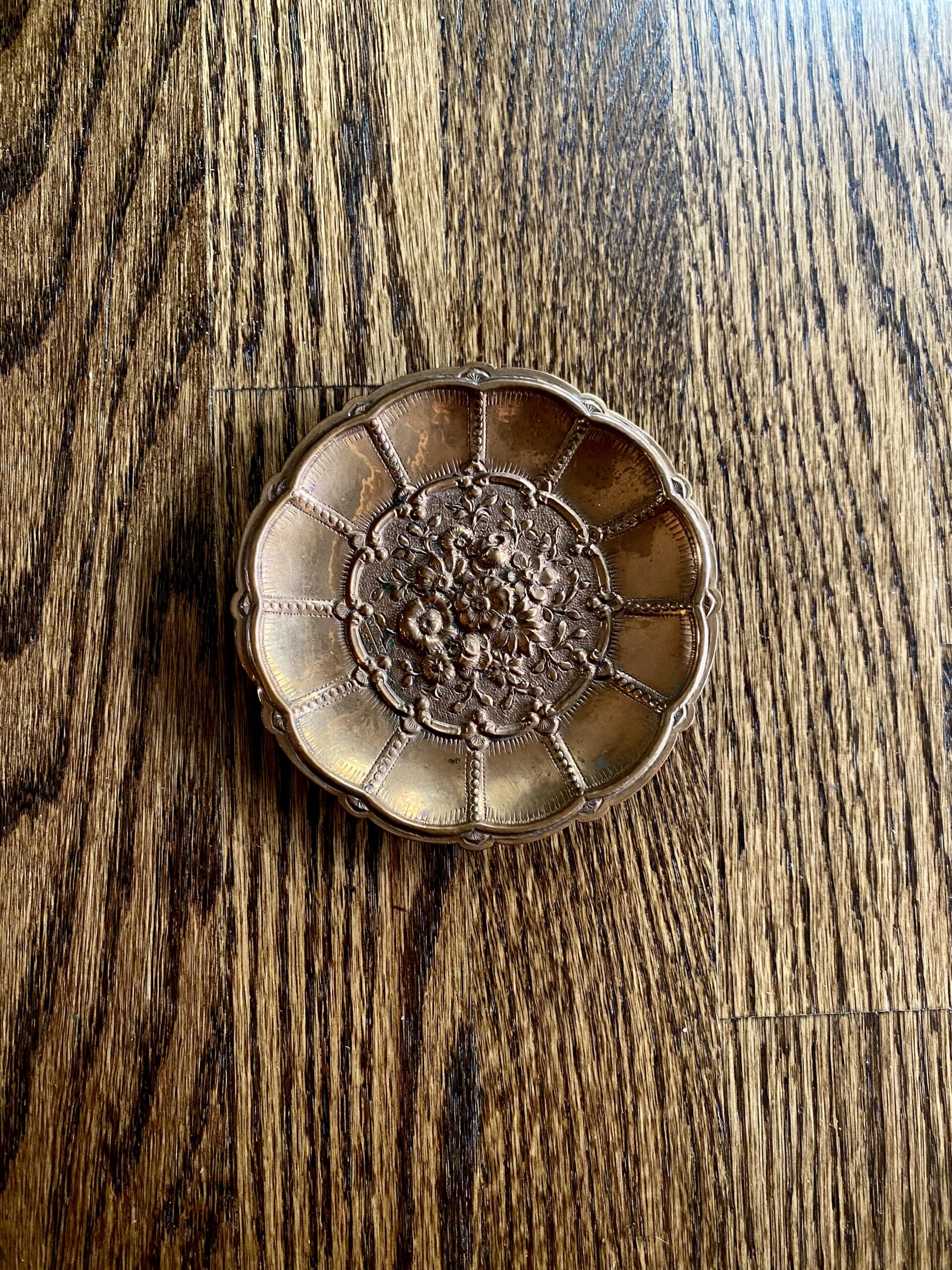 Mini repousse copper, decorative trinket dish. Has beautiful floral design. Would look great on a coffee table, to hold matches, desk to hold paper clips or small accessories , or kitchen or bath as soap dish. Could also use on a nightstand to hold rings. Very versatile, pretty piece. Measures just under 4.5″ wide.