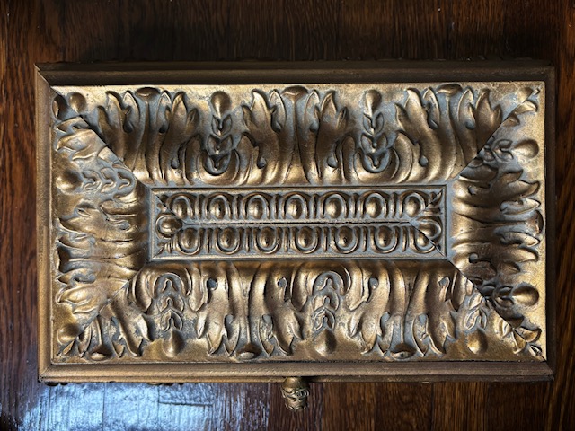 Wood and composite decorative gold box with black velvet lining. Beautiful carved details and measures 16.5” x 11”